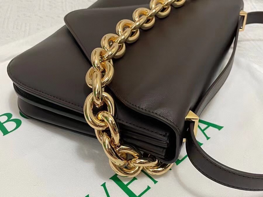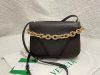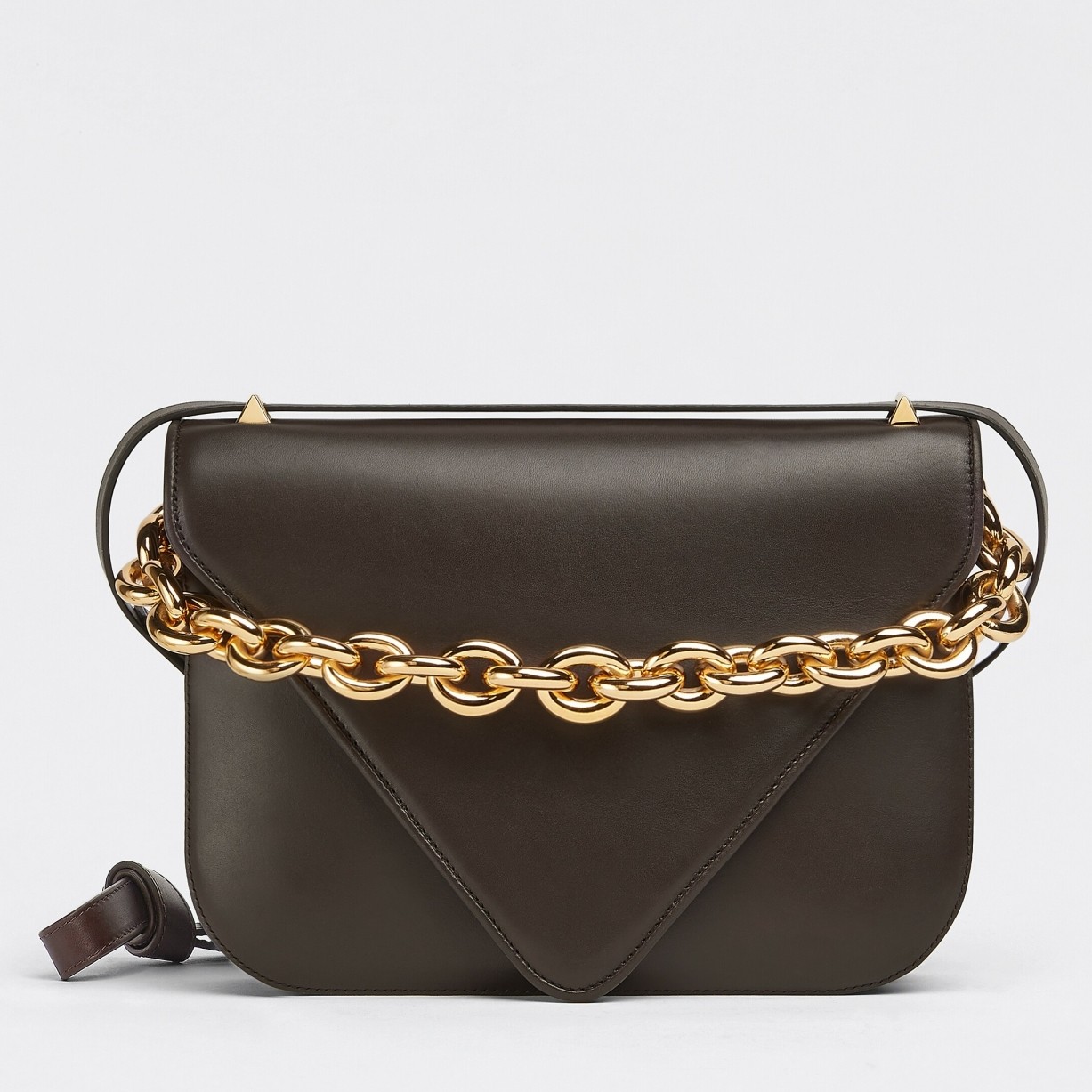 The Mount from Bottega Veneta is part of a family of bags that has acquired must-have status in fashion insider circles. This particular design features the now-signature golden chainlink strap and pointed foldover flap. In terms of practicality, it’s made from smooth calfskin leather, and is equipped with a detachable strap for shoulders and cross-body.