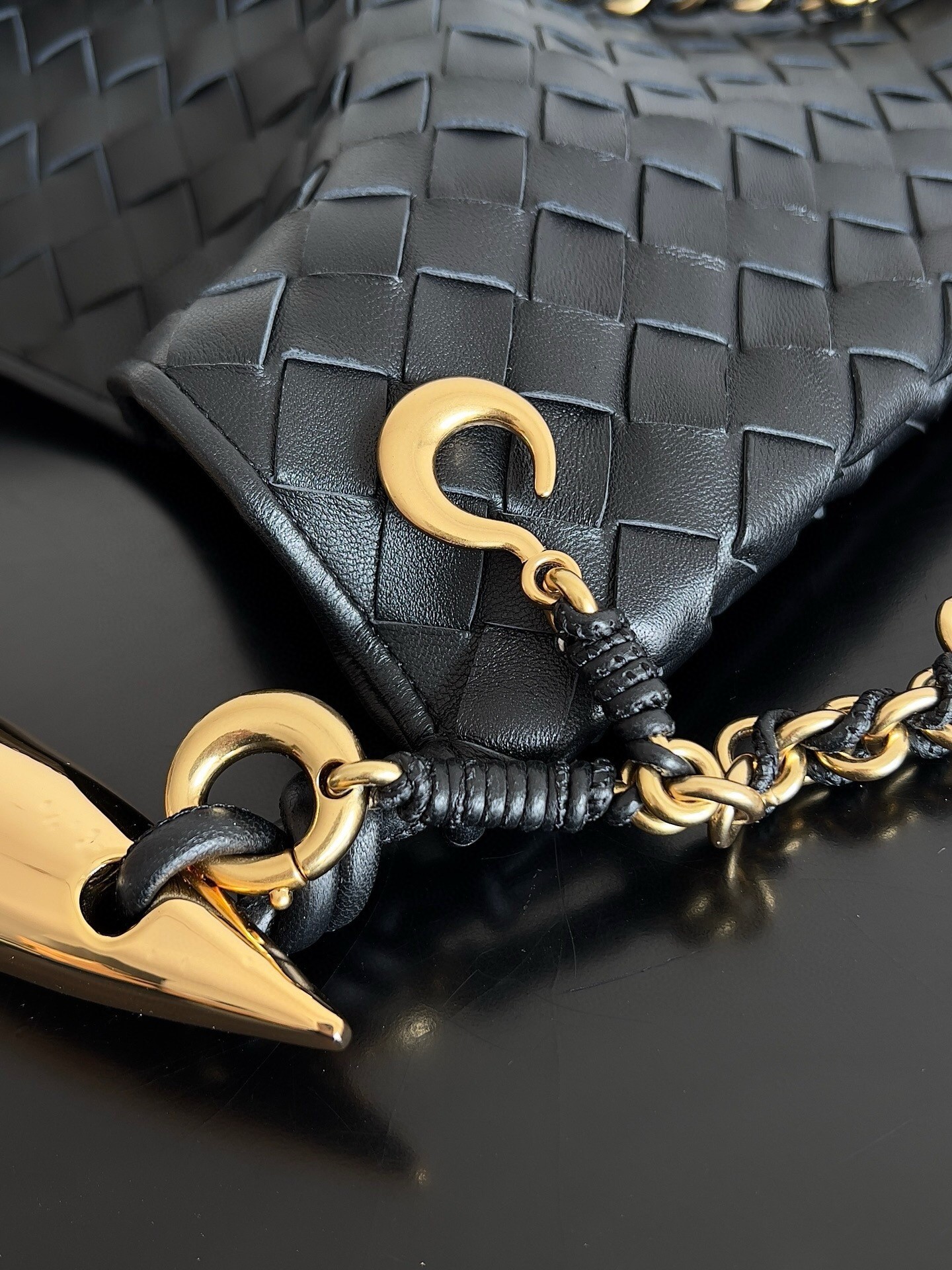 – Leather braided shoulder chain with 35 cm drop