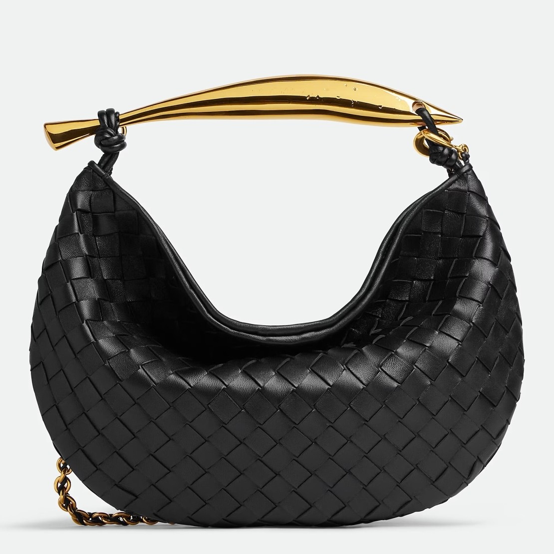 Bottega Veneta’s Sardine bag just keeps getting better. The latest intrecciato version comes in lambskin with a slouchy silhouette and braided chain. The name, of course, comes from the playful, fish-shaped handle ?C match your jewelry to its gold-tone.