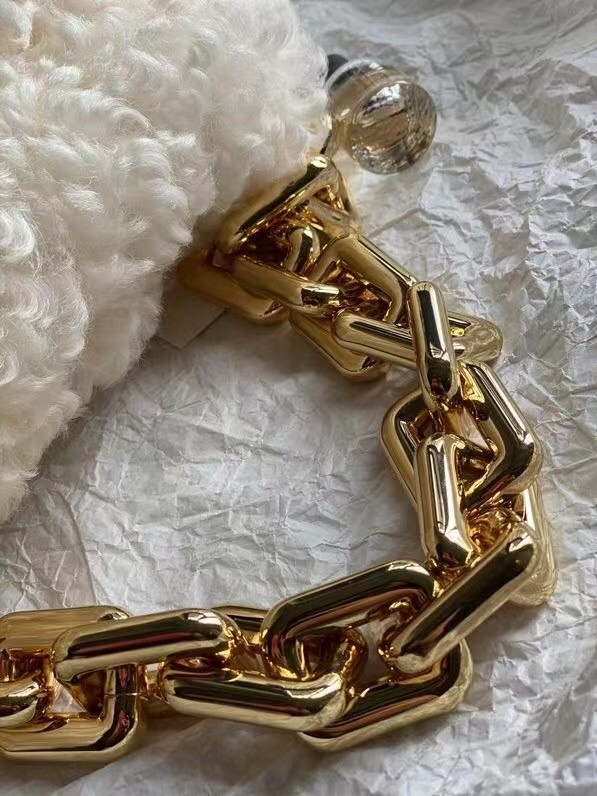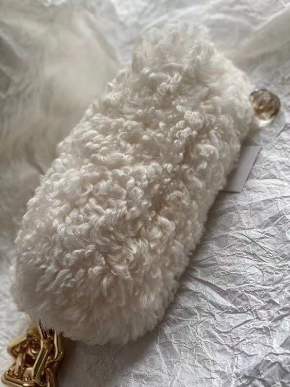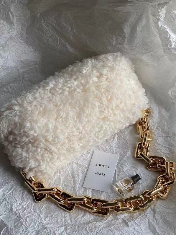 Bottega Veneta’s The Chain Pouch proves what a beautiful combination fluffy shearling and glossy hardware can be. It fastens magnetically at the top and opens to reveal a smooth leather lining. The square-link strap can be worn on the shoulder, attached at one side as a statement wristlet or removed altogether.