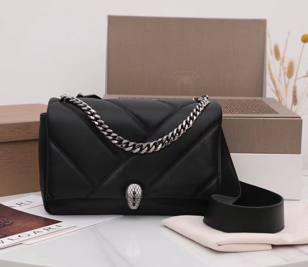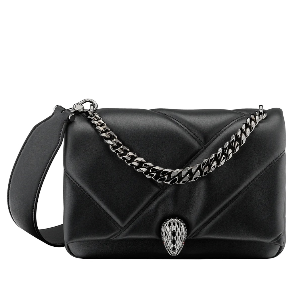 Made of a captivating combination between a large graphic motif and bold metal details, this “Serpenti Cabochon” crossbody bag is ready to enlarge the Serpenti universe with its sophisticated and functional design, featuring a contemporary style. The geometric maxi matelassé pattern, inspired by the sinuous surface of cabochon-cut gemstones, enhances the extreme softness of the calf leather of the bag’s core. The model is enhanced by a new ruthenium-plated version of the Serpenti head closure in dark brass, which takes inspiration from a Bvlgari heritage watch from the 1960s, with small black onyx scales in the middle and red enamel eyes.