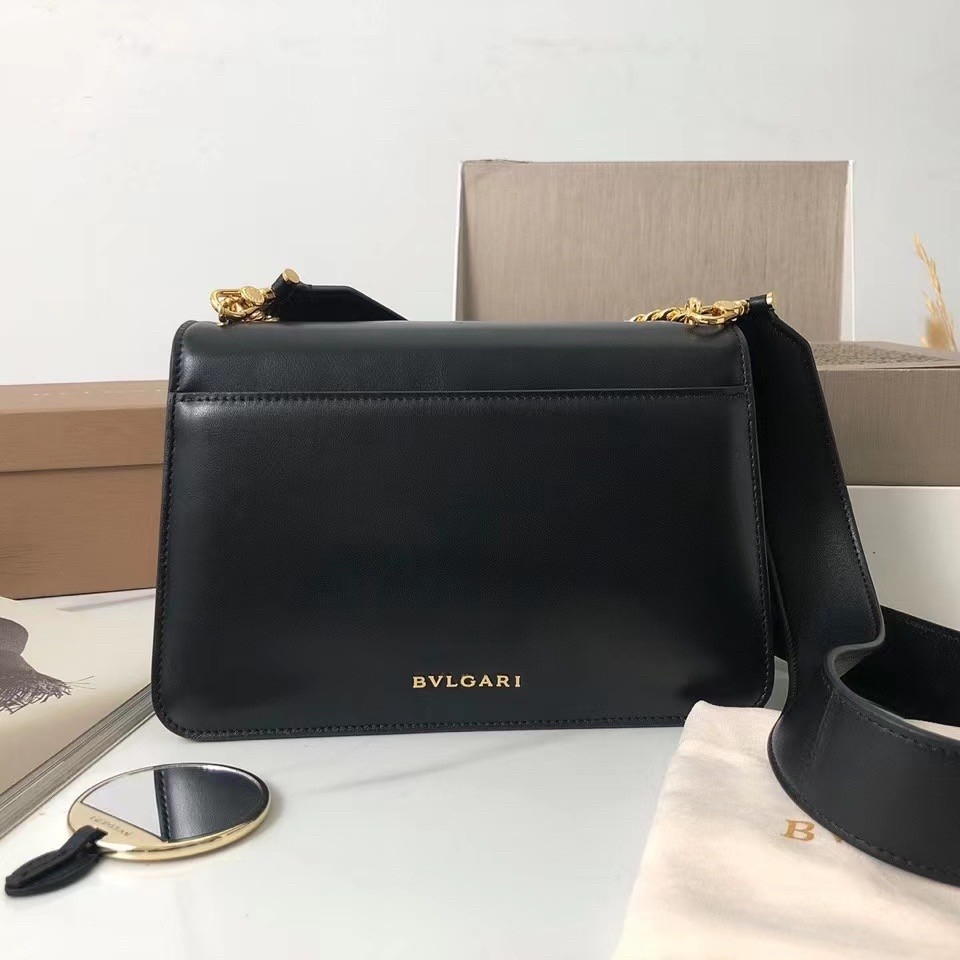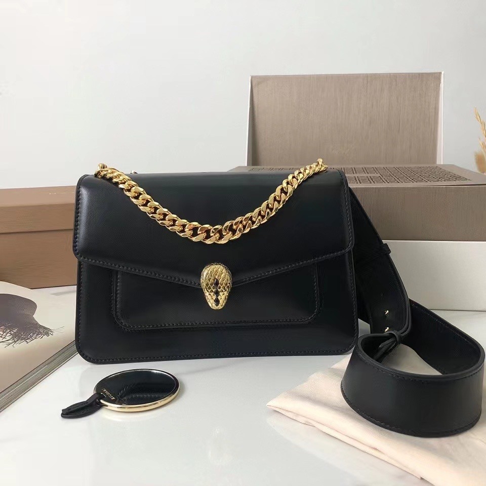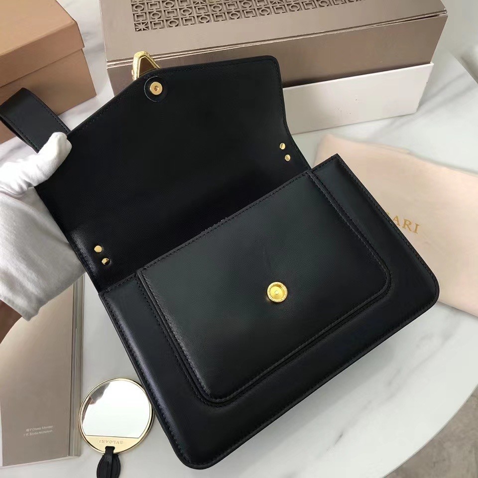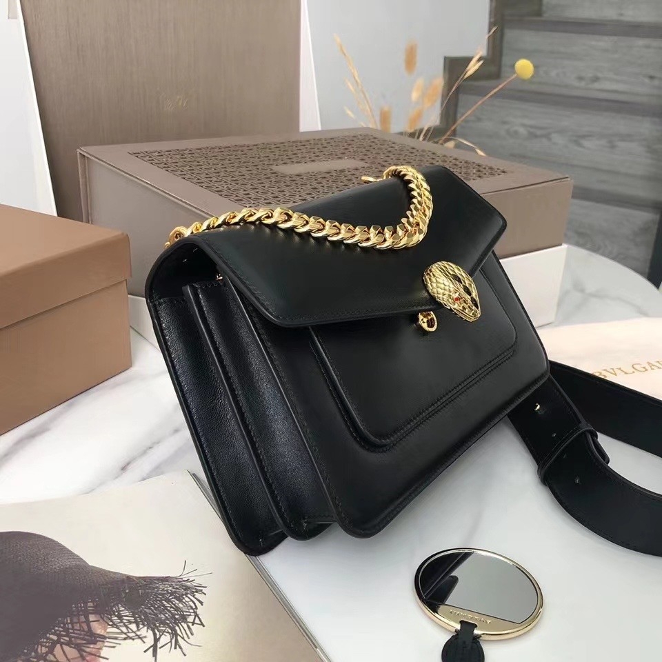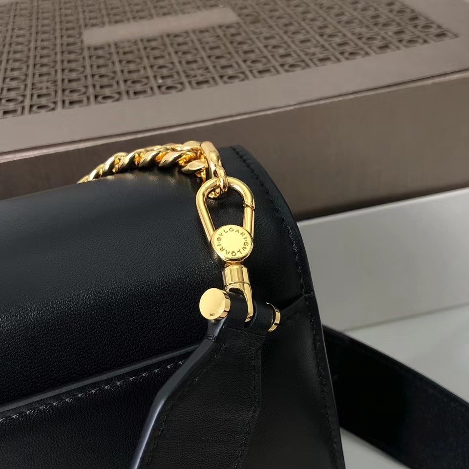 The “Serpenti Forever” family welcomes a new crossbody bag featuring a more contemporary shape and daily attitude. Crafted in soft black nappa leather, this maxi chain bag features gold-plated brass hardware. The model is adorned with a new interpretation of the Serpenti head closure in gold-plated brass, taking inspiration from a Bvlgari heritage watch from the 1960s, with small black onyx scales in the middle, and red enamel eyes. Evoking our jewellery-making DNA, an iconic Bvlgari chain adorns the flap like a necklace, also suitable as a refined handle.