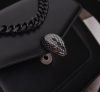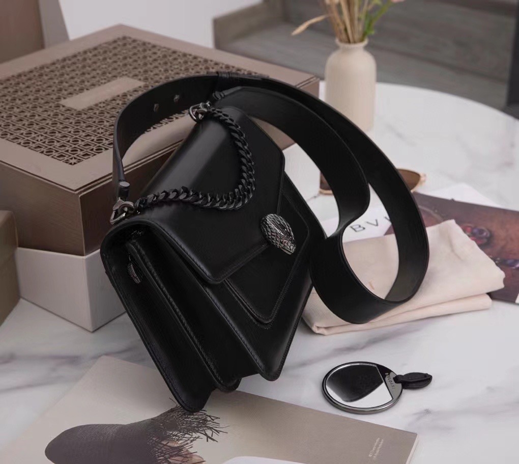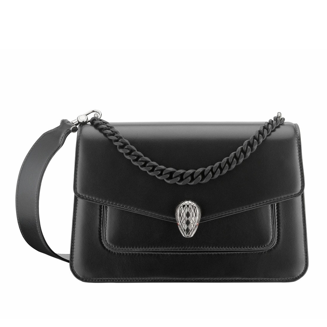 The “Serpenti Forever” family welcomes a new crossbody bag featuring a more contemporary shape and daily attitude. Crafted in soft black nappa leather, this maxi chain bag features dark ruthenium-plated brass hardware. The model is enhanced by a new ruthenium-plated version of the Serpenti head closure in dark brass, which takes inspiration from a Bvlgari heritage watch from the 1960s, with small black onyx scales in the middle and red enamel eyes. In keeping with the jeweller’s DNA, a tone-on-tone iconic Bvlgari chain adorns the flap like a collier, also suitable as a refined handle.