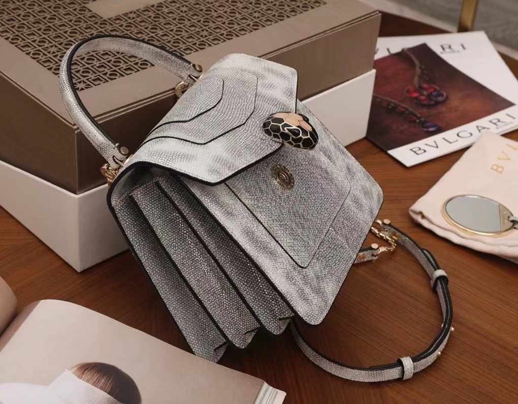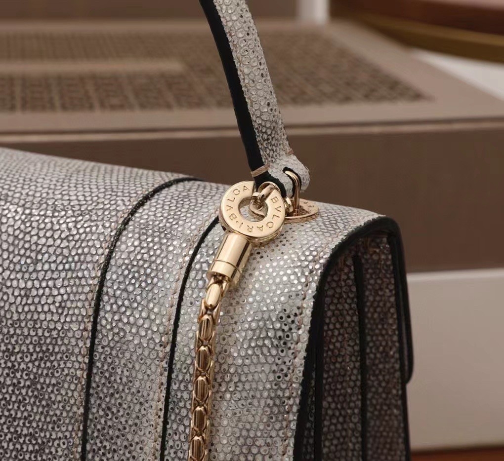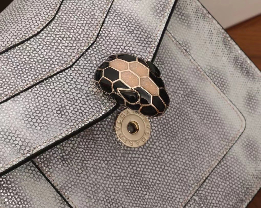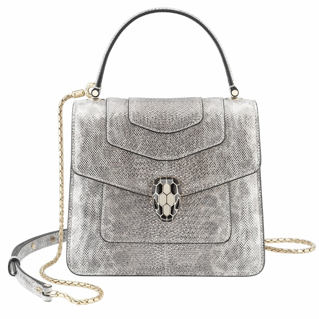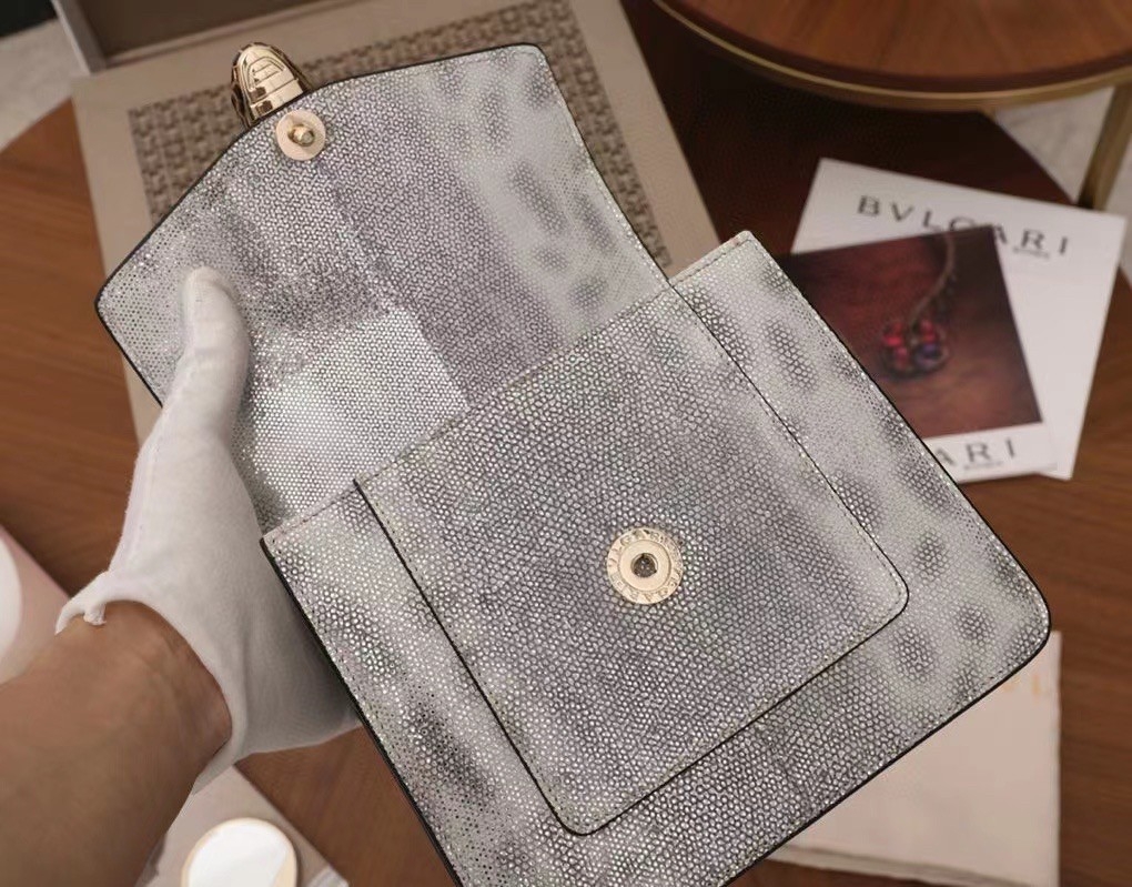 The “Serpenti Forever ” crossbody bag is tinged with new sophisticated nuances for the upcoming season. Crafted in precious white agate metallic karung skin, this model features light gold brass plated hardware. The iconic snakehead closure hypnotises with black and white agate enamel and seductive eyes in black onyx.