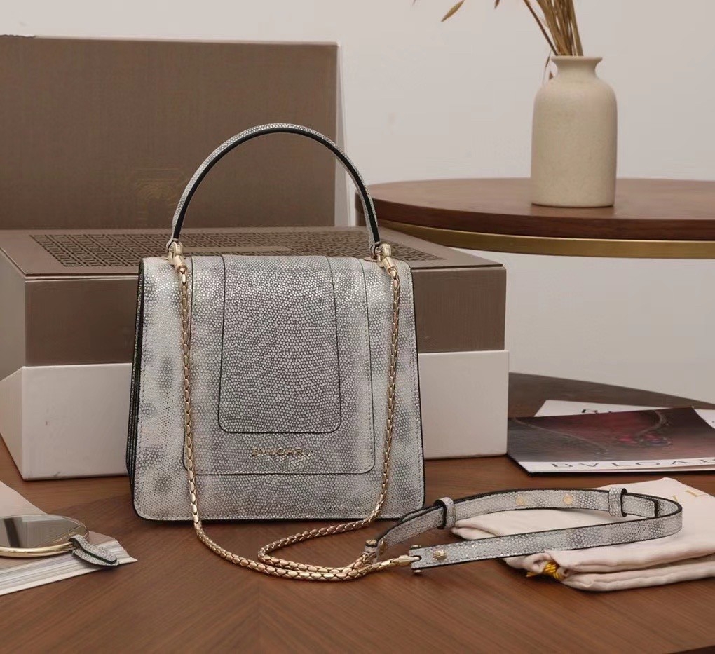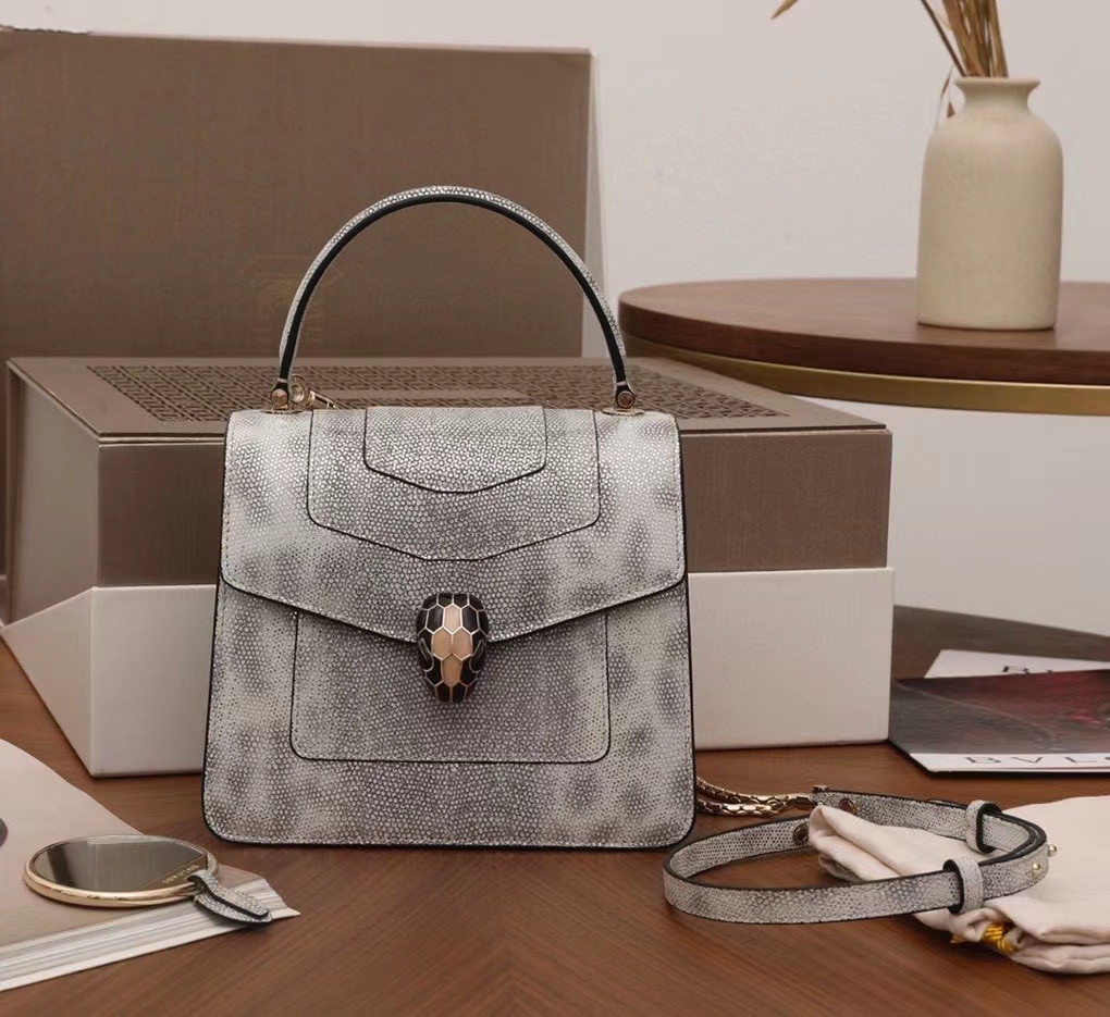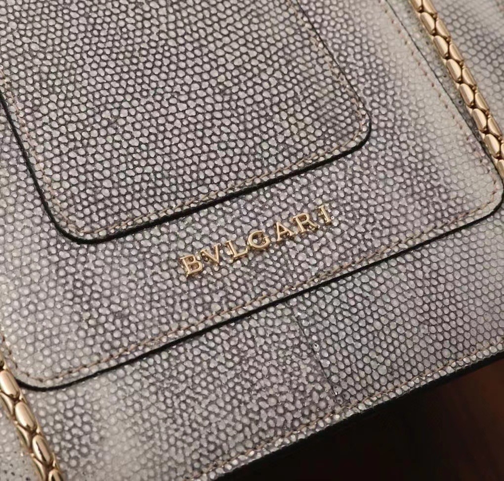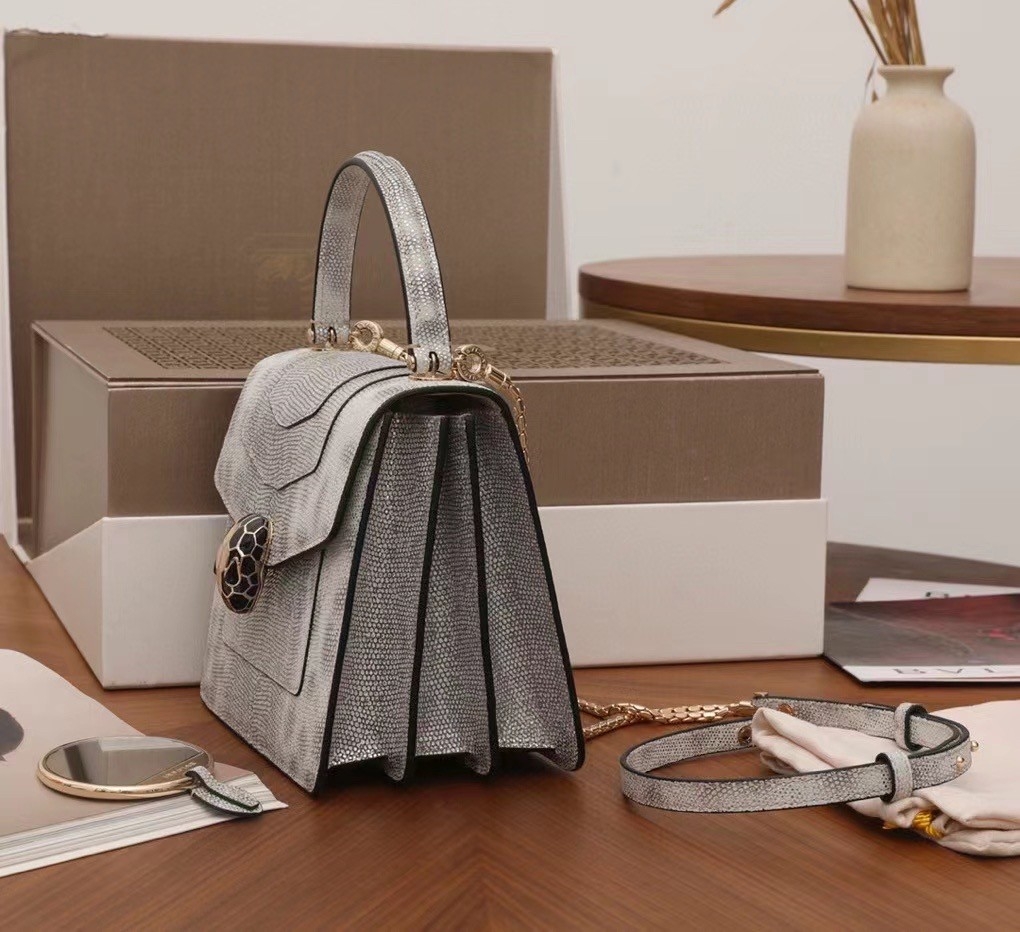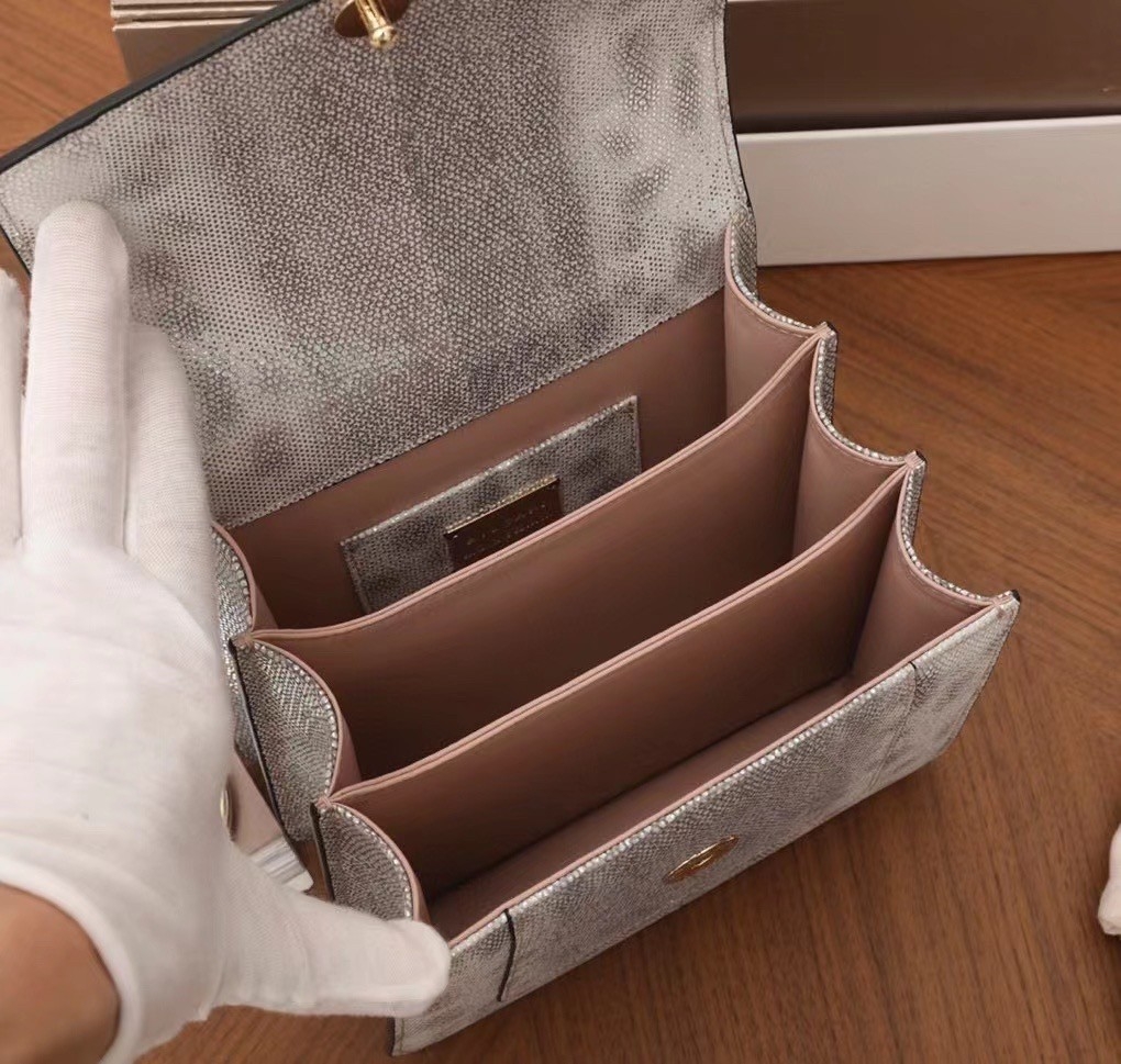 The “Serpenti Forever ” crossbody bag is tinged with new sophisticated nuances for the upcoming season. Crafted in precious white agate metallic karung skin, this model features light gold brass plated hardware. The iconic snakehead closure hypnotises with black and white agate enamel and seductive eyes in black onyx.