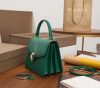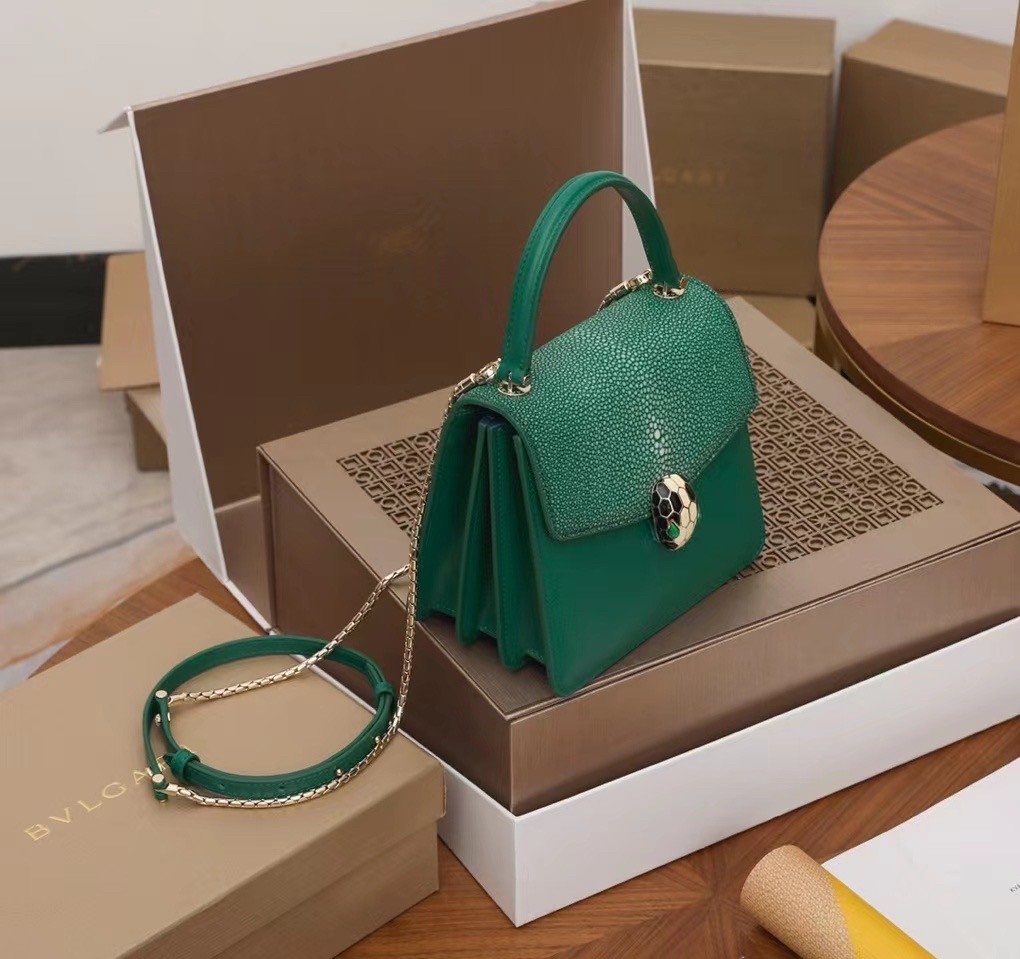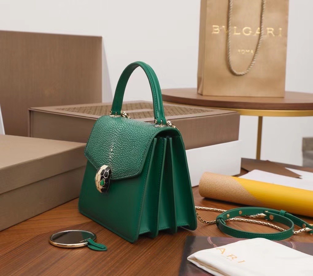 Flap cover bag Serpenti Forever in emerald green galuchat skin and emerald green calf leather. Brass light gold plated hardware and snake head closure in black and white enamel with eyes in green malachite. Top handle model featuring three gussets, with adjustable and removable snake-body shaped chain and leather strap.