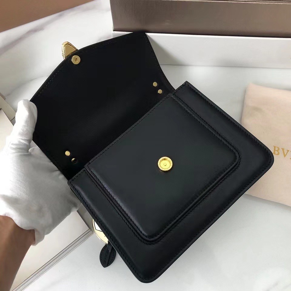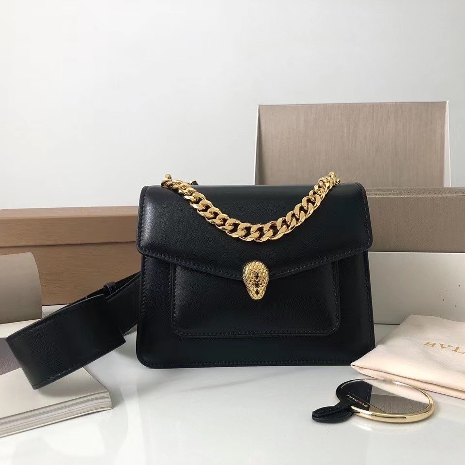 The “Serpenti Forever” family welcomes a new crossbody bag featuring a more contemporary shape and everyday attitude. Crafted in soft black nappa leather, this maxi chain bag features gold-plated brass hardware. The model is adorned with a new interpretation of the Serpenti head closure in gold-plated brass, taking inspiration from a Bvlgari heritage watch from the 1960s, with small black onyx scales in the middle, and red enamel eyes. Evoking our jewelry-making DNA, an iconic Bvlgari chain adorns the flap like a necklace, also suitable as a refined handle.