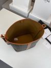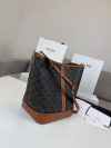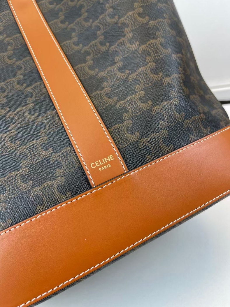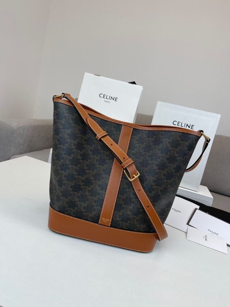 Trimmed in calfskin leather, this medium Triomphe Canvas Bucket Bag is a piece from the Celine collection. Embellished with a textile lining, this accessory, which features delicate golden finishes such as the House’s iconic logo on the front, has a snap fastening and an adjustable leather shoulder strap for cross-body or shoulder wear.