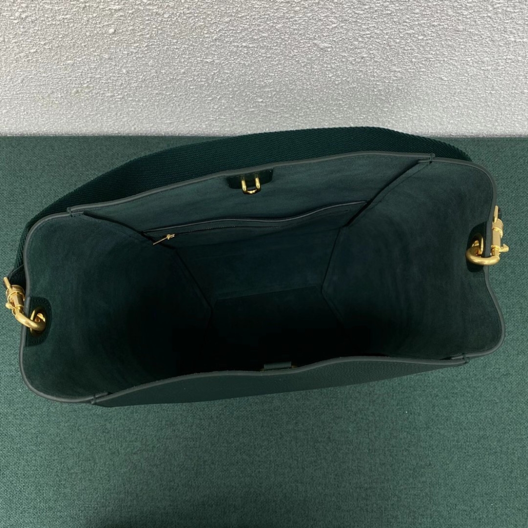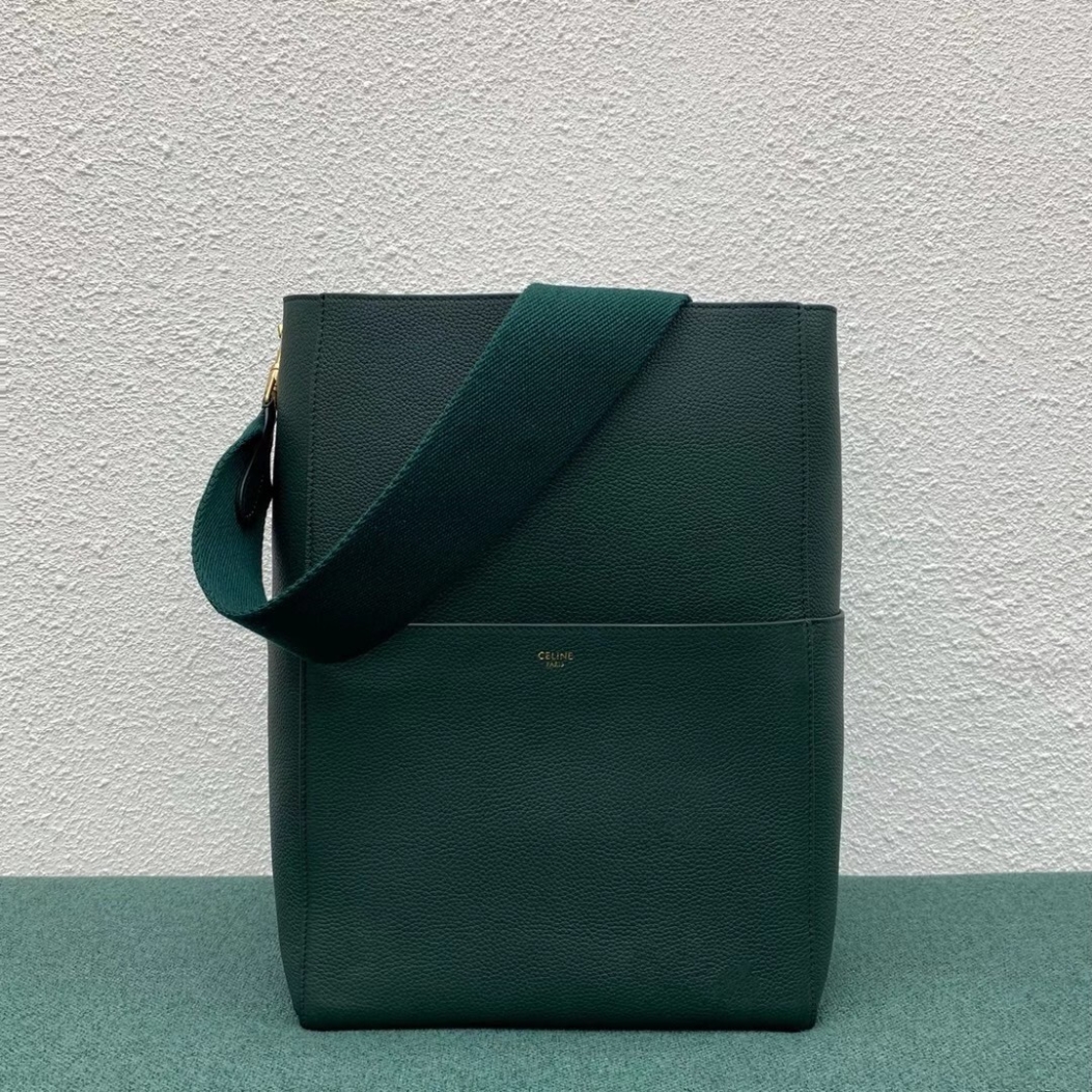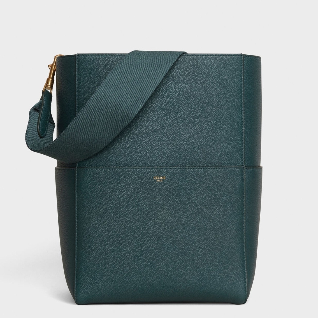 Probably not one of the most popular Celine bags, the Celine Seau Sangle shoulder bag is one of the most recent successes of the house, with more and more fashionistas channeling it around in their daily lives. Structured and soigné, this Celine bag has it all, namely an oversized hook-and-eye clasp closure, a detachable canvas shoulder strap, and numerous exterior pockets.