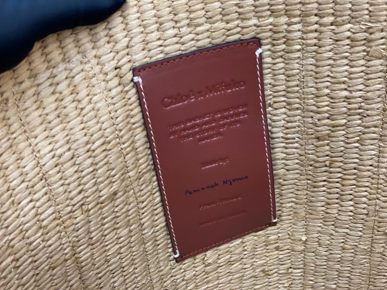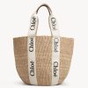 Crafted in a timeless basket shape for an effortless summer mood, this large Woody basket is hand-woven from partly upcycled materials by independent craftswomen in Kenya. Echoing the Maison’s Woody mule, the line’s Chloé logo ribbon details the natural fiber for graphic contrast and a signature touch. The bottom of the basket is protected by a Chloé-embossed round leather patch for durability.