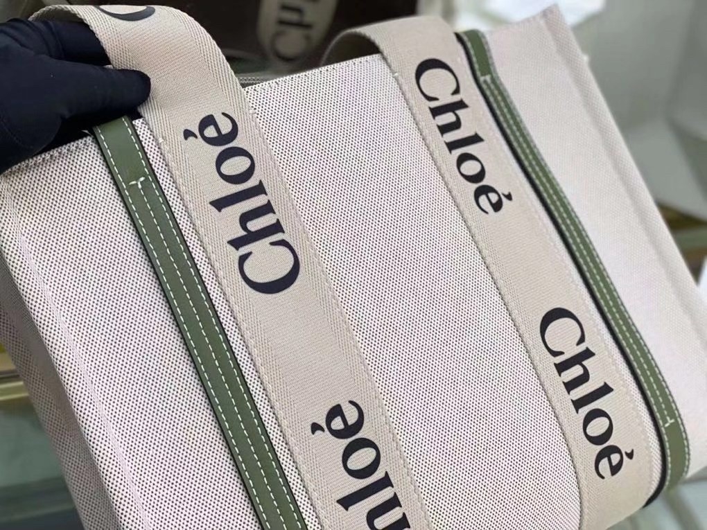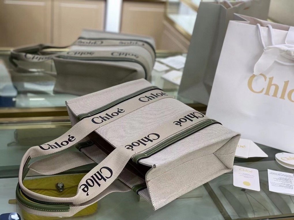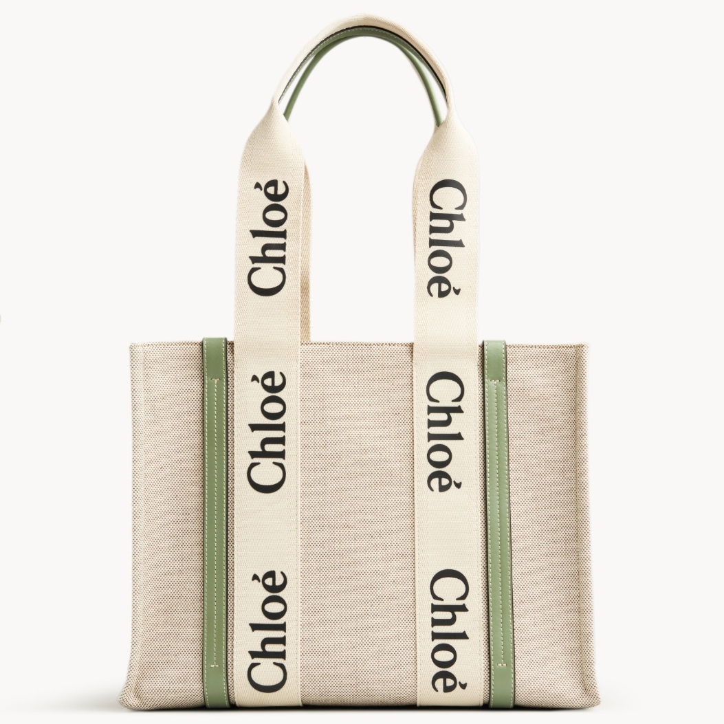 Chloe Medium Woody Tote Bag in Canvas with Green Leather Strips