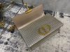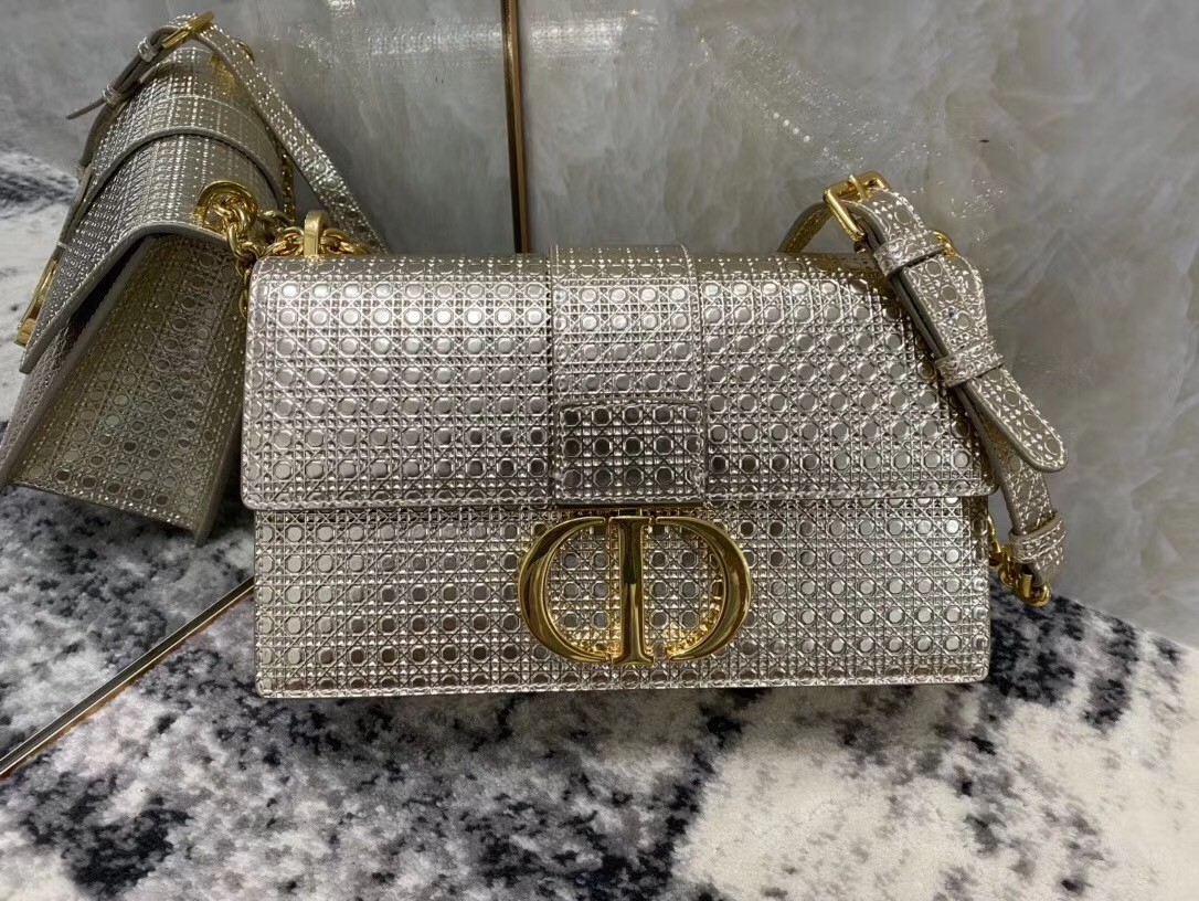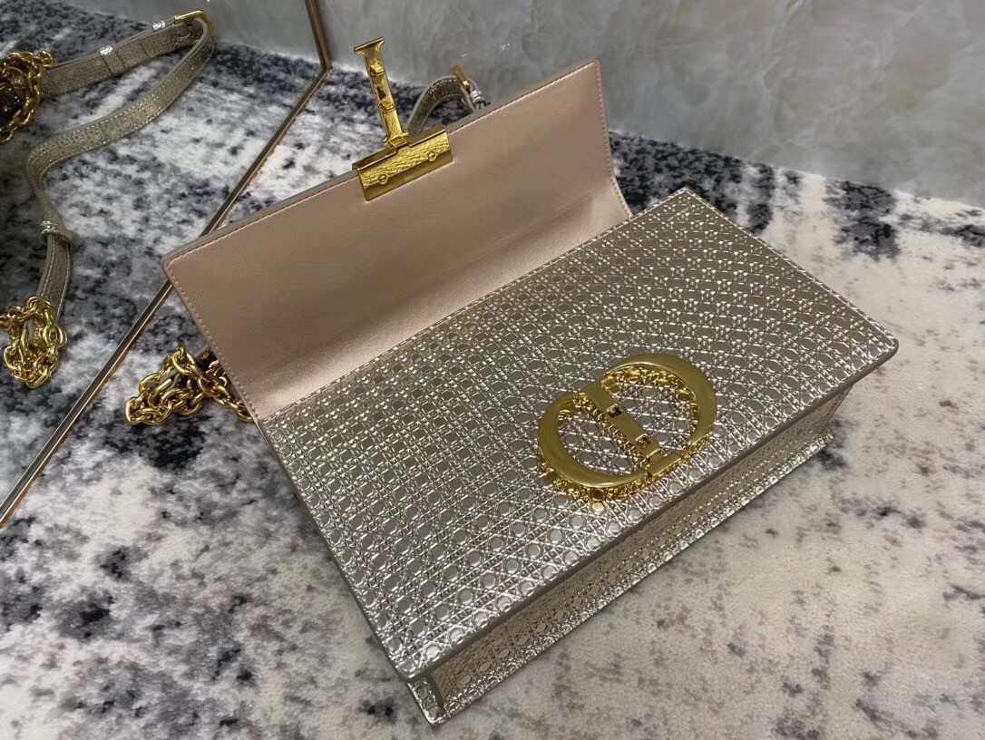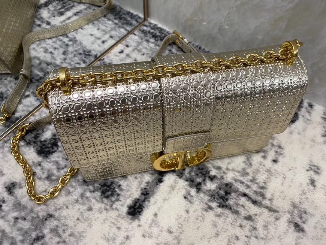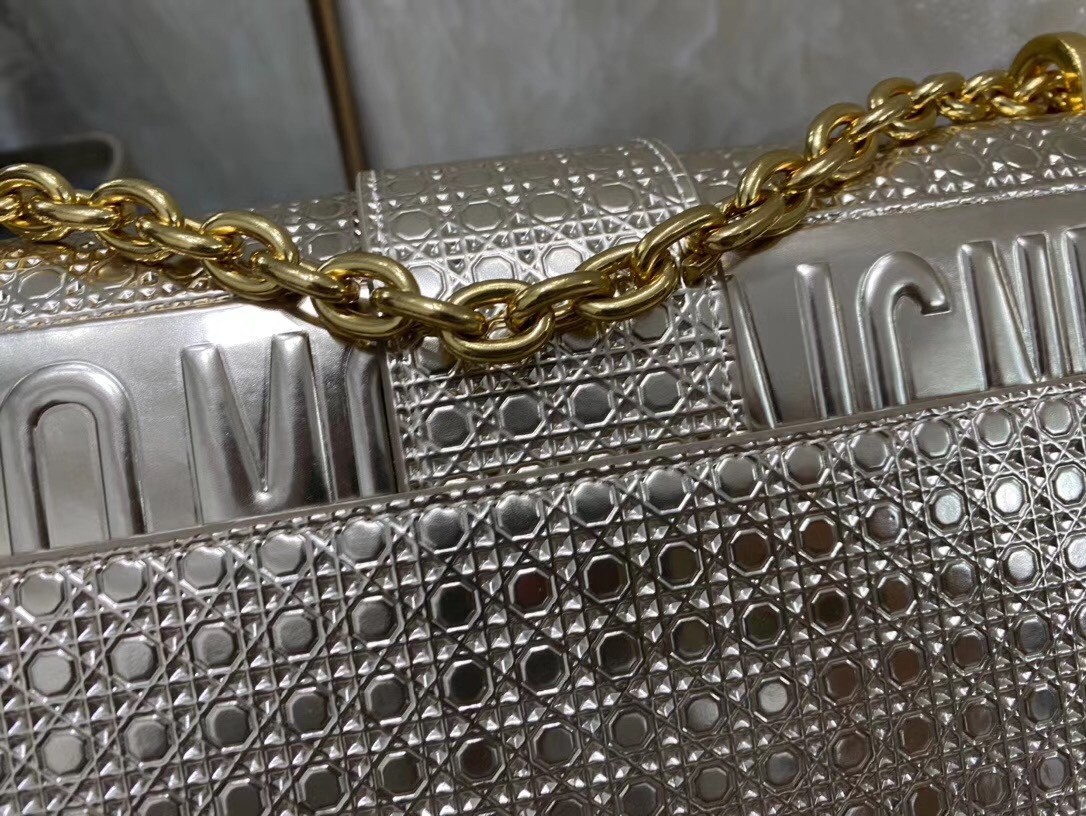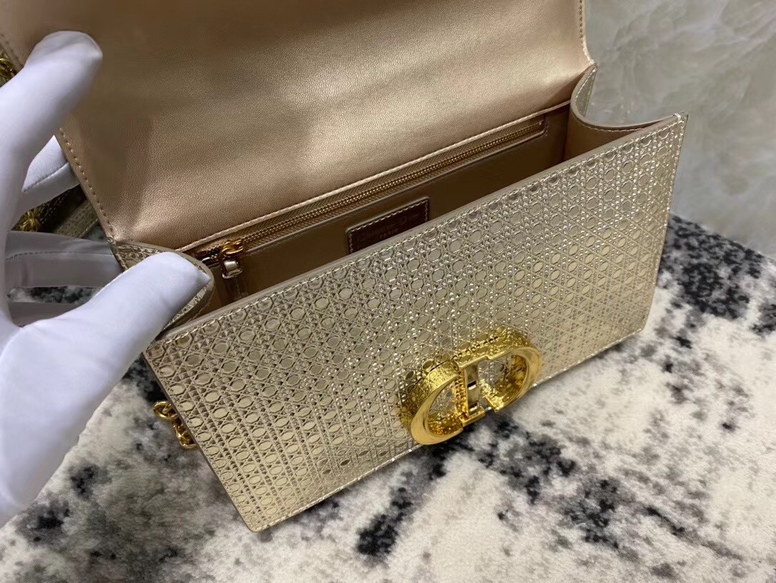 The 30 Montaigne line, inspired by the historic, emblematic address, presents essential pieces that portray the iconic codes of the House. This handbag is crafted in metallic gold calfskin imprinted with Microcannage texture for an elegant and timeless look. The flap is embellished with a pale gold-finish metal ‘CD’ clasp, inspired by the seal of a Christian Dior perfume bottle. Refined details such as an embossed ’30 Montaigne’ signature on the back highlight the sleek design.