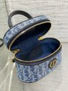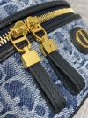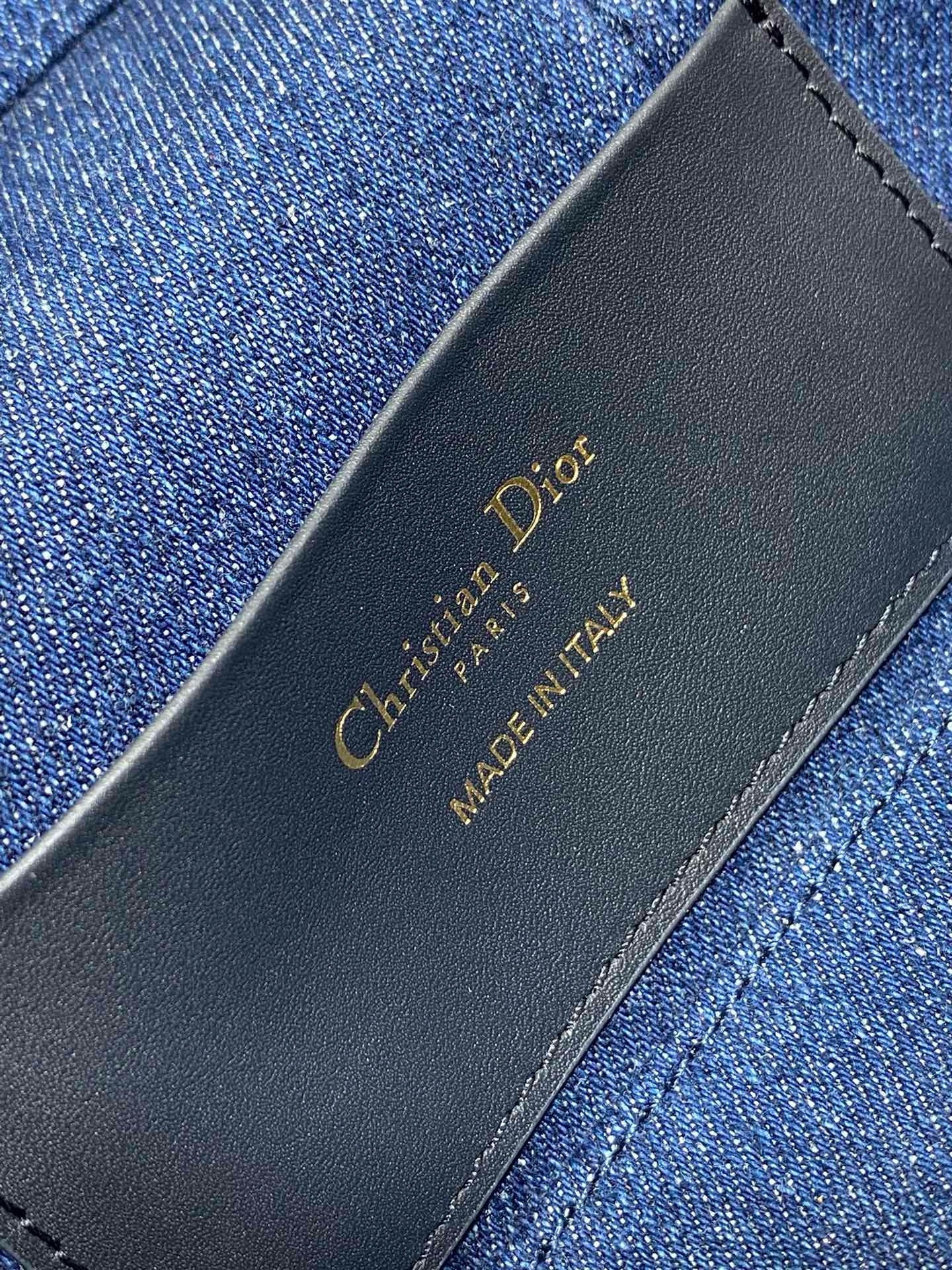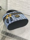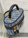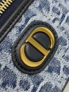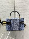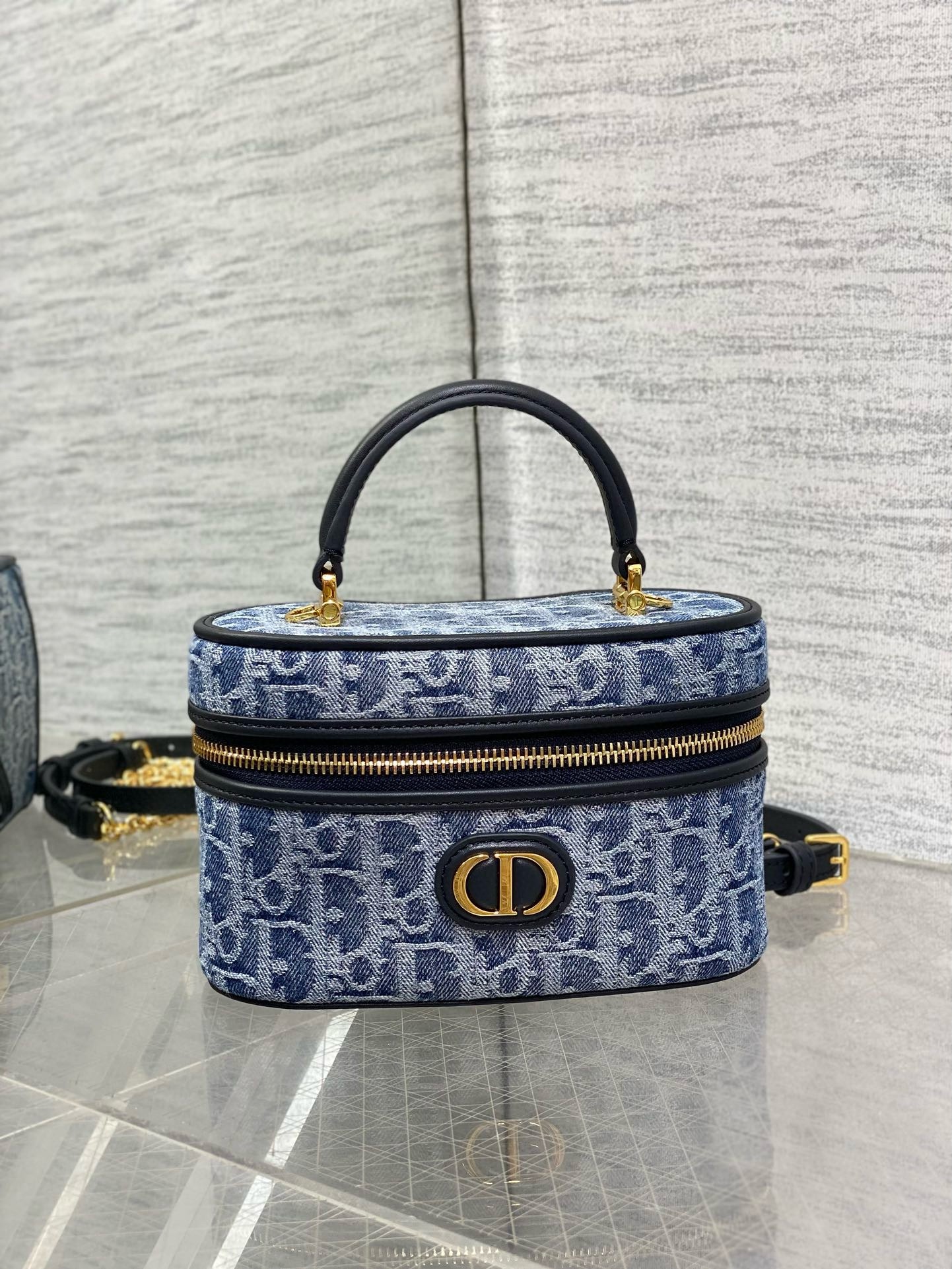 The 30 Montaigne mini vanity case expands the line with a compact design that is both functional and refined. Constructed in blue denim Dior Oblique jacquard, it is accented by a CD signature on the front. The vanity case will accommodate all the essentials and is completed by an interior pocket and mirror. It can be carried by hand with the handle or worn over the shoulder or crossbody using the adjustable shoulder strap that alternates between gold-finish metal and blue enamel links with a leather insert for added comfort.