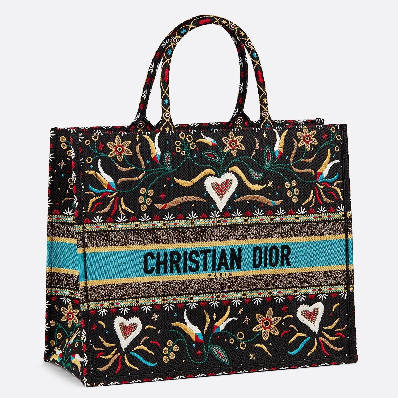 A multicolored flowers and hearts spread its wings across this Dior Book Tote bag. Designed to be carried in the hand or, thanks to the length of its handles, worn over the shoulder, this House essential is the picture of easy elegance. The interior comes with a large main compartment for all your daily essentials and more.