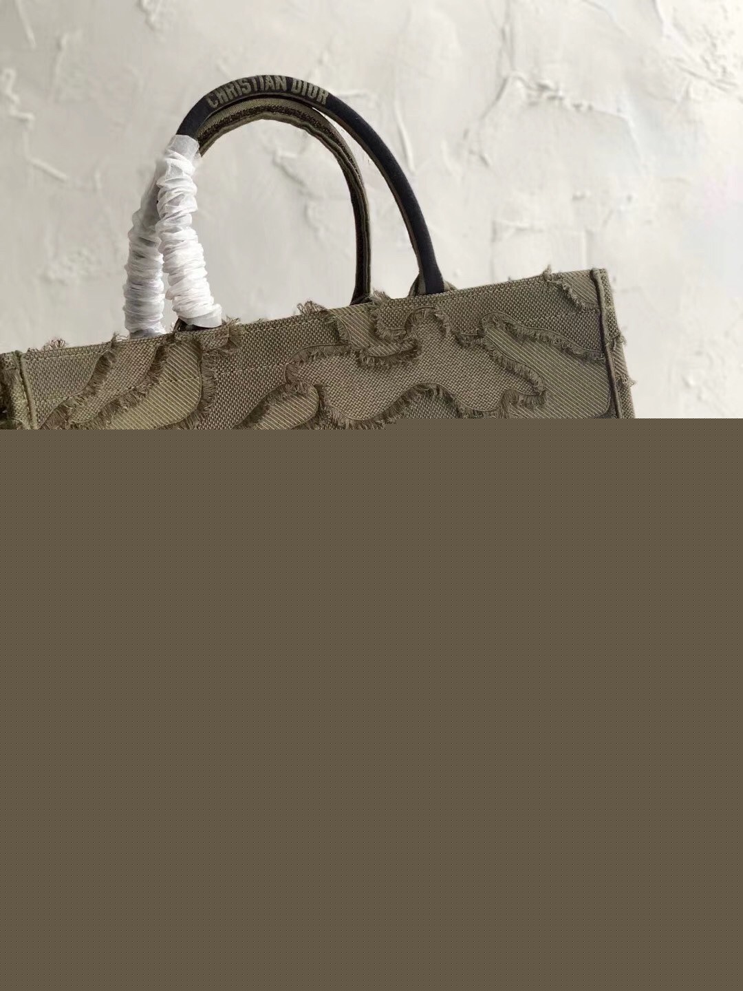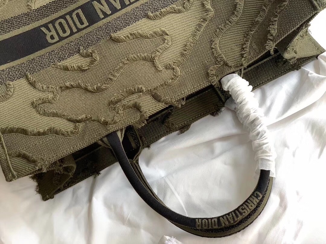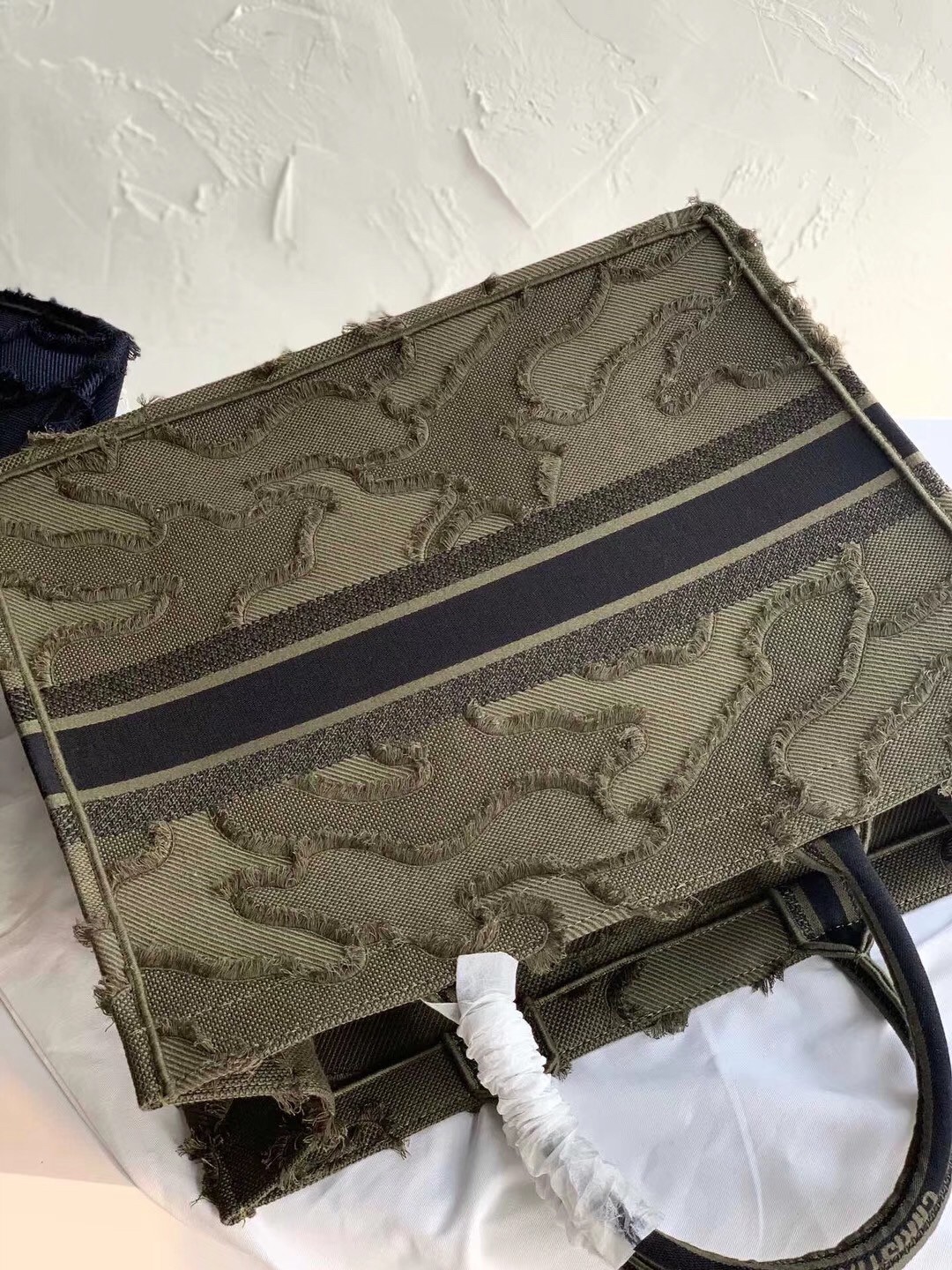 The Dior Book Tote, an original style introduced by Dior’s creative director Maria Grazia Chiuri, has become a staple of the Maison’s aesthetic. Ideally designed to carry all your day’s essentials, the large bag is made of fully embroidered khaki canvas and portrays a hand-cut fringed embroidery for a camouflage effect, with the “Christian Dior” signature on the front. This carryall may be worn with other accessories from the Camouflage line and is a perfect example of the Dior savoir-faire.