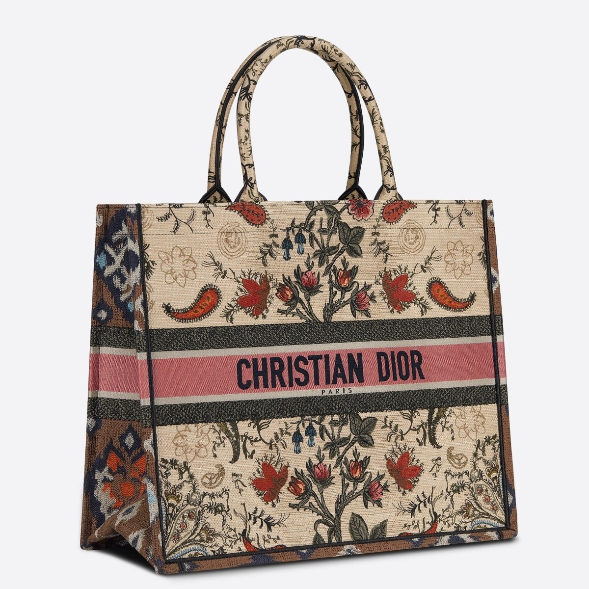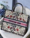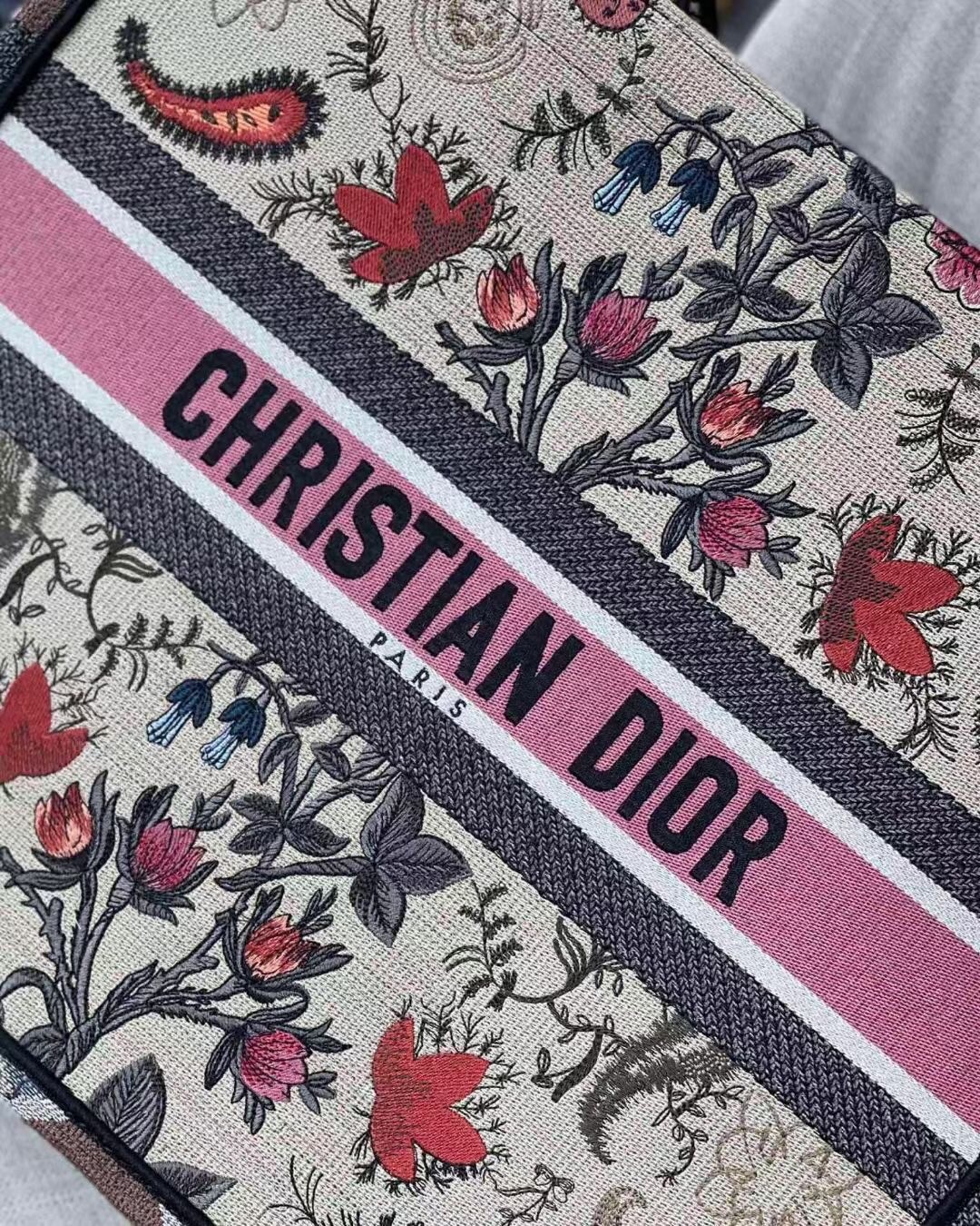 The Dior Book Tote, an original style introduced by Creative Director Maria Grazia Chiuri, has become a staple of the Dior aesthetic. Designed to carry all the daily essentials, the silhouette is fully embroidered with the multicolor Dior Flowers motif. The carryall boasts a ‘Christian Dior’ signature on the front while the sides are adorned with a graphic motif for a contrasting modern touch. The bag is a prime example of Dior savoir-faire.
