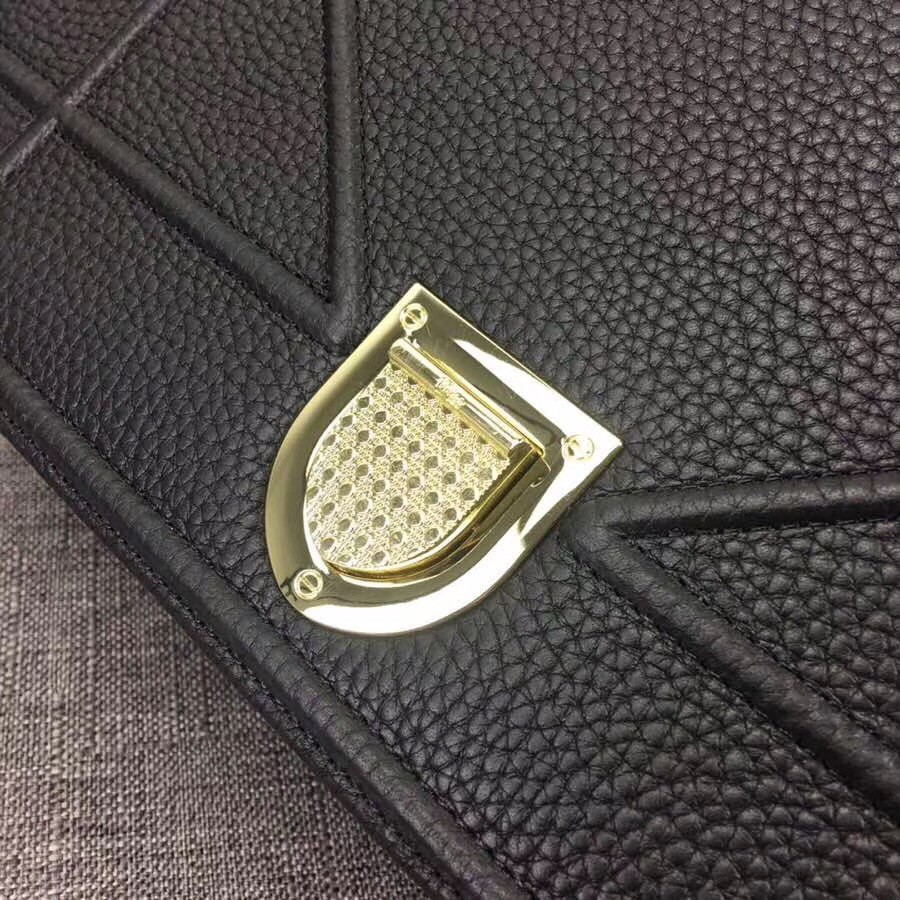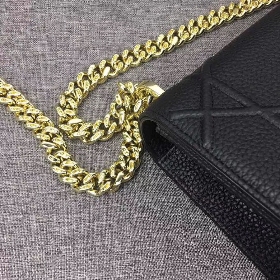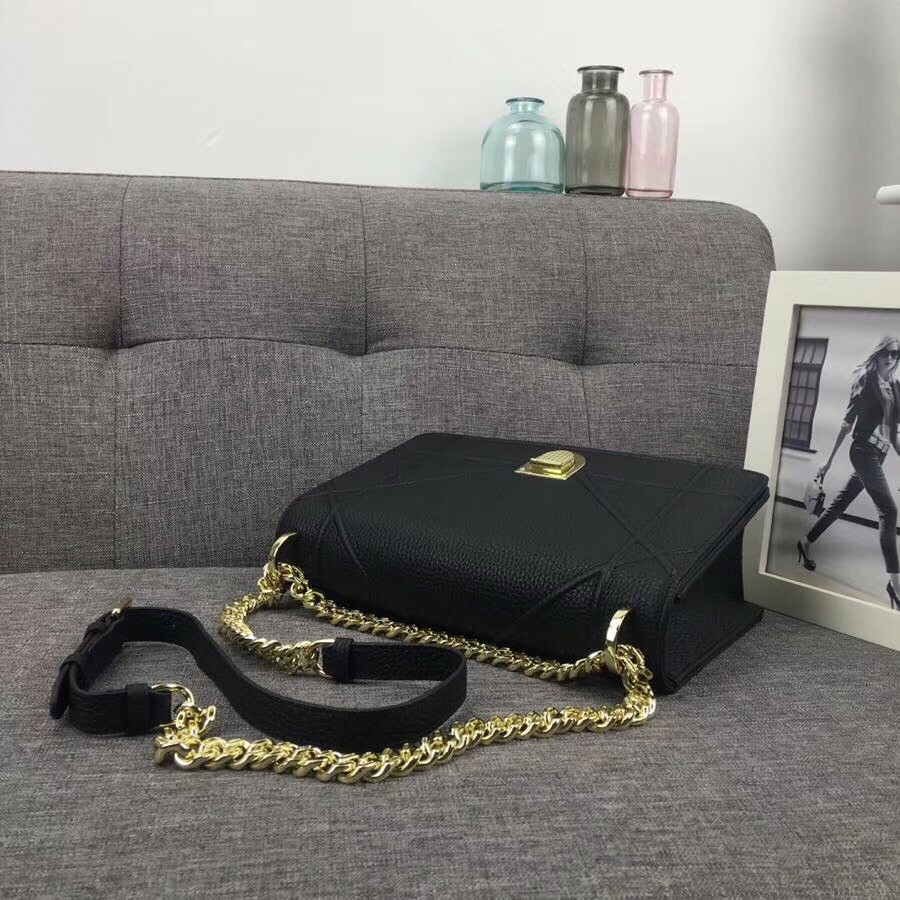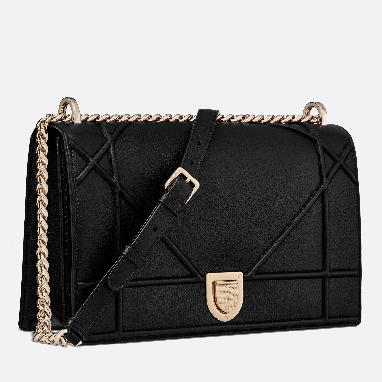 The House of Dior is offering a timeless version of its iconic Diorama bag. Single-tone grained leather is decorated with embossed patterns that have a contemporary feel. Its flap, kept shut by a contrasting metal buckle, opens to reveal a colored interior embellished with a small zippered pocket. You can wear it on the shoulder with its metal chain strap, over a dress or a more relaxed urban outfit.