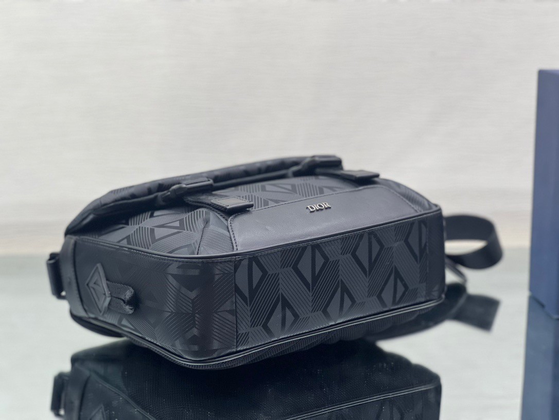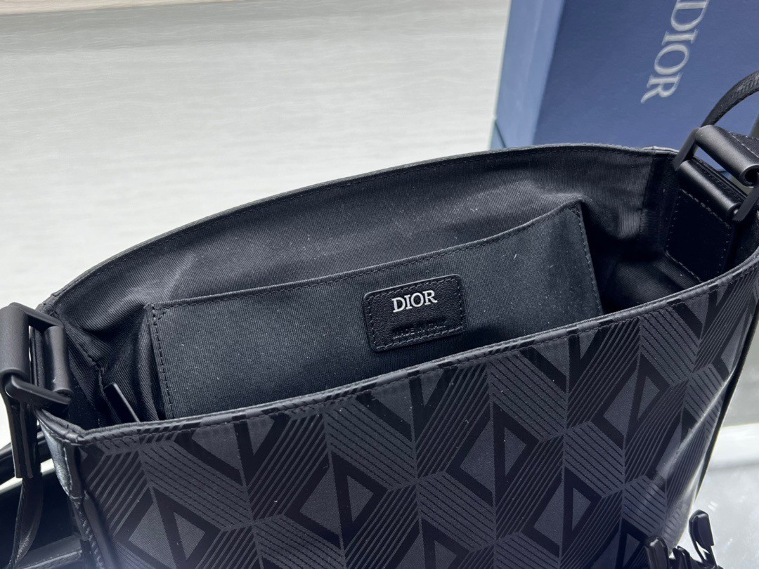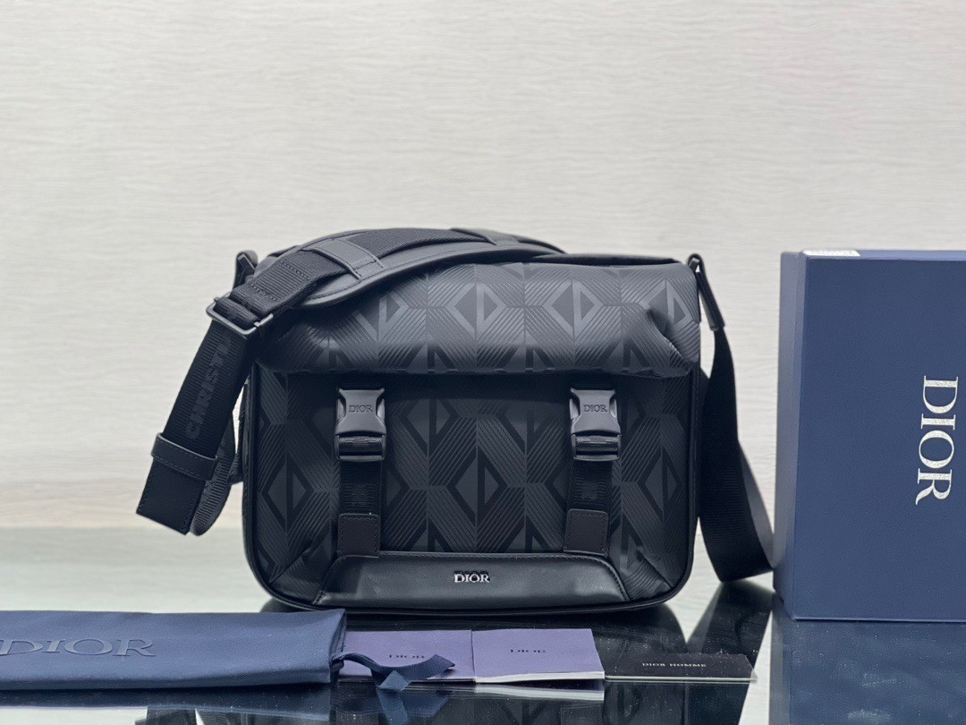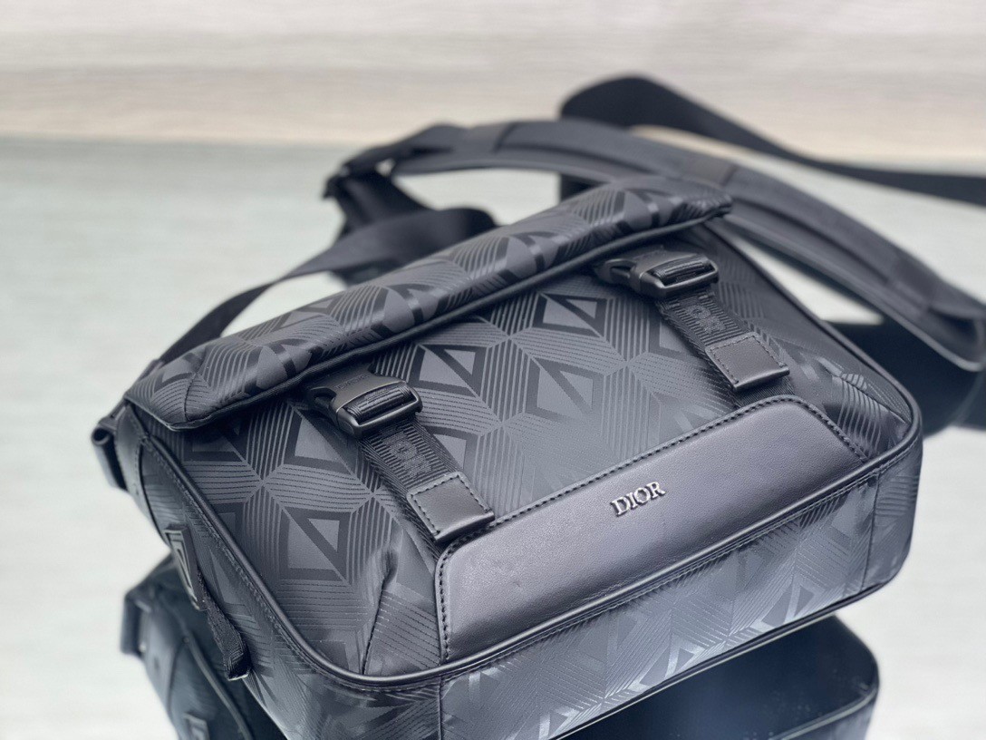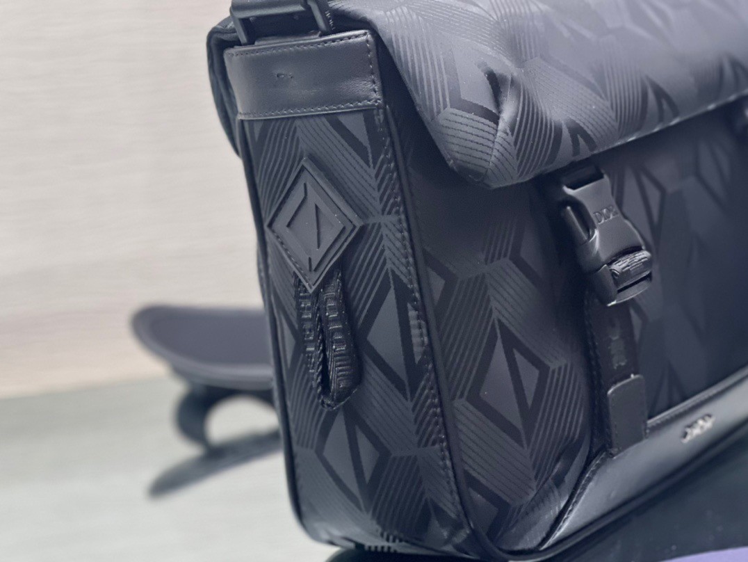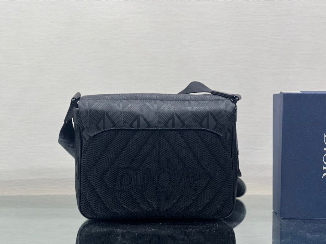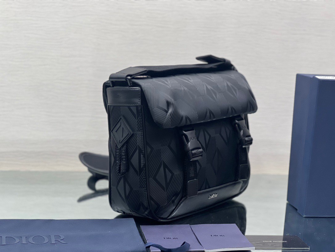 The Dior Explorer bag is inspired by timeless Messenger bag codes revisited in a couture version. Crafted in black CD Diamond Mirage Ski Capsule nylon, it is distinguished by a CD Diamond signature rubber patch on the front. The black grained calfskin flap reveals a zipped pocket, while the main compartment can hold all the essentials. Featuring an adjustable Christian Dior shoulder strap with a padded leather insert, the practical bag will be the finishing touch to all casual outfits.