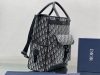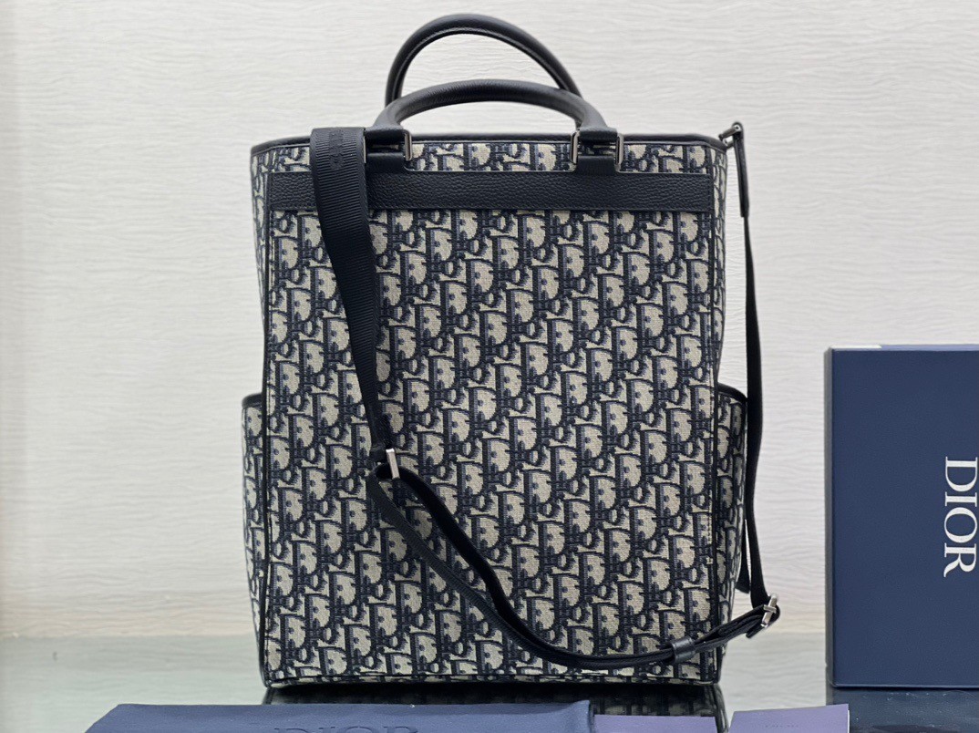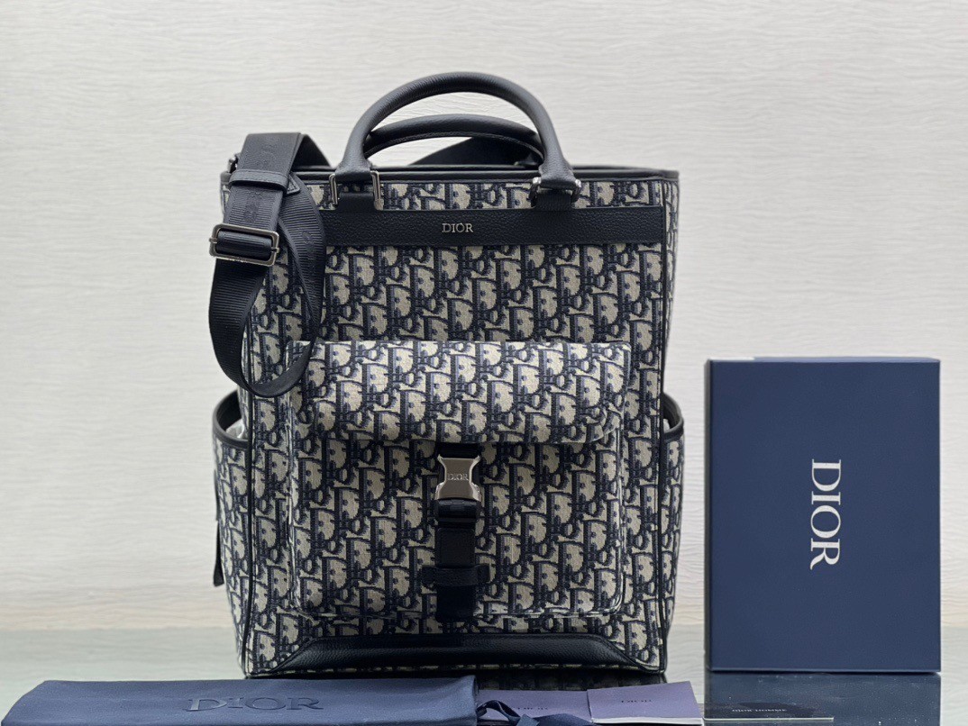 New this season, the tote bag enriches the Dior Explorer line with a functional creation in a couture spirit. Crafted in beige and black Dior Oblique jacquard, it is embellished with black grained calfskin accents and is further distinguished by a ‘DIOR’ leather patch on the side. The spacious main compartment is completed by a padded front flap pocket with an aluminum buckle, as well as two side pockets. Featuring leather handles and an adjustable and removable ‘CHRISTIAN DIOR’ nylon jacquard shoulder strap, the tote will lend the finishing touch to any casual outfit.
