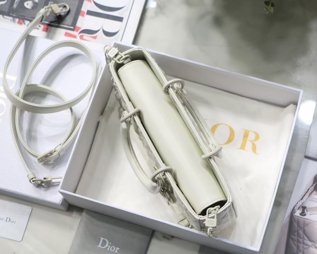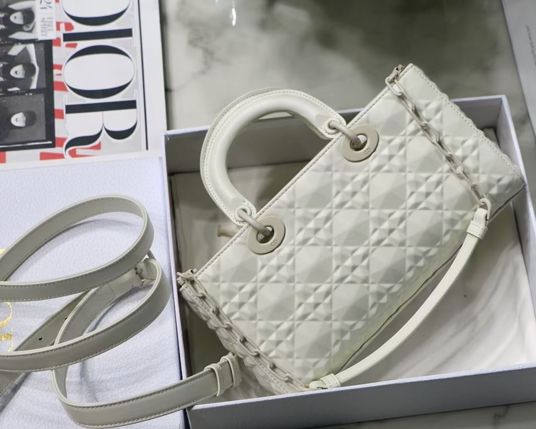 The Lady D-Joy bag captures the House’s vision of elegance and beauty by showcasing the iconic streamlined aesthetic of the Lady Dior line. Crafted in Cannage calfskin featuring a Diamond motif, the refined and timeless style is enhanced by tonal matte metal ‘D.I.O.R.’ charms elegantly embellishing its silhouette. Featuring one removable chain shoulder strap and another adjustable and removable leather shoulder strap, the Lady D-Joy bag can be carried by hand, worn over the shoulder or crossbody as a daily companion.