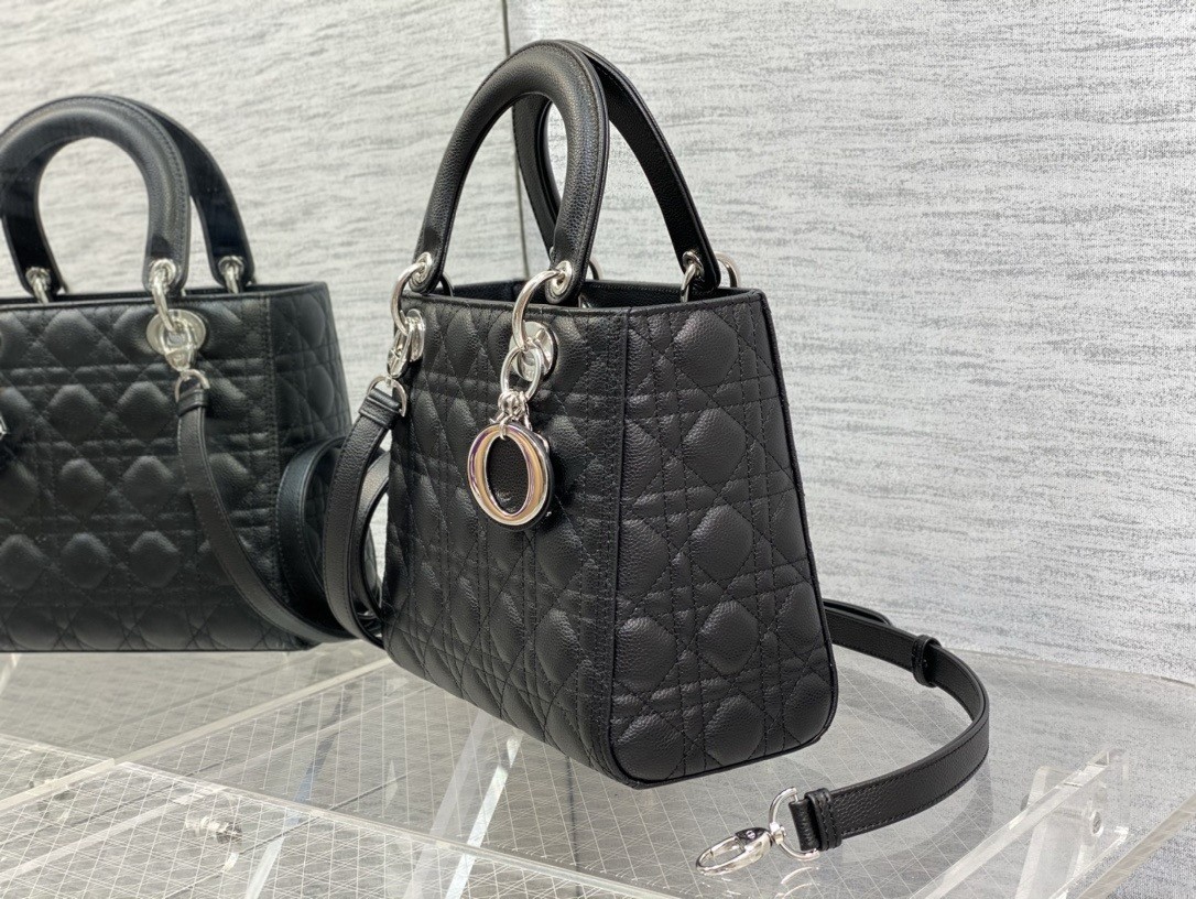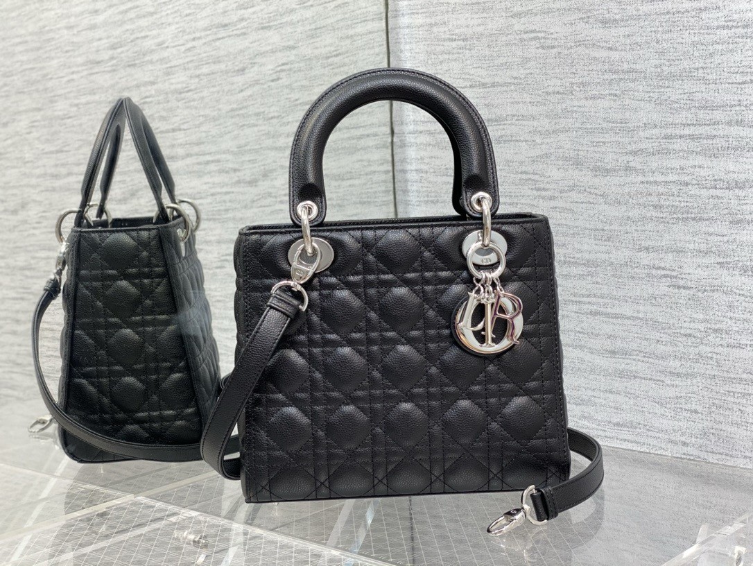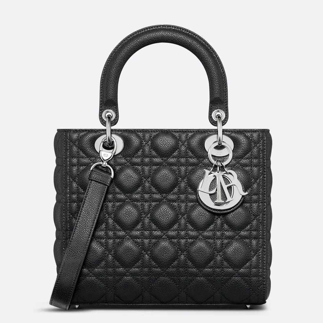 The season’s Lady Dior bag embodies Dior’s vision of elegance and beauty. The refined creation is timeless yet still very relevant. Crafted in grained calfskin with Cannage stitching, its supreme quilting instantly stands out while silver-finish metal D.I.O.R. charms offer a modern allure. Featuring a thin removable leather shoulder strap, the medium Lady Dior bag can be carried by hand or worn crossbody.