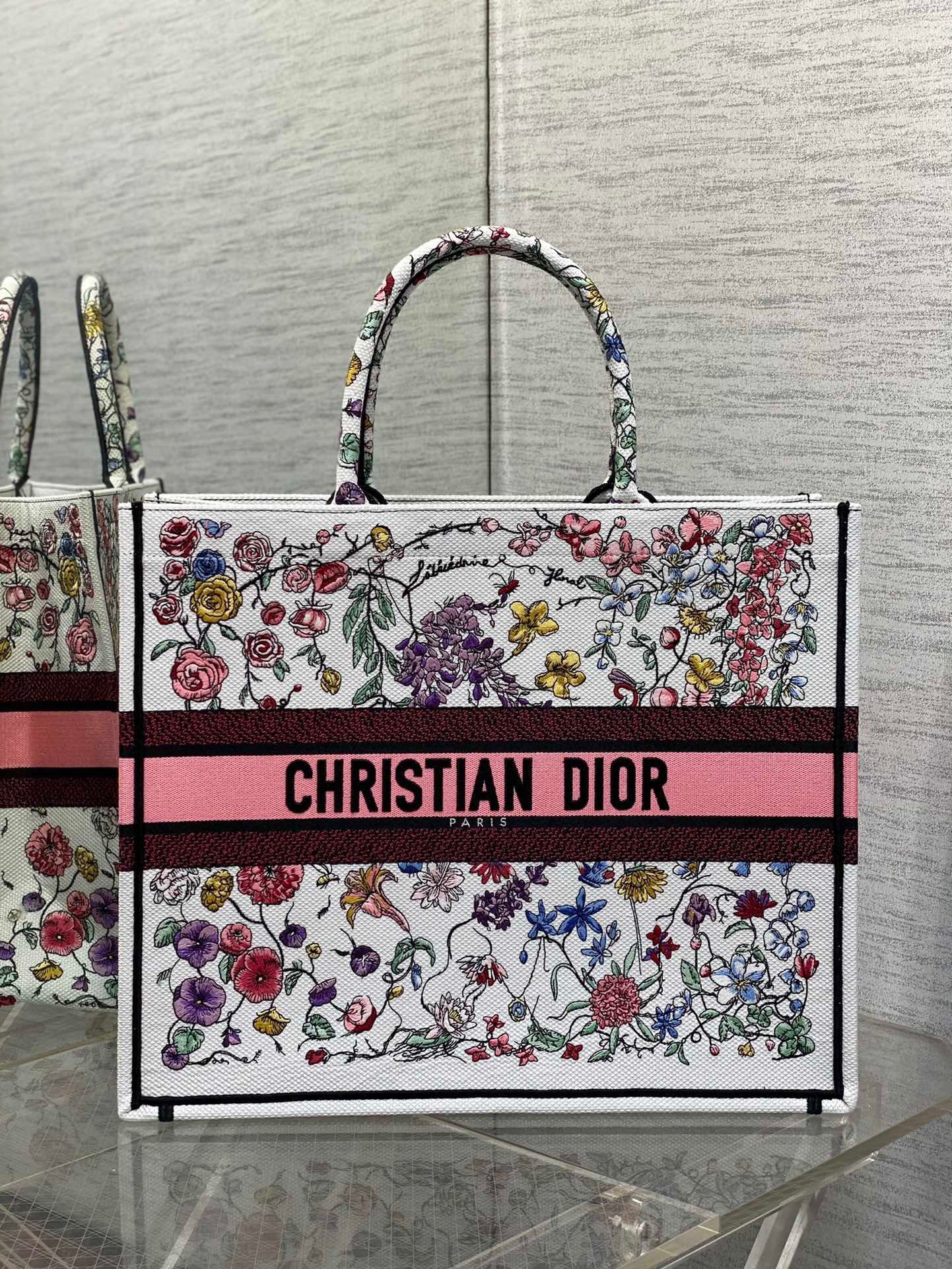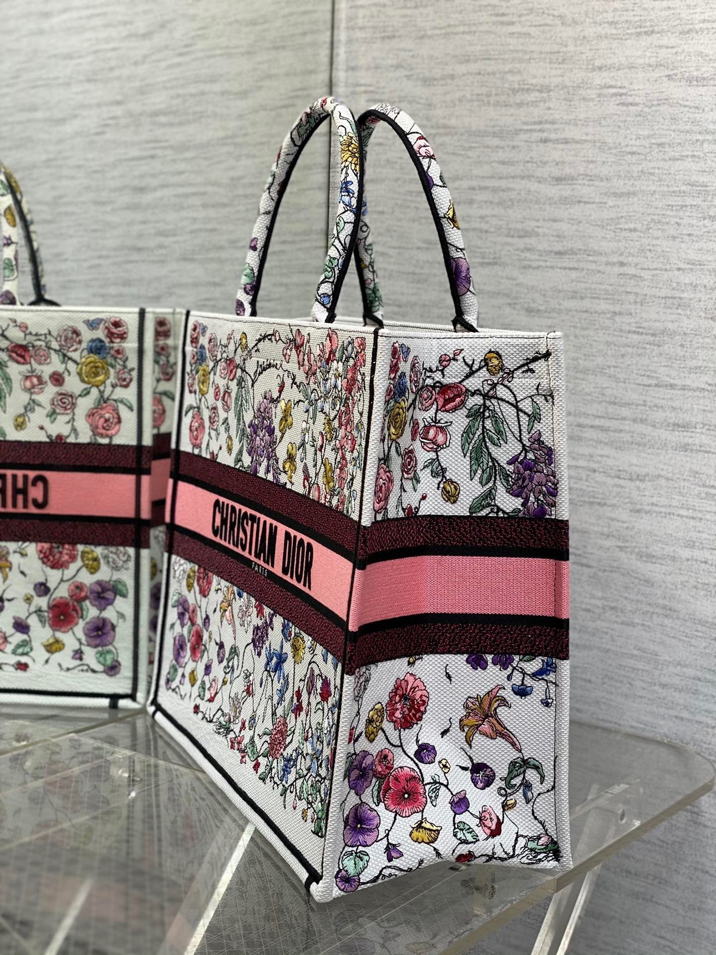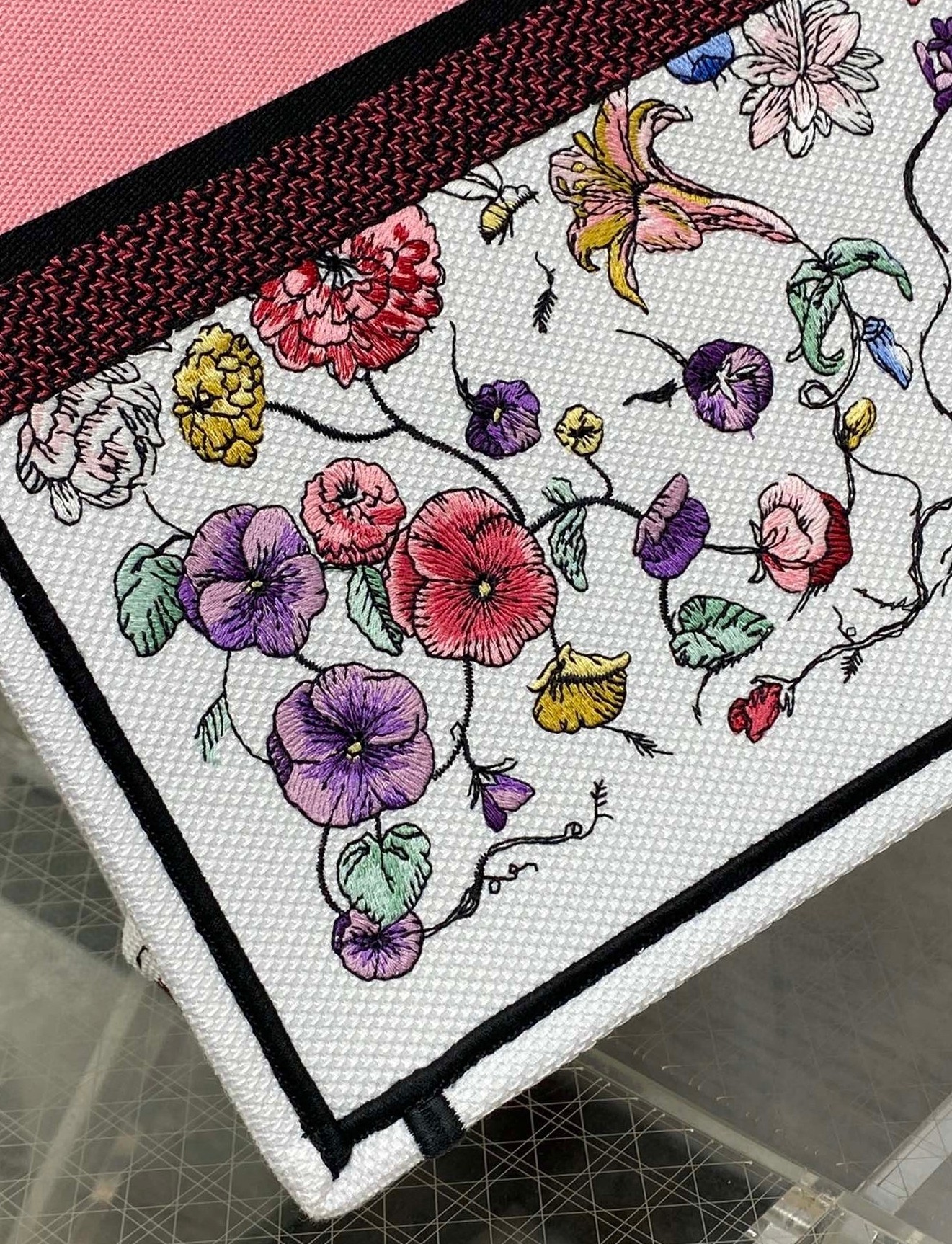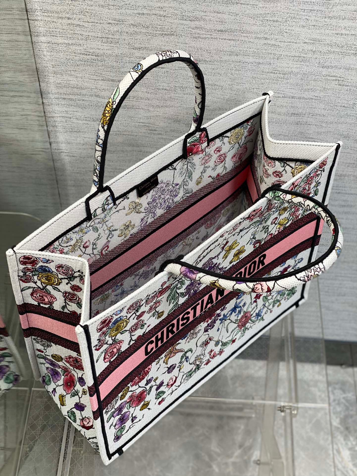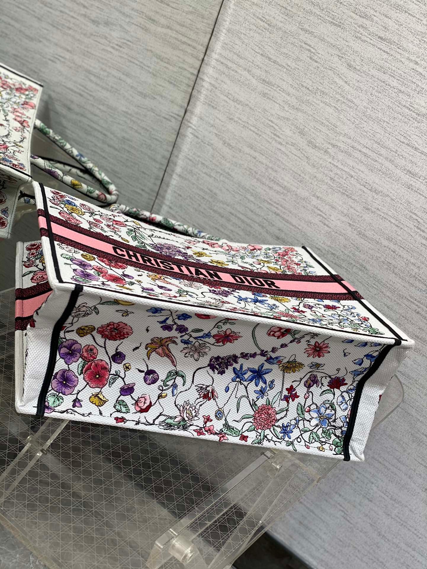 Introduced by Maria Grazia Chiuri, Dior’s Creative Director, the Dior Book Tote has become a staple of the Dior aesthetic. Designed to hold all the daily essentials, the style is fully embroidered with the white multicolor Florilegio motif showcasing a bucolic, elegant and colorful universe. The design is adorned with the Christian Dior Paris signature on the front and exemplifies the House’s signature savoir-faire. The large tote may be carried by hand or worn over the shoulder.