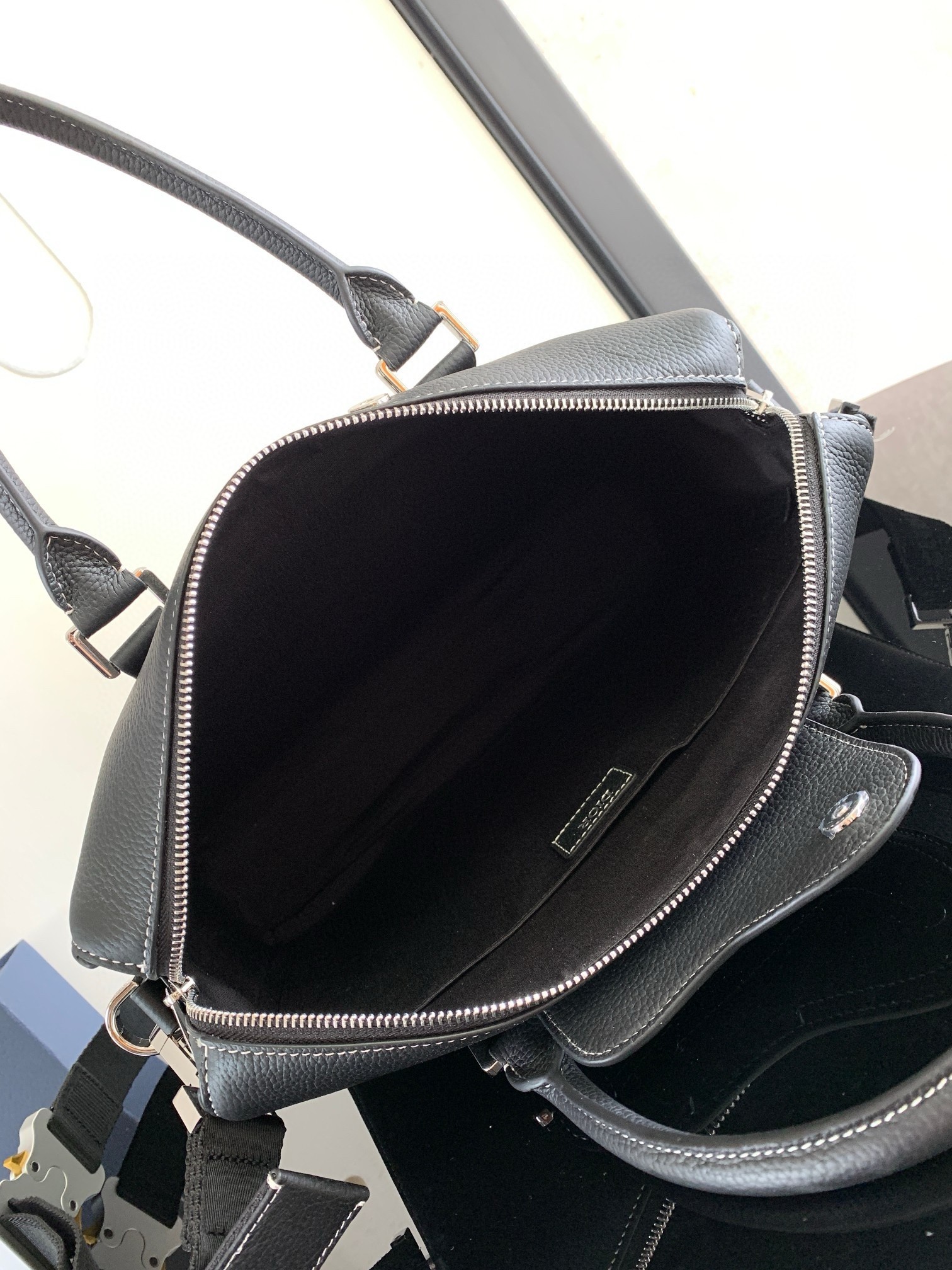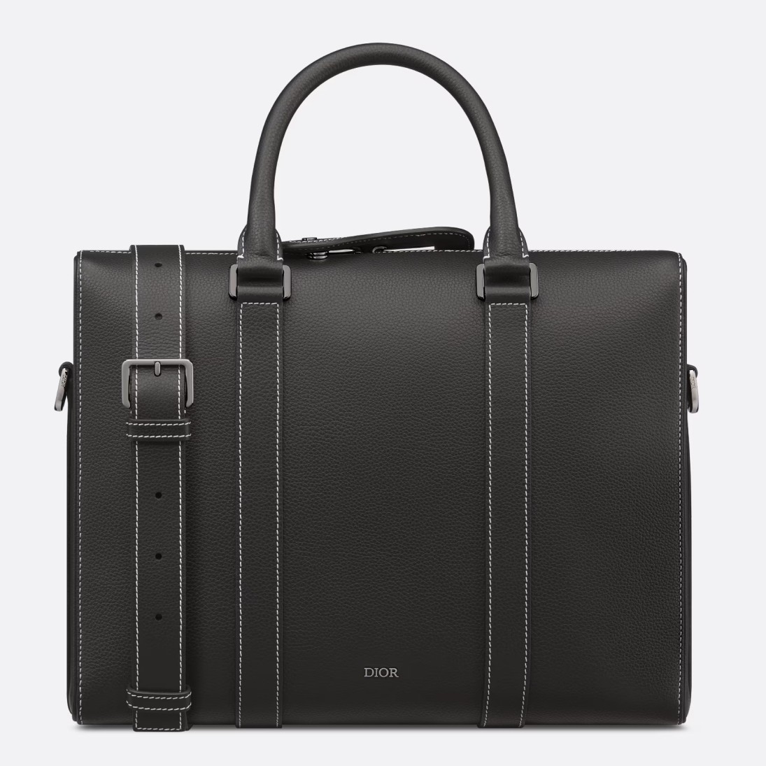 New to the Dior Lingot line, the briefcase combines timeless elegance with the House’s couture spirit. The structured grained calfskin style is enhanced by contrasting topstitching and a Dior signature on the front. A Saddle flap reveals a spacious zipped interior with a padded laptop compartment. Folding handles and an adjustable and removable shoulder strap with an aluminum buckle allow the bag to be carried by hand, worn over the shoulder or crossbody.