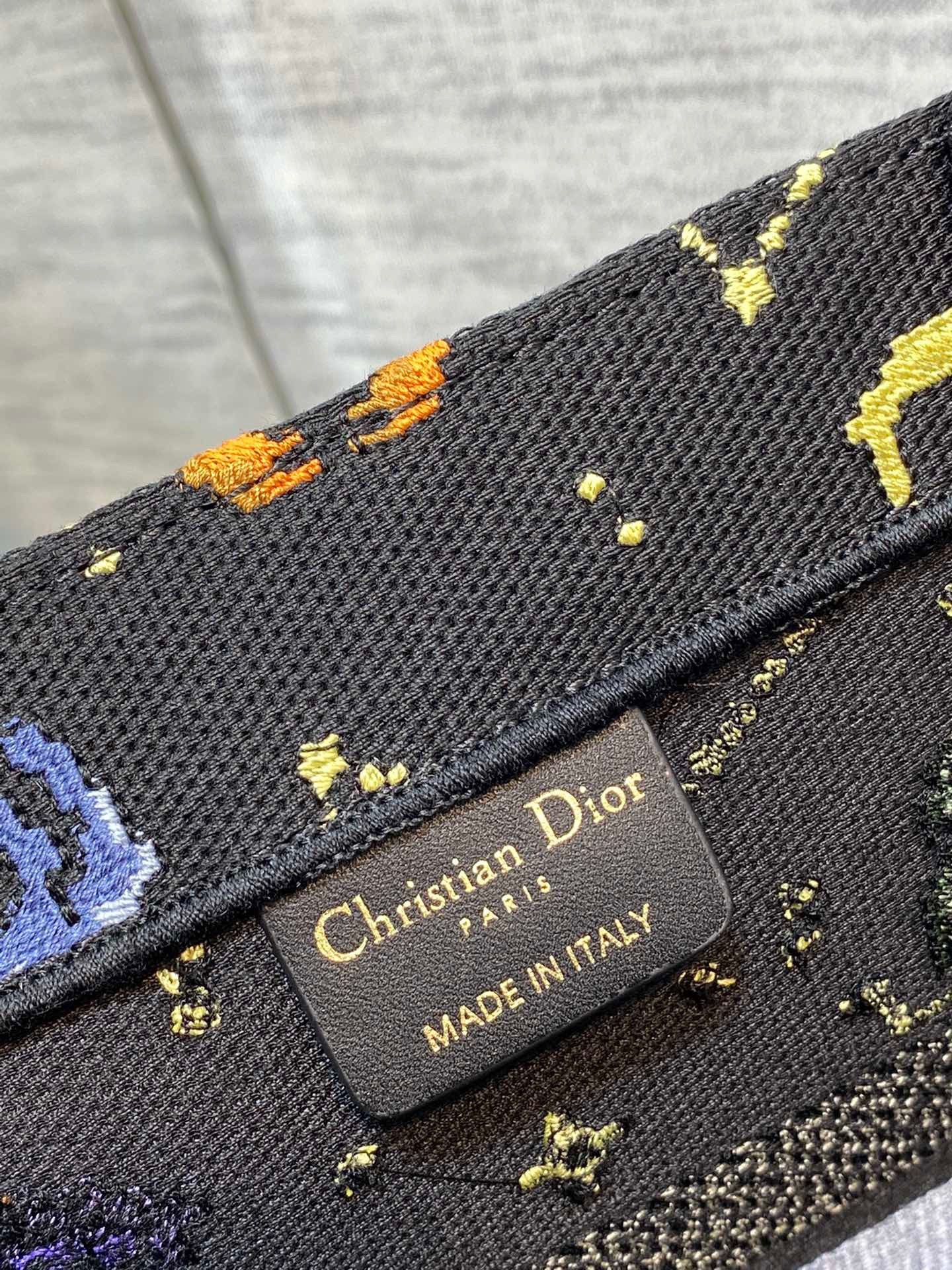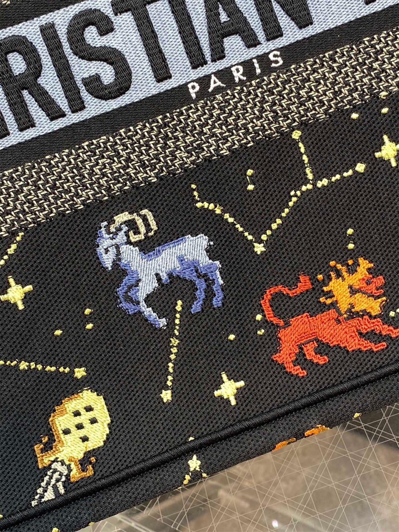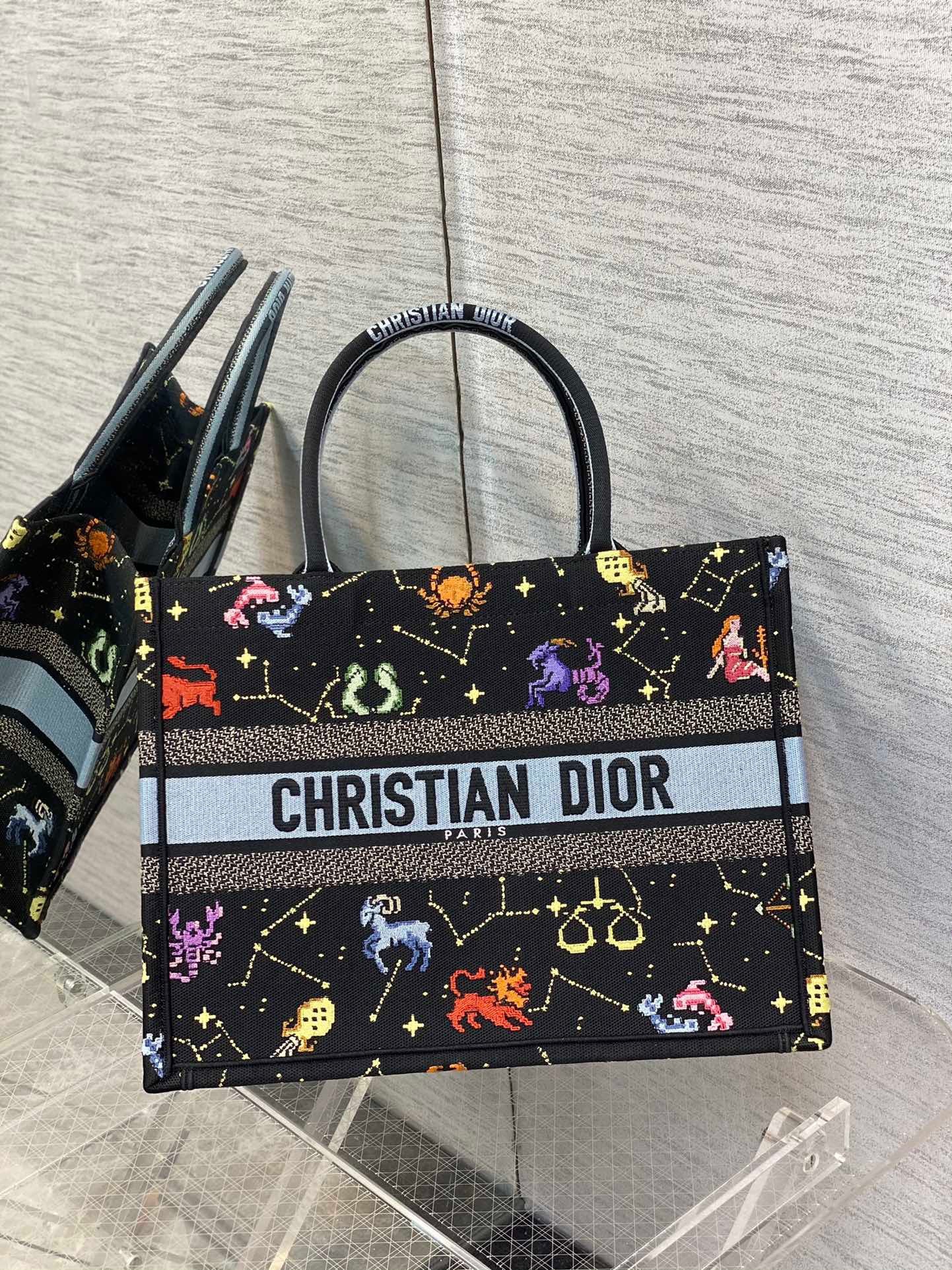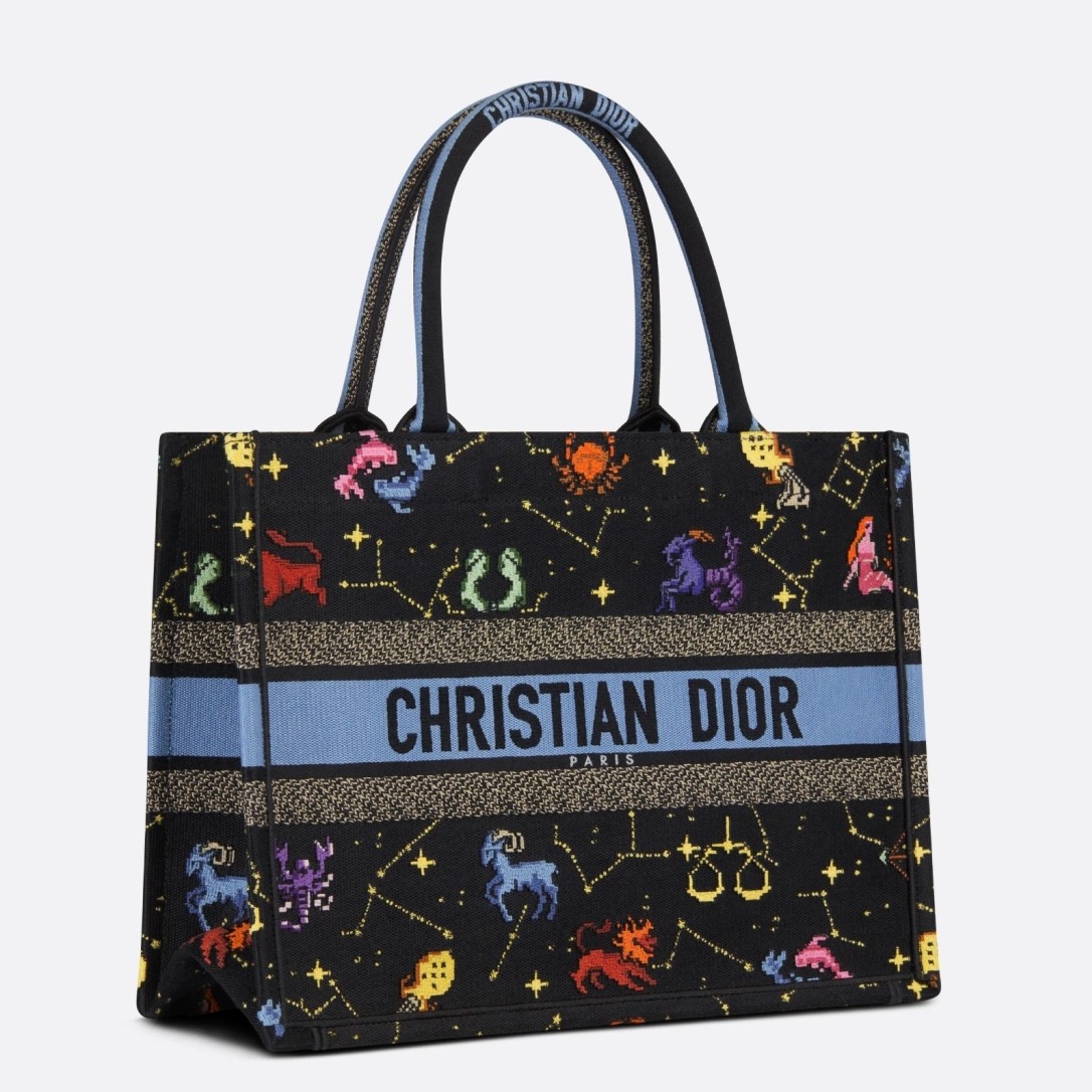 he Dior Book Tote is an original creation introduced by Maria Grazia Chiuri, Dior’s Creative Director, and has become a staple of the Dior aesthetic. Designed to hold all the daily essentials, the style is fully embroidered with the multicolor Dior Pixel Zodiac motif, offering a creative and colorful new take on astrological signs. Adorned with the ‘CHRISTIAN DIOR PARIS’ signature on the front, the medium tote exemplifies the House’s signature savoir-faire and may be carried by hand or worn over the shoulder.