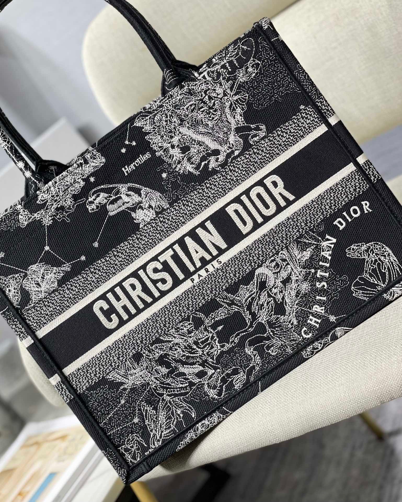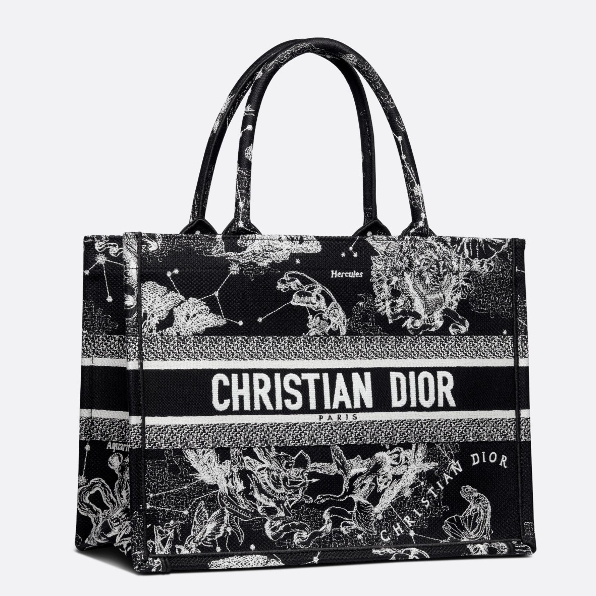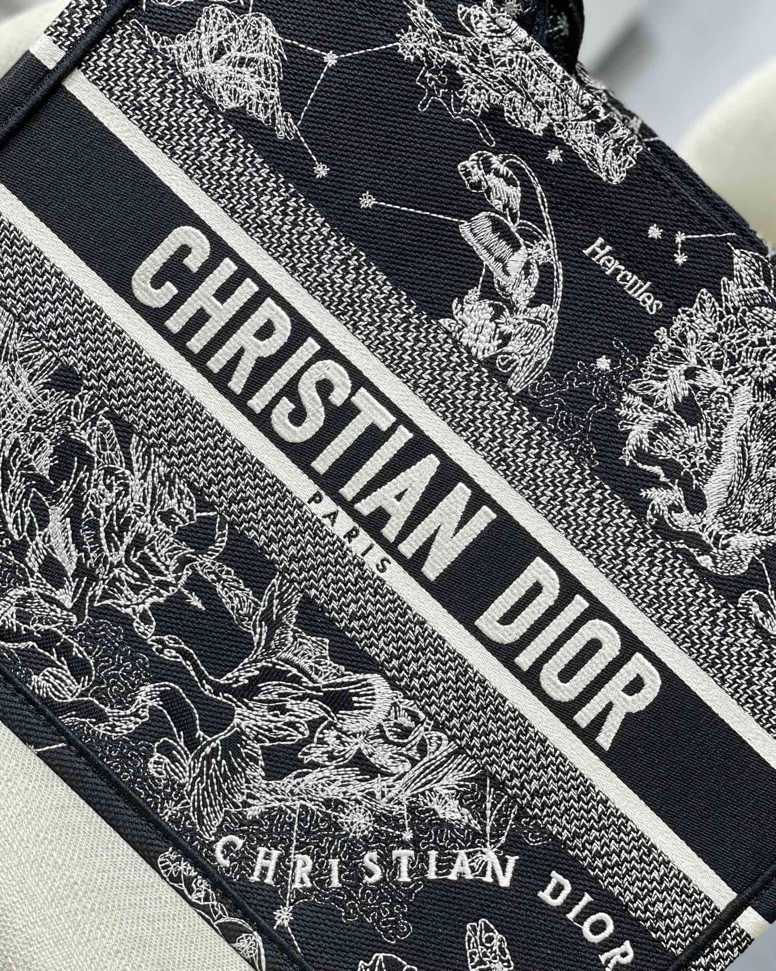 Introduced by Maria Grazia Chiuri, Creative Director of Christian Dior, the Dior Book Tote has become a staple of the Dior aesthetic. Designed to hold the daily essentials, the style is fully embroidered with a Toile de Jouy Zodiac motif, a variation of the House’s hallmark pattern that honors Mr. Dior’s passion for astrology. Adorned with the ‘CHRISTIAN DIOR PARIS’ signature on the front, the medium tote exemplifies the House’s signature savoir-faire and may be carried by hand or worn over the shoulder.