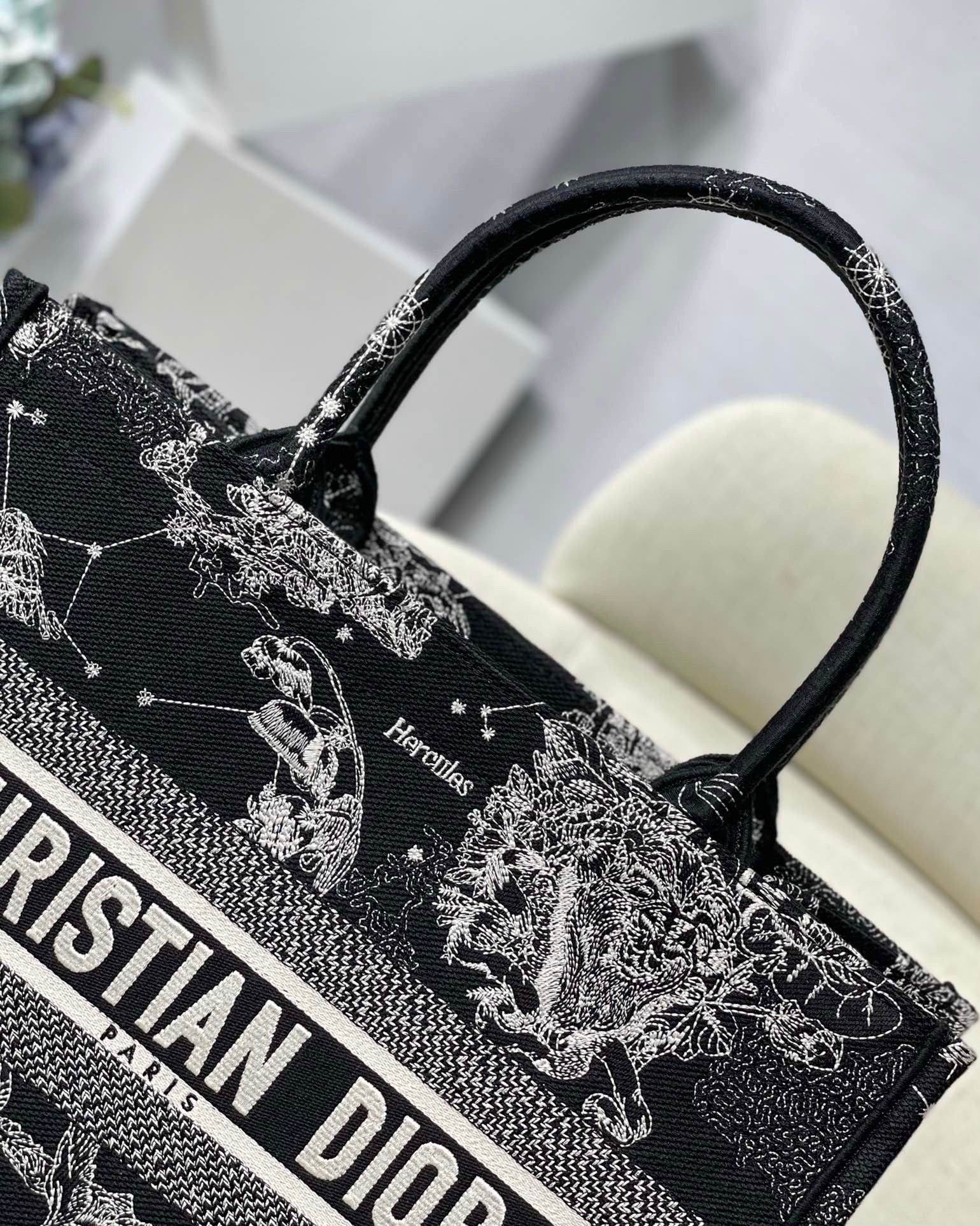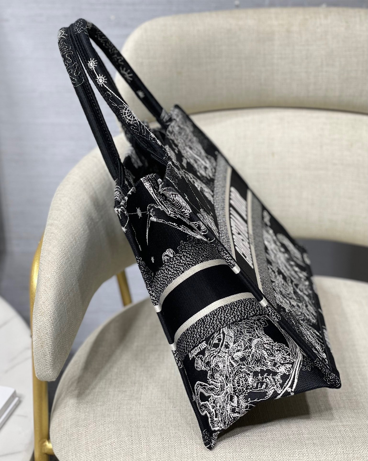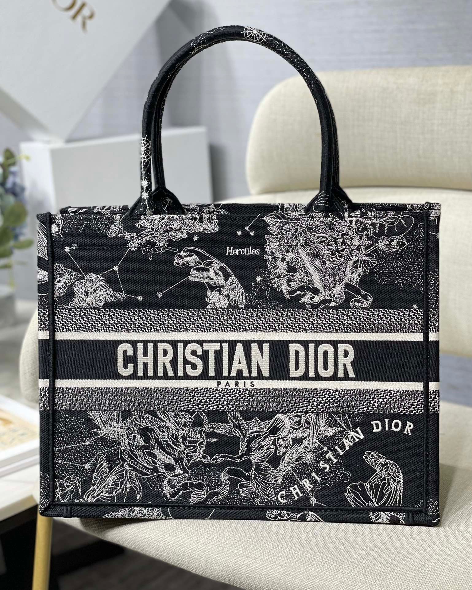 Introduced by Maria Grazia Chiuri, Creative Director of Christian Dior, the Dior Book Tote has become a staple of the Dior aesthetic. Designed to hold the daily essentials, the style is fully embroidered with a Toile de Jouy Zodiac motif, a variation of the House’s hallmark pattern that honors Mr. Dior’s passion for astrology. Adorned with the ‘CHRISTIAN DIOR PARIS’ signature on the front, the medium tote exemplifies the House’s signature savoir-faire and may be carried by hand or worn over the shoulder.