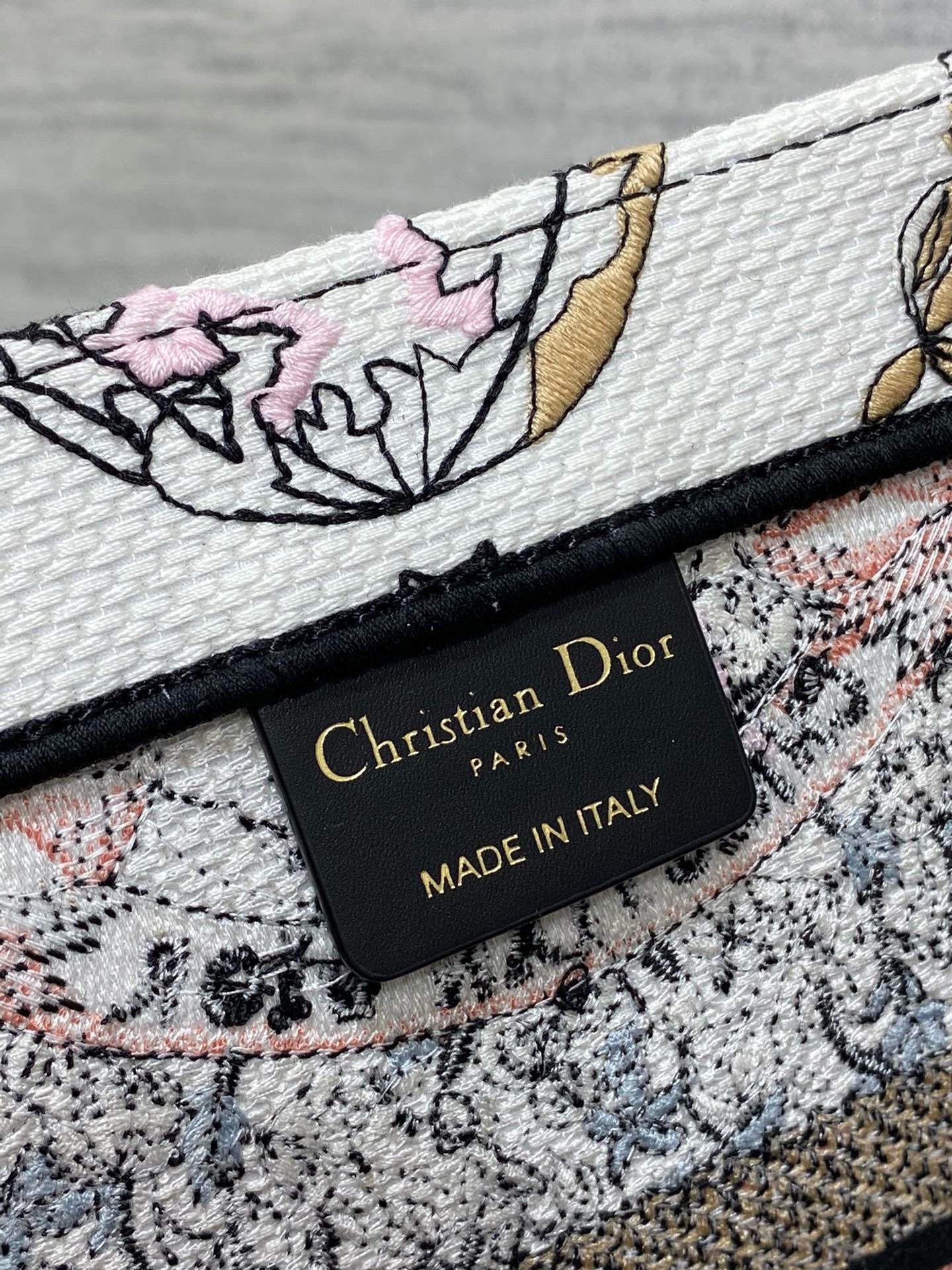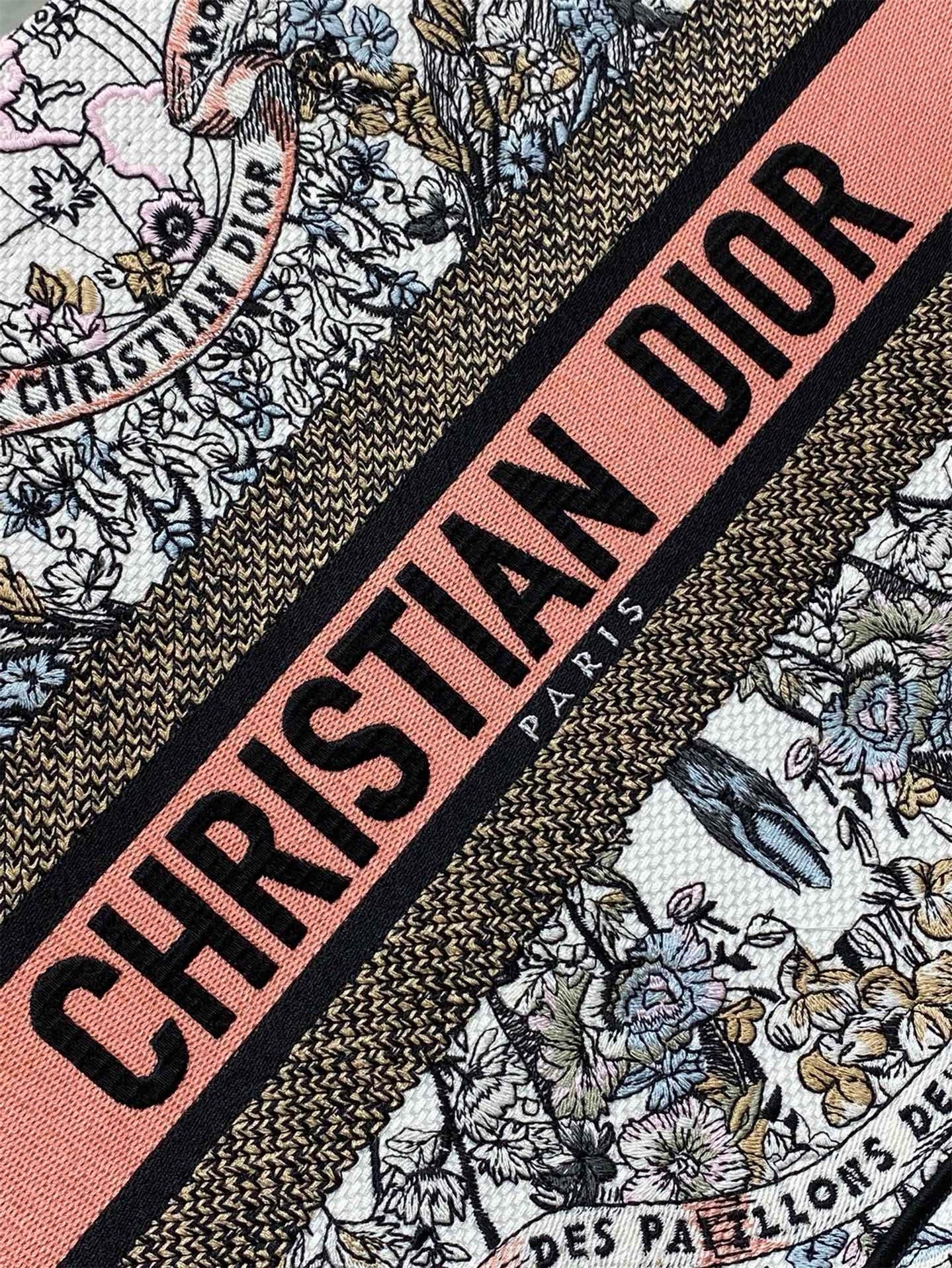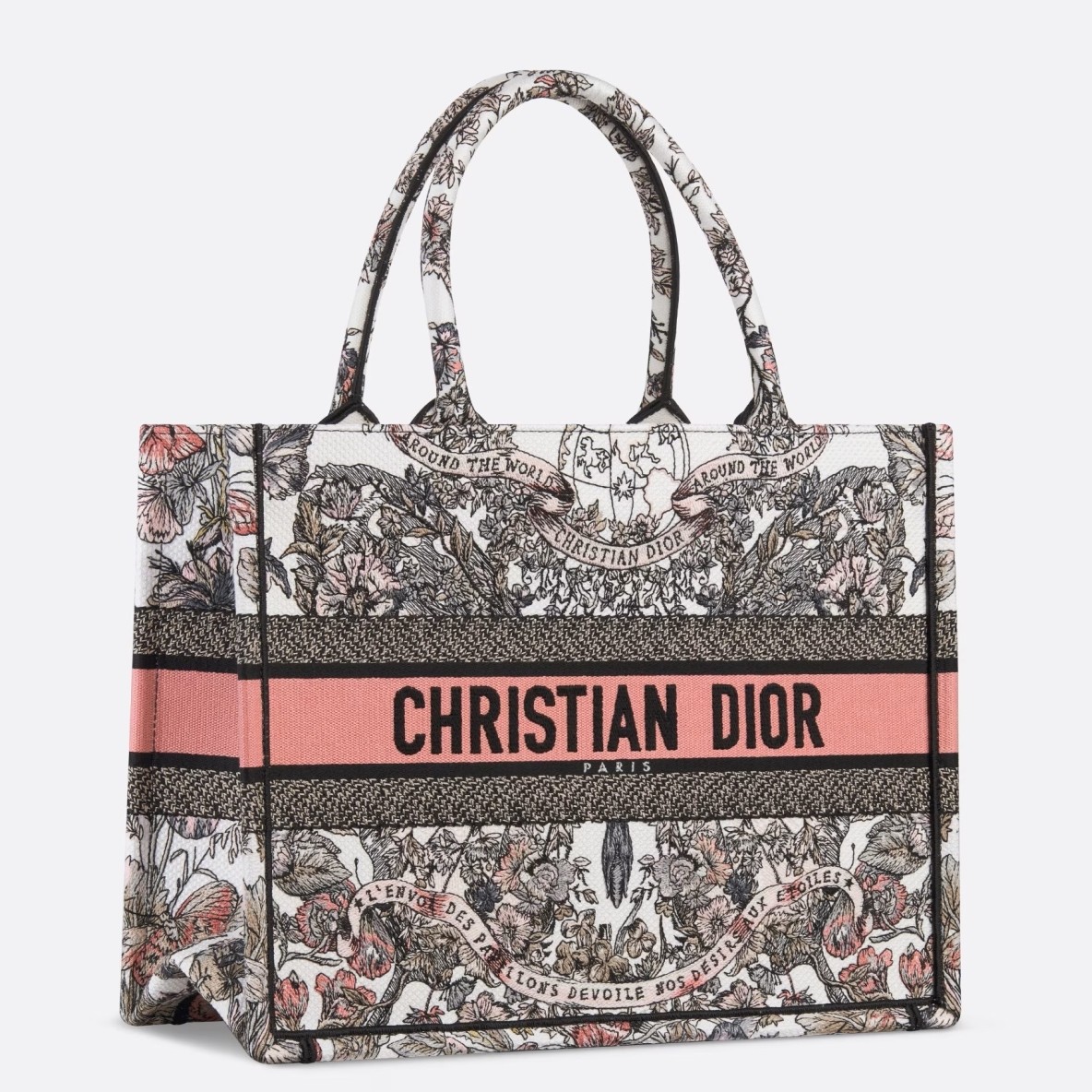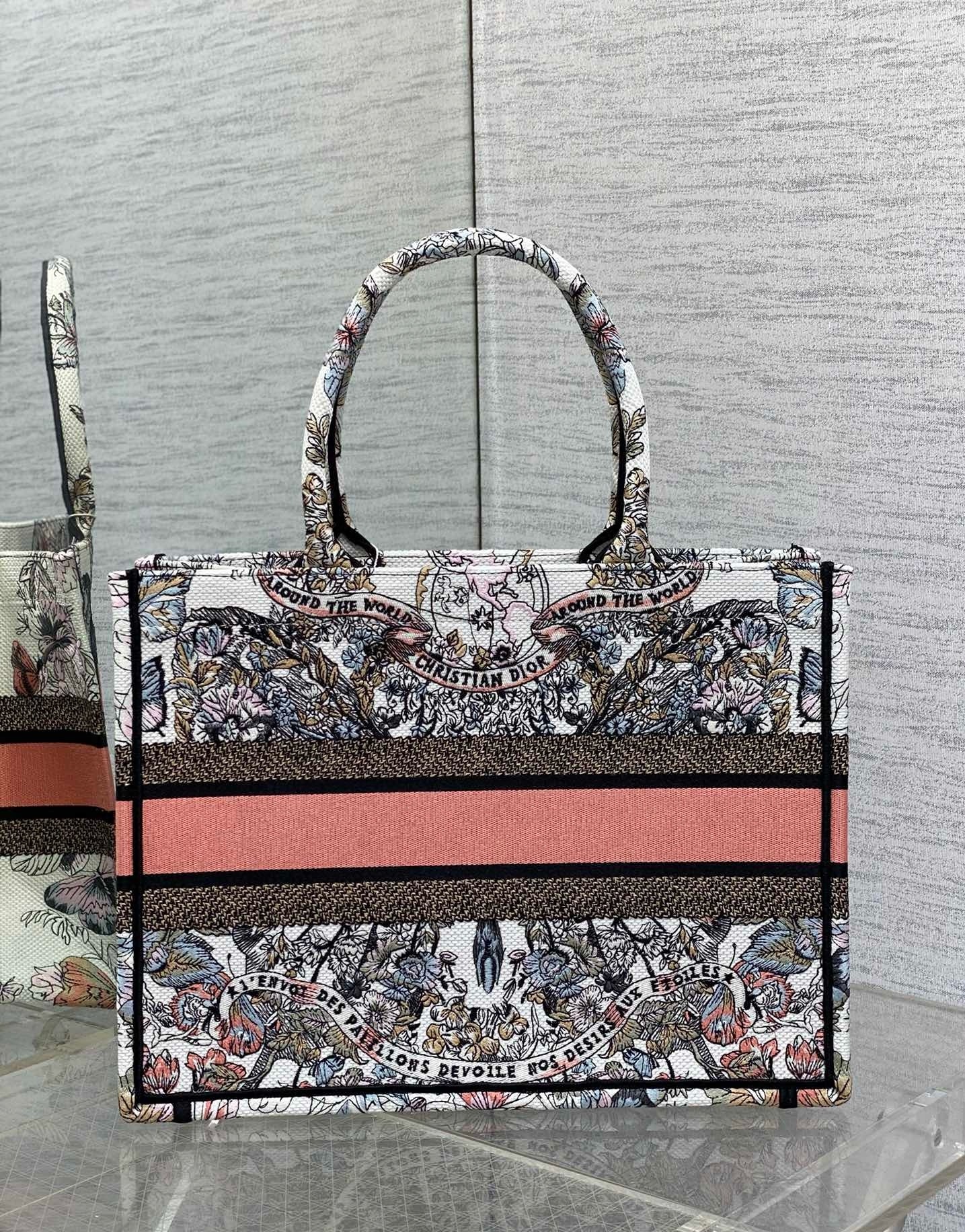Introduced by Maria Grazia Chiuri, Creative Director of Christian Dior, the Dior Book Tote has become a staple of the Dior aesthetic. Designed to hold all the daily essentials, it is fully embroidered with a Butterfly Around The World motif in white and pastel pink, showcasing the collection’s signature butterfly embellished with the words L’envol des papillons d??voile nos d??sirs aux ??toiles. Adorned with the Christian Dior Paris signature on the front, the medium tote exemplifies the House’s signature savoir-faire and may be carried by hand or worn over the shoulder.