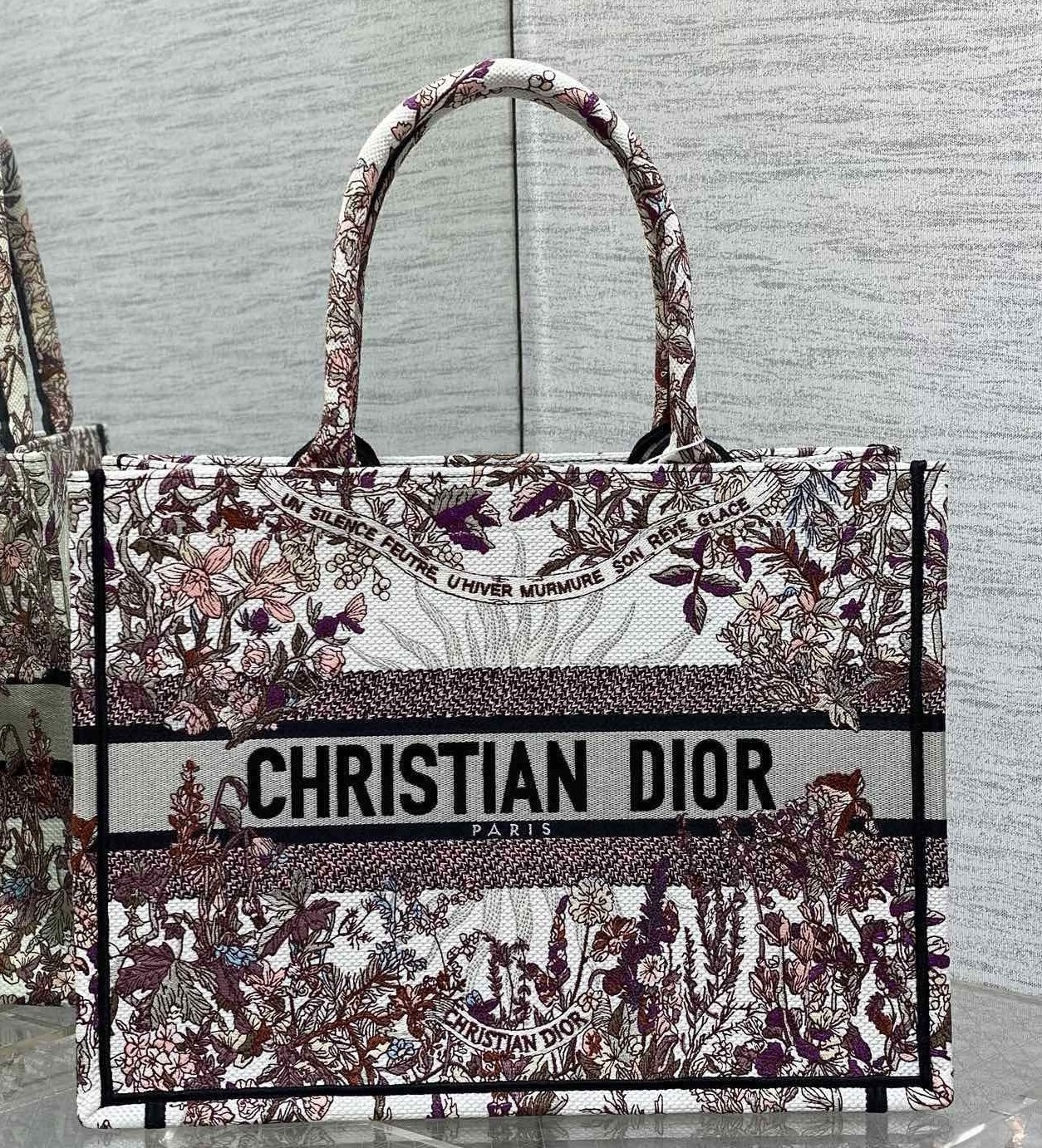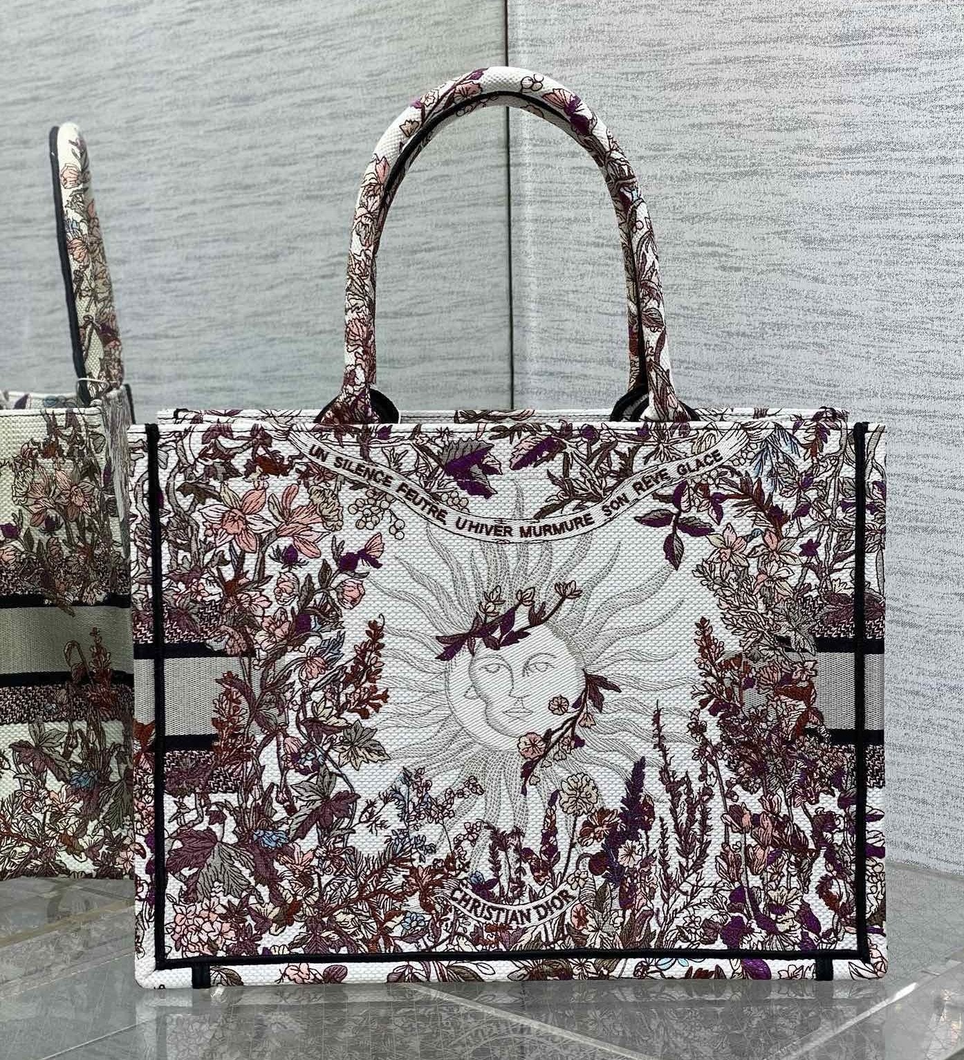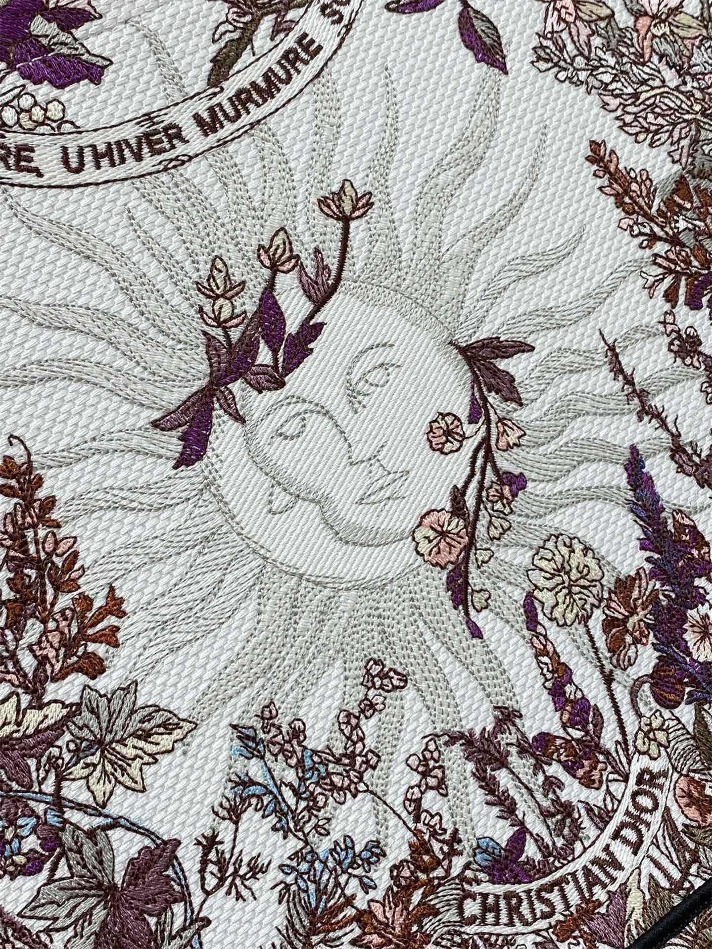 Introduced by Maria Grazia Chiuri, Creative Director of Christian Dior, the Dior Book Tote has become a staple of the Dior aesthetic. Designed to hold all the daily essentials, the ecru multicolor style is fully embroidered with the Dior 4 Saisons Hiver Soleil motif by Pietro Ruffo, celebrating the season’s signature sun theme with a bucolic wintry design punctuated by the words, Un silence feutr??, l’hiver murmure son r??ve glac??. Adorned with the Christian Dior Paris signature on the front, the medium tote exemplifies the House’s signature savoir-faire and may be carried by hand or worn over the shoulder.