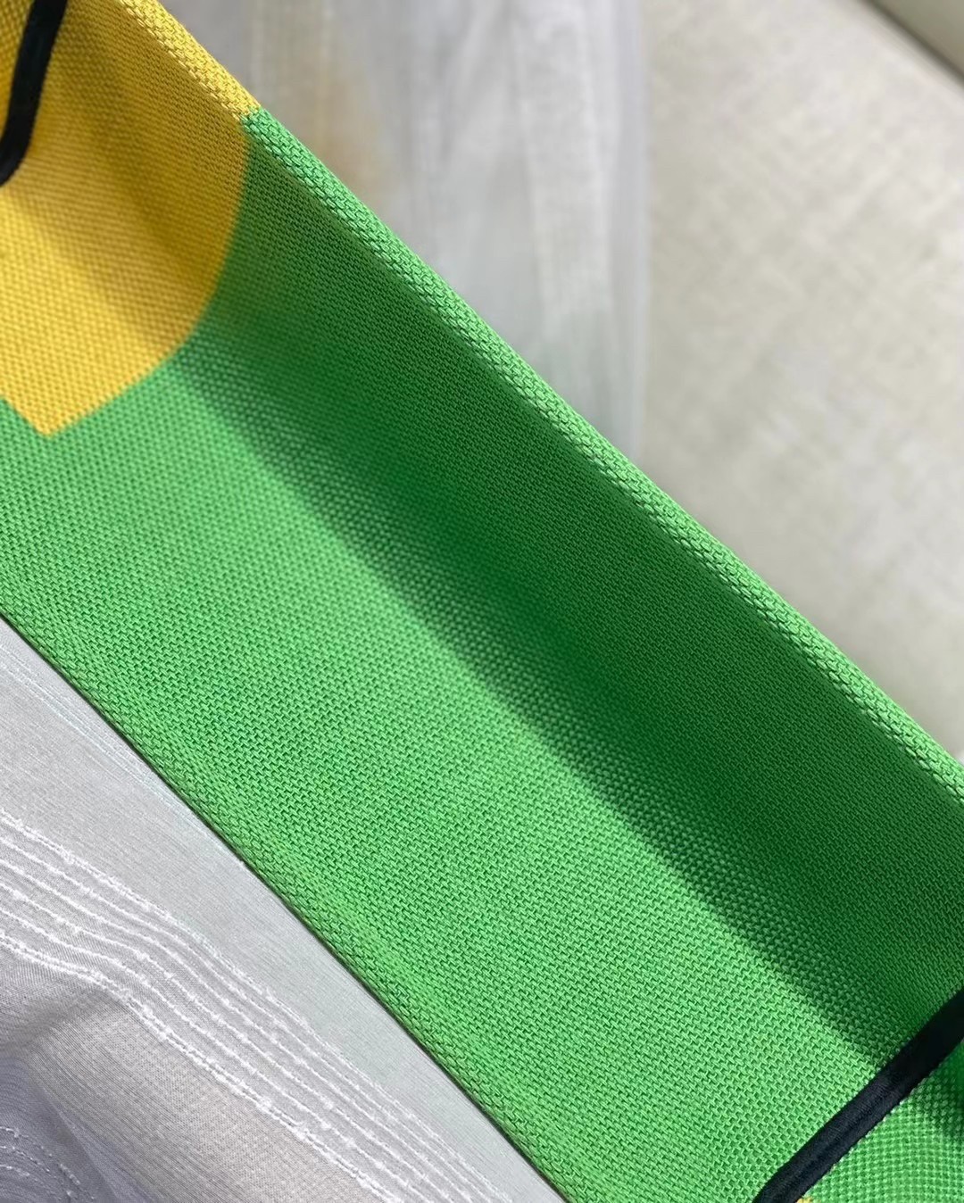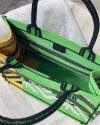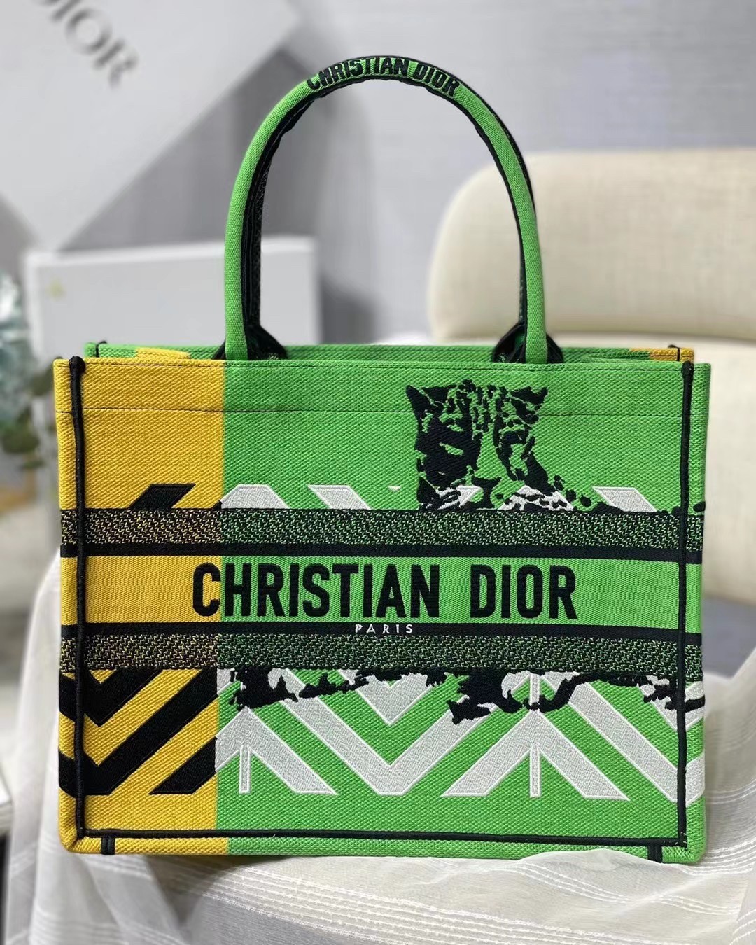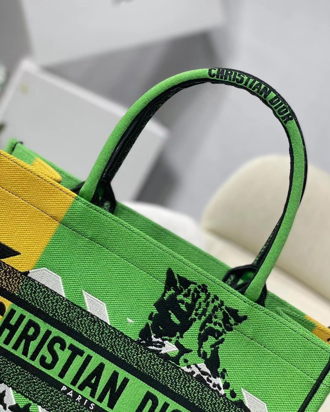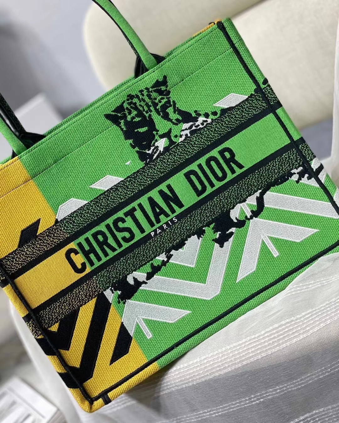 Introduced by Maria Grazia Chiuri, Creative Director of Christian Dior, the Dior Book Tote has become a staple of the Dior aesthetic. Designed to hold the daily essentials, the style is fully embroidered with a bright green and fluorescent orange D-Jungle Pop motif that embodies the collection’s colorful pop inspiration. Adorned with the ‘CHRISTIAN DIOR PARIS’ signature on the front, the medium tote exemplifies the House’s signature savoir-faire and may be carried by hand or worn over the shoulder.