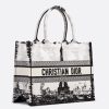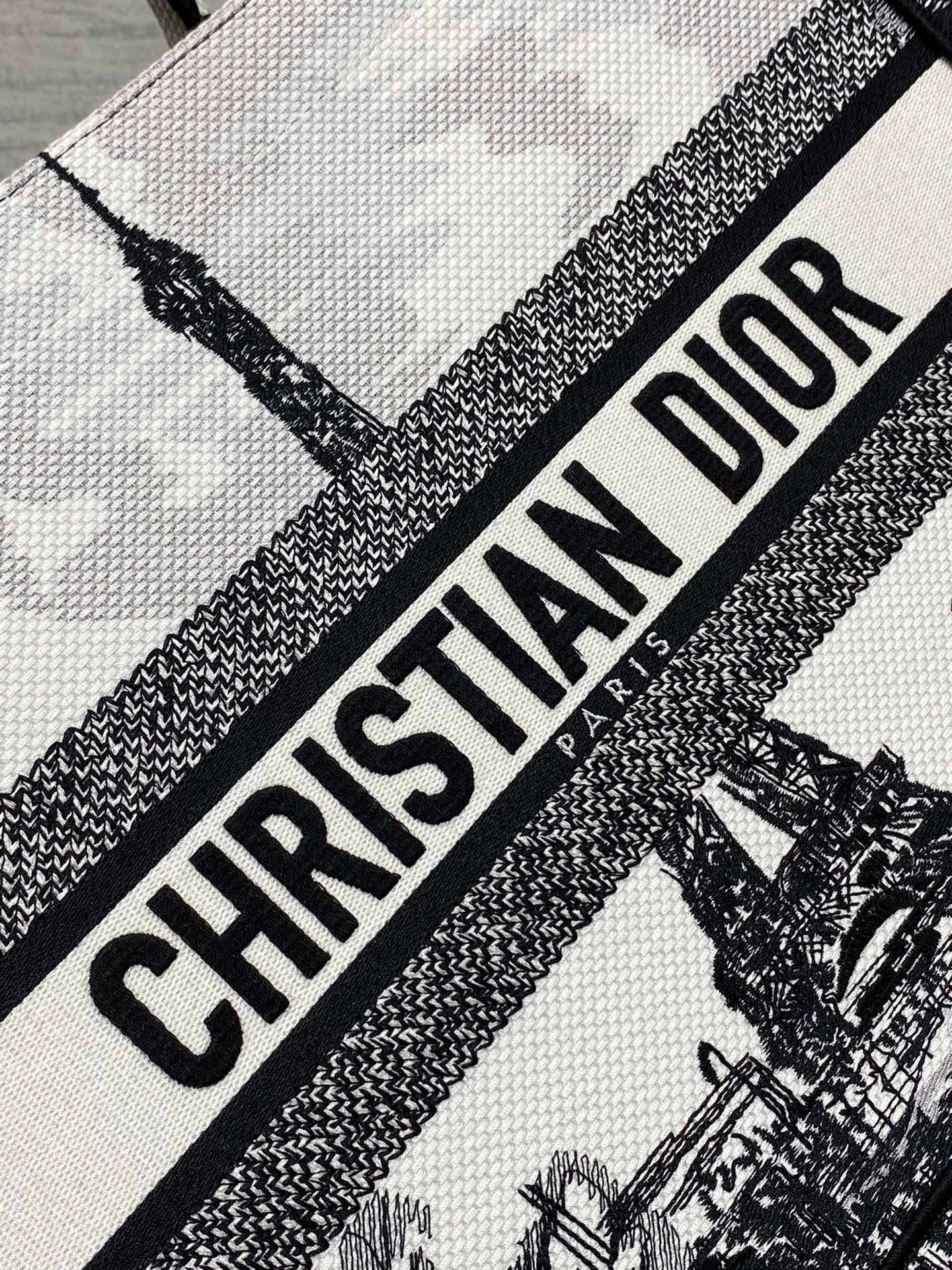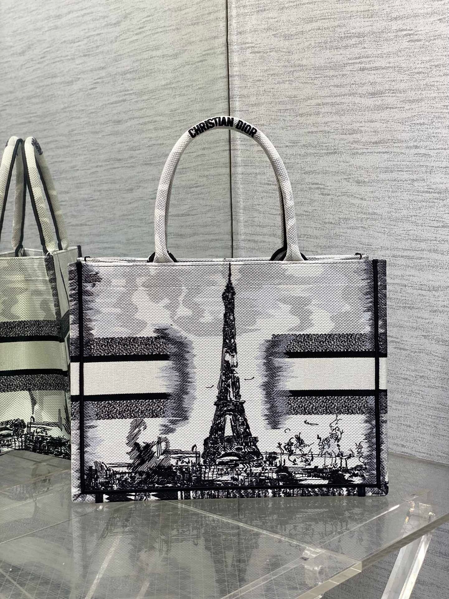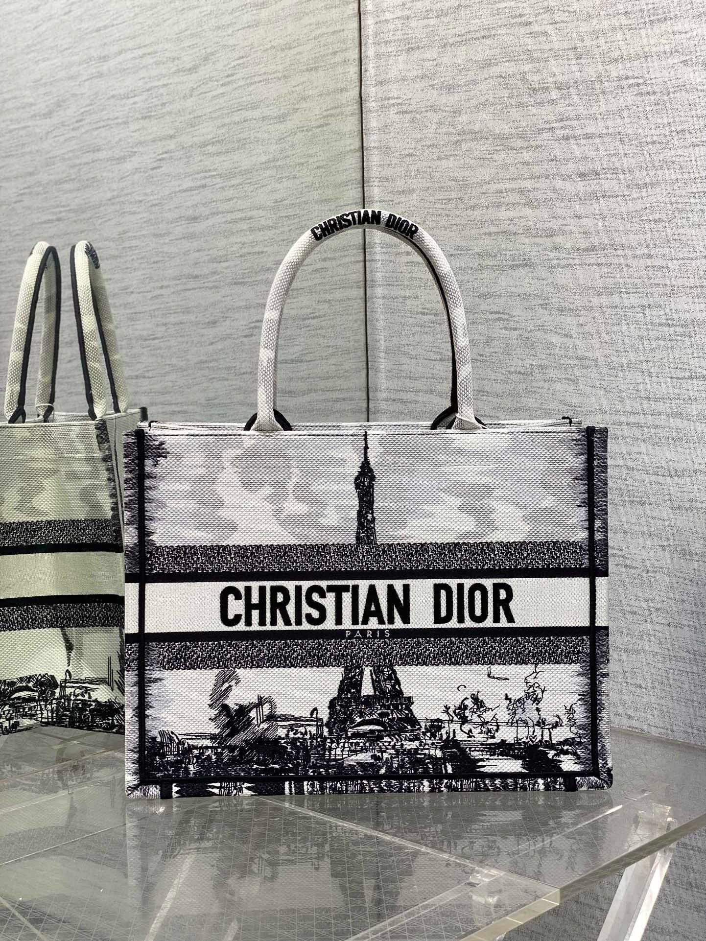 Introduced by Maria Grazia Chiuri, Creative Director of Christian Dior, the Dior Book Tote has become a staple of the Dior aesthetic. Designed to hold all the daily essentials, the style is fully embroidered with the white and black Paris motif, a pillar of the collection that honors the Eiffel Tower in a graphic spirit. Adorned with the Christian Dior Paris signature on the front, the medium tote exemplifies the House’s savoir-faire and may be carried by hand or worn over the shoulder.