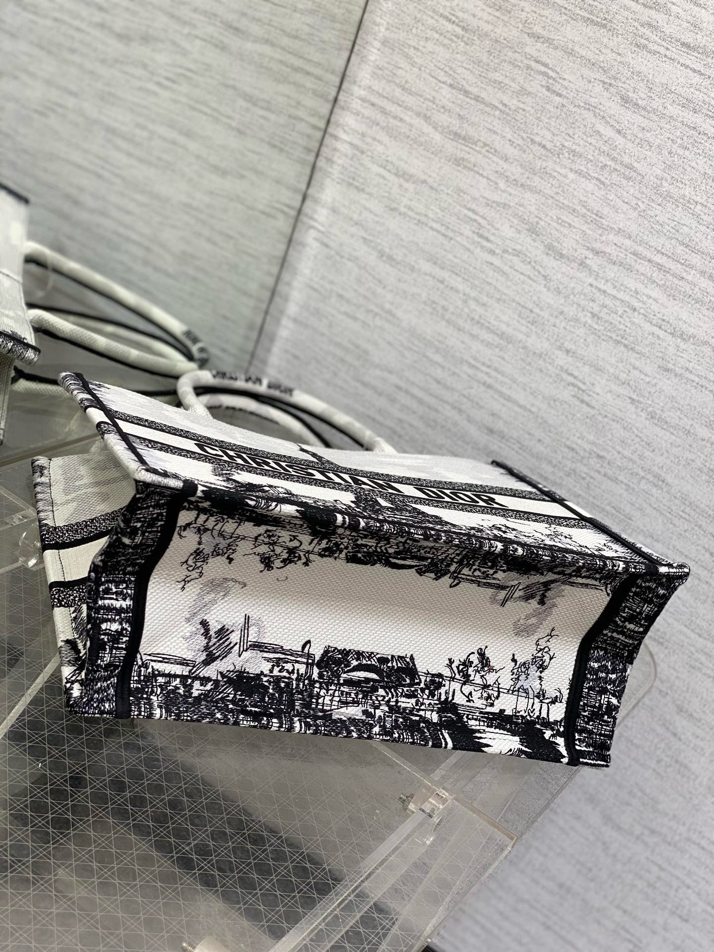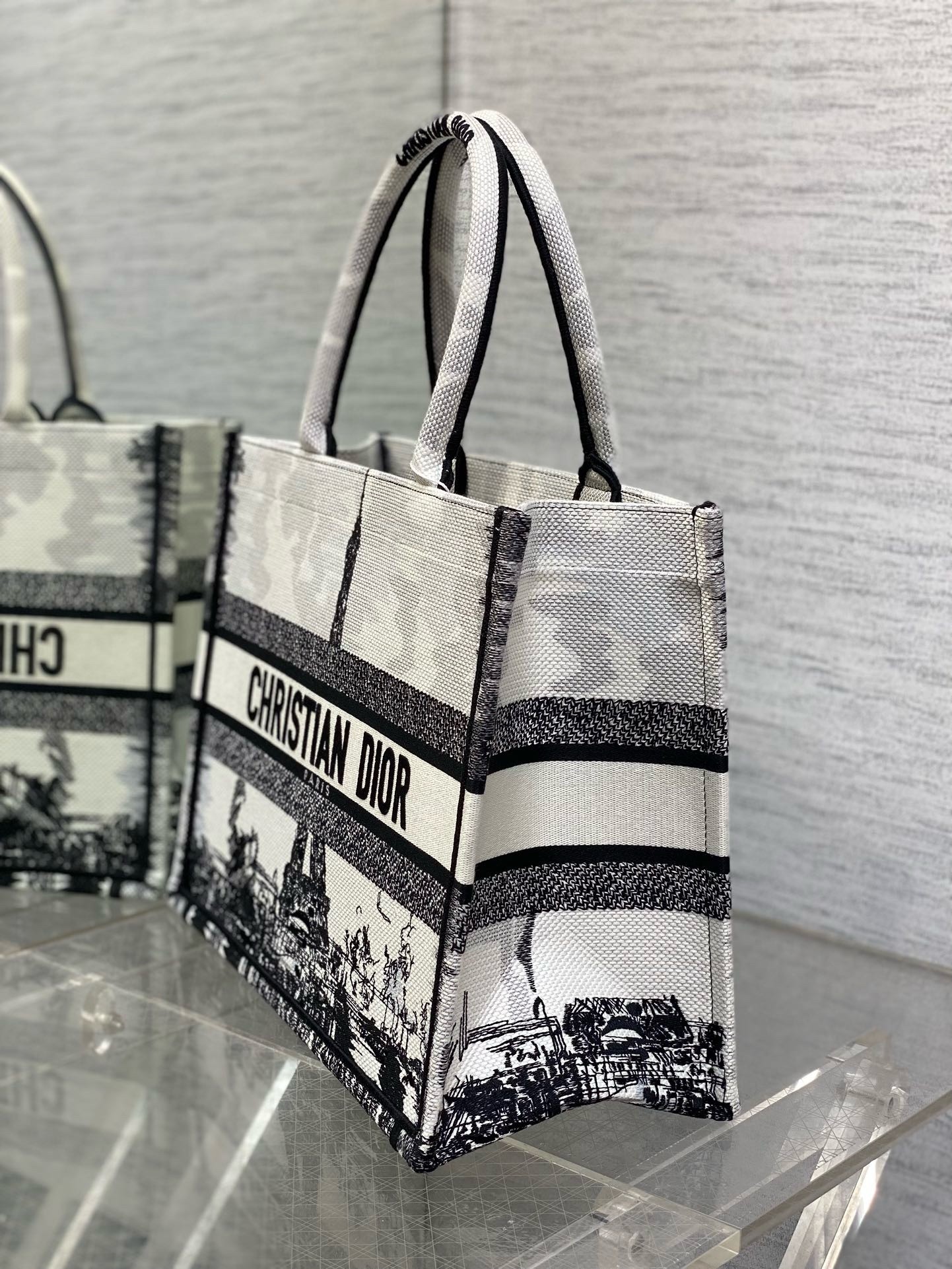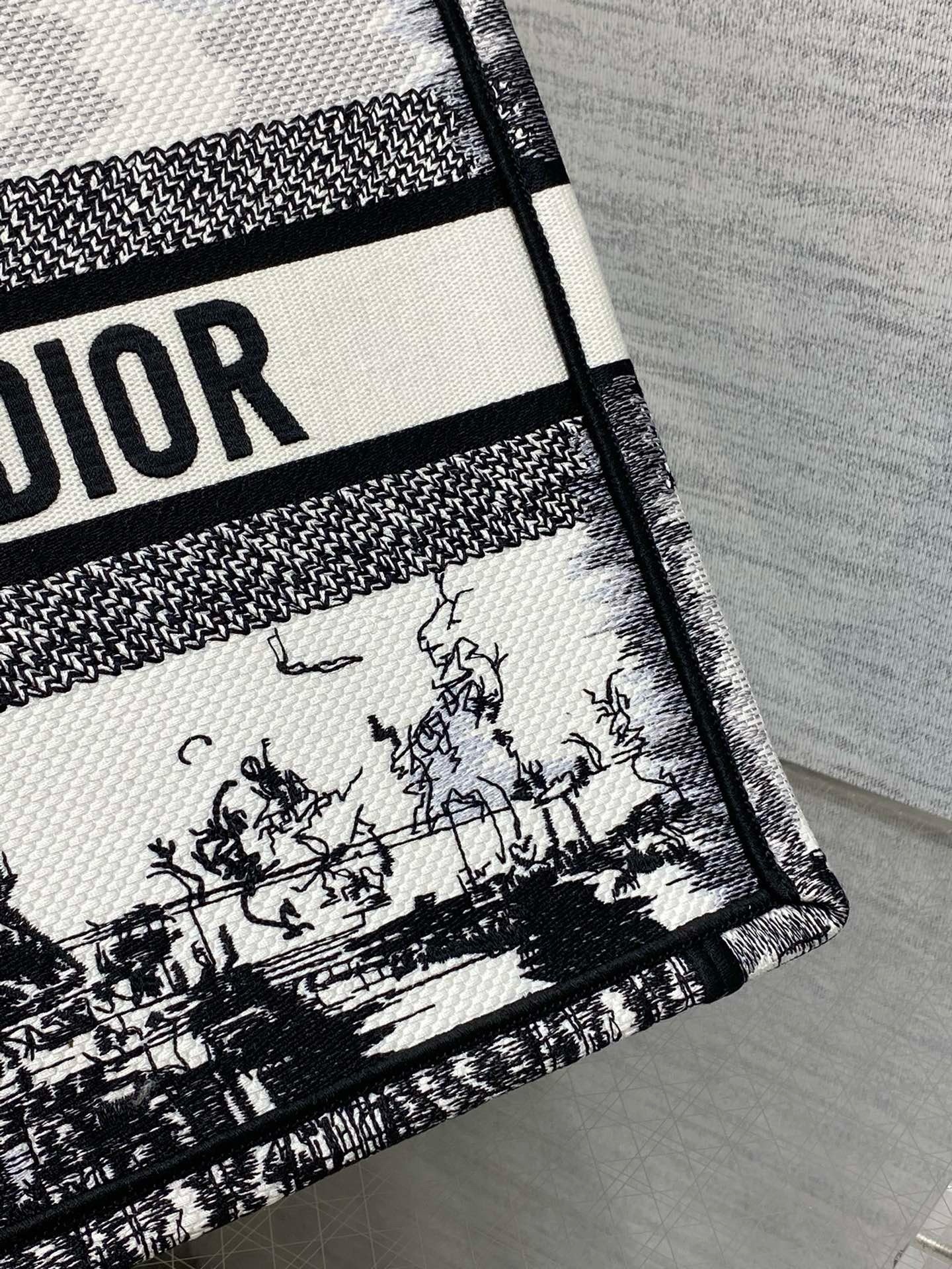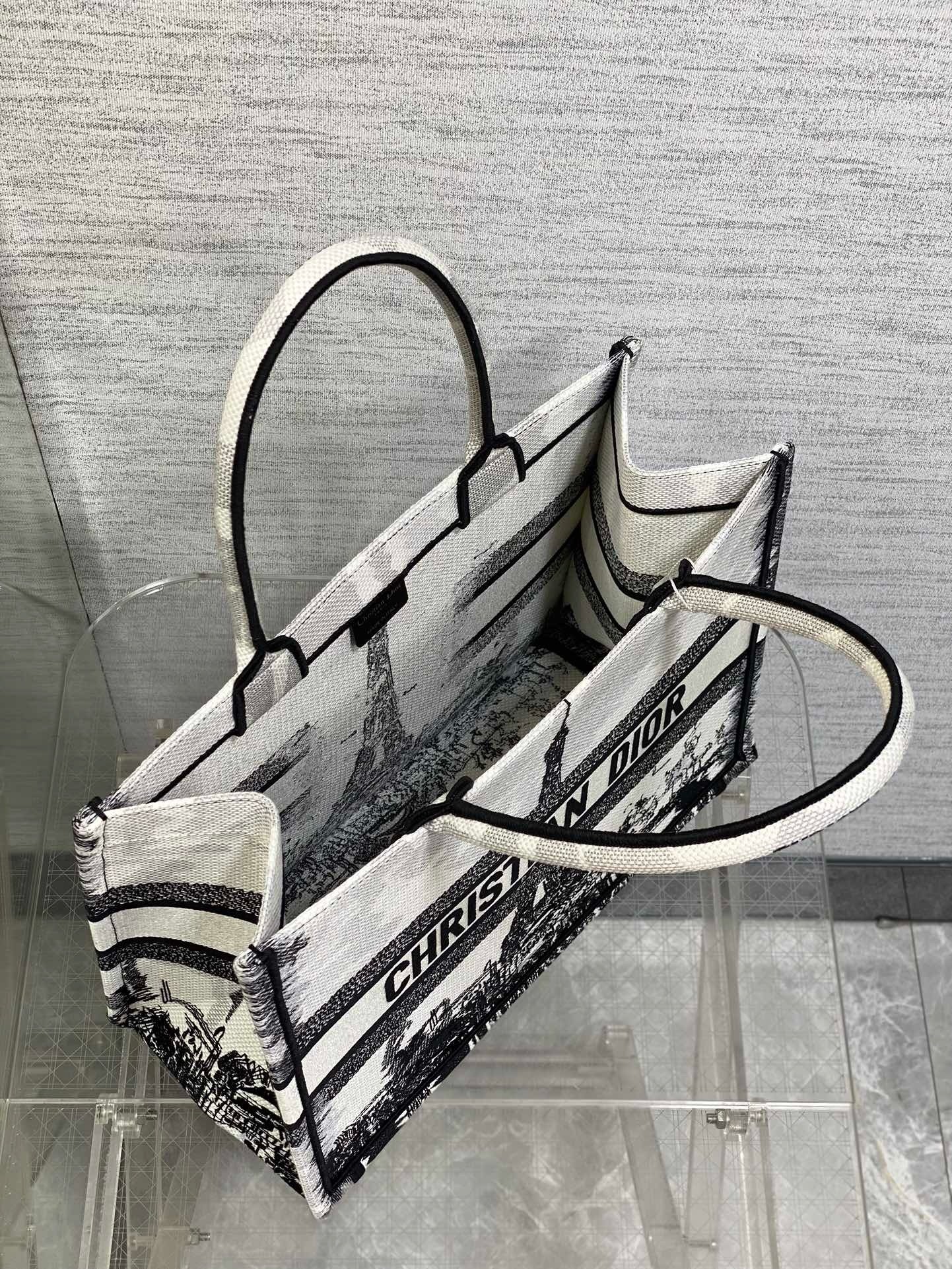 Introduced by Maria Grazia Chiuri, Creative Director of Christian Dior, the Dior Book Tote has become a staple of the Dior aesthetic. Designed to hold all the daily essentials, the style is fully embroidered with the white and black Paris motif, a pillar of the collection that honors the Eiffel Tower in a graphic spirit. Adorned with the Christian Dior Paris signature on the front, the medium tote exemplifies the House’s savoir-faire and may be carried by hand or worn over the shoulder.