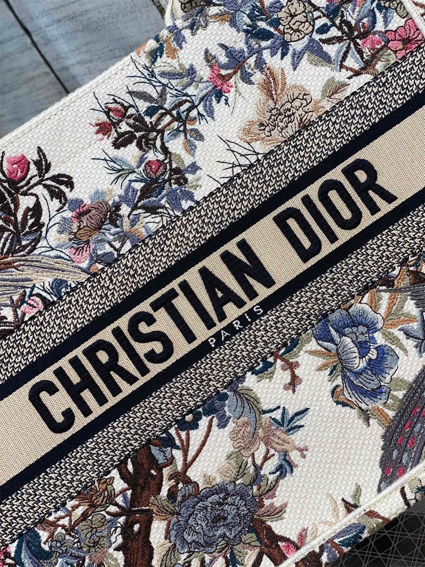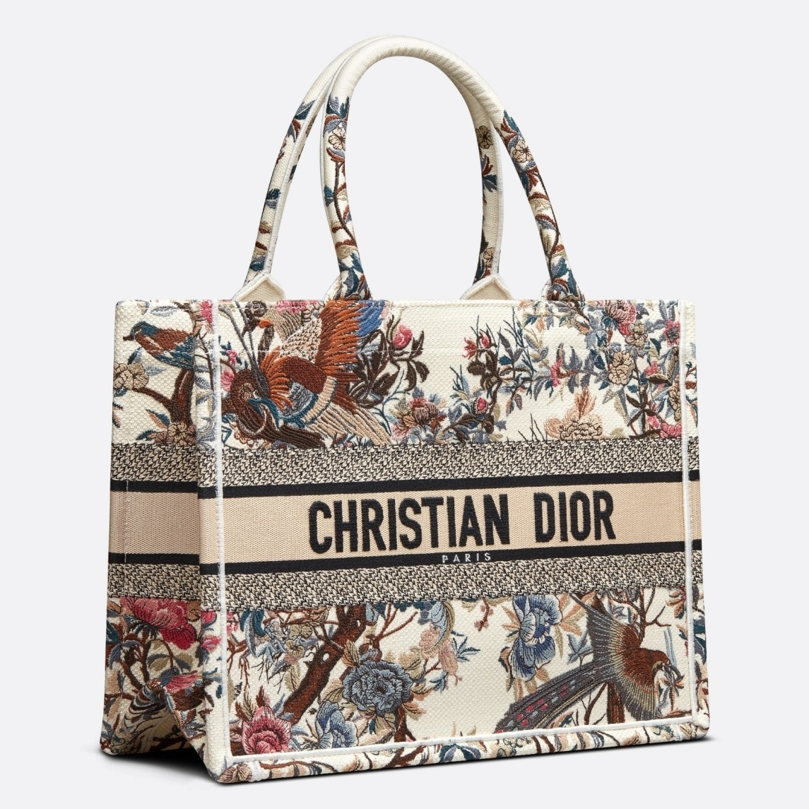 Introduced by Maria Grazia Chiuri, Dior’s Creative Director, the Dior Book Tote has become a staple of the Dior aesthetic. Designed to hold all the daily essentials, the style is fully embroidered with an ecru multicolor Dior Jardin d’Hiver motif, showcasing a poetic and exotic interpretation of Mr. Dior’s wall tapestries. Adorned with the ‘CHRISTIAN DIOR PARIS’ signature on the front, the medium tote exemplifies the House’s signature savoir-faire and may be carried by hand or worn over the shoulder.