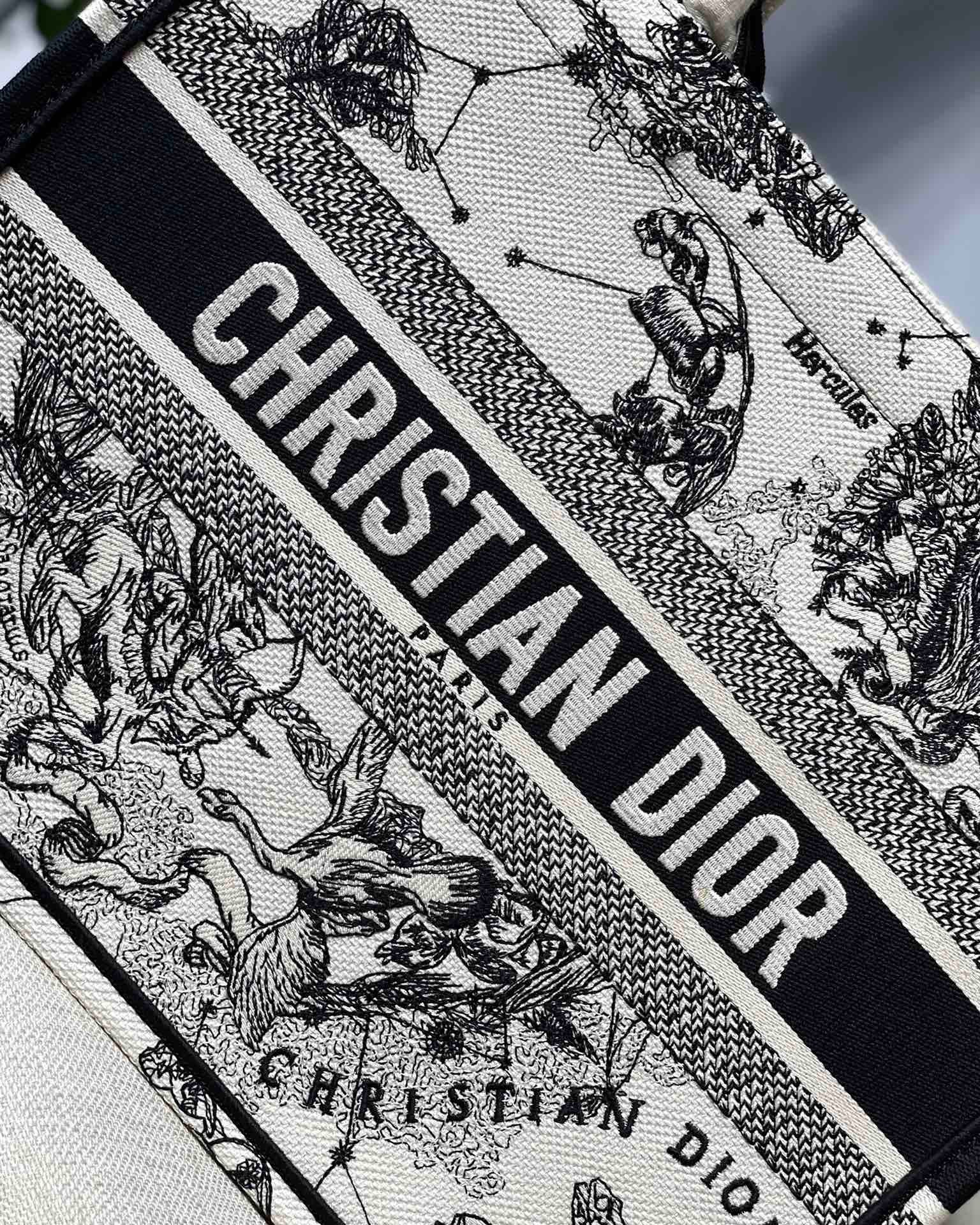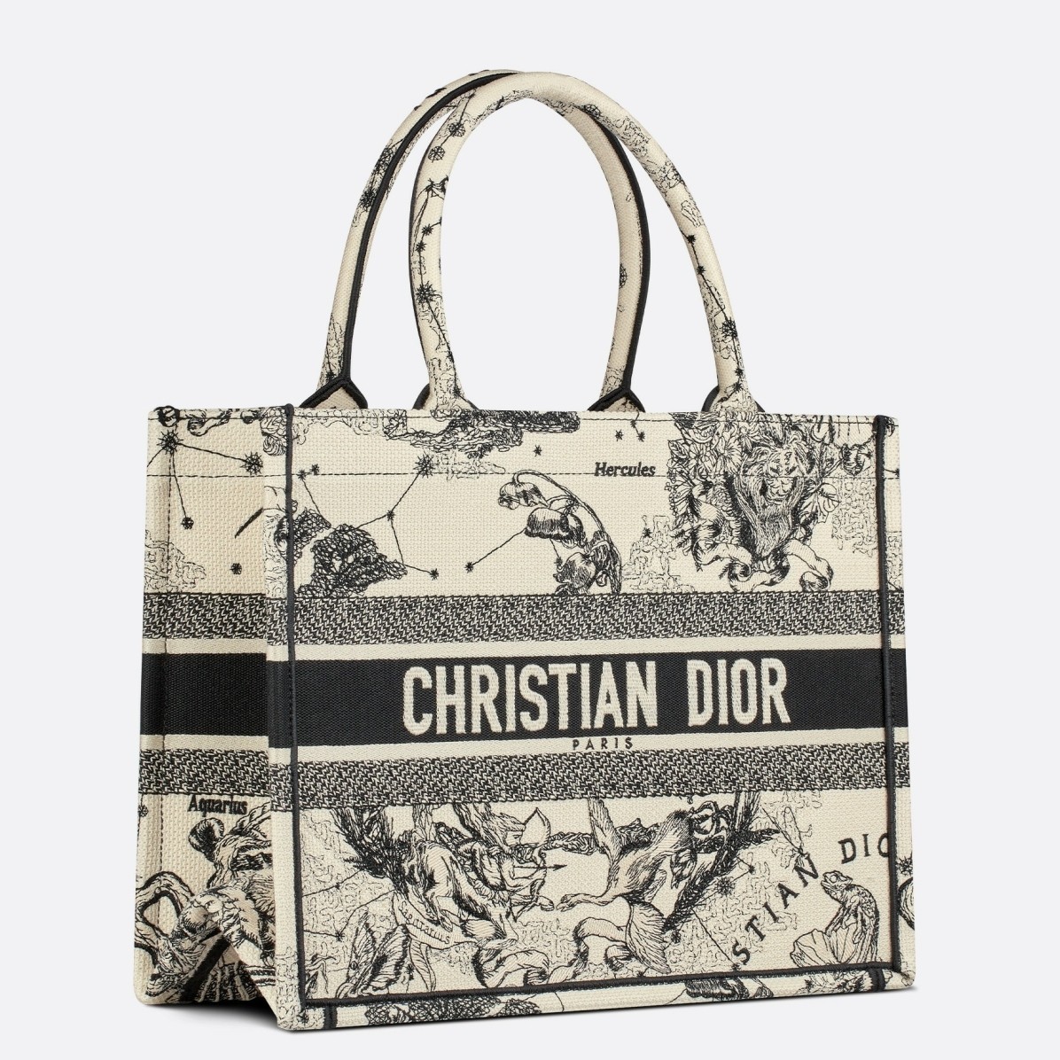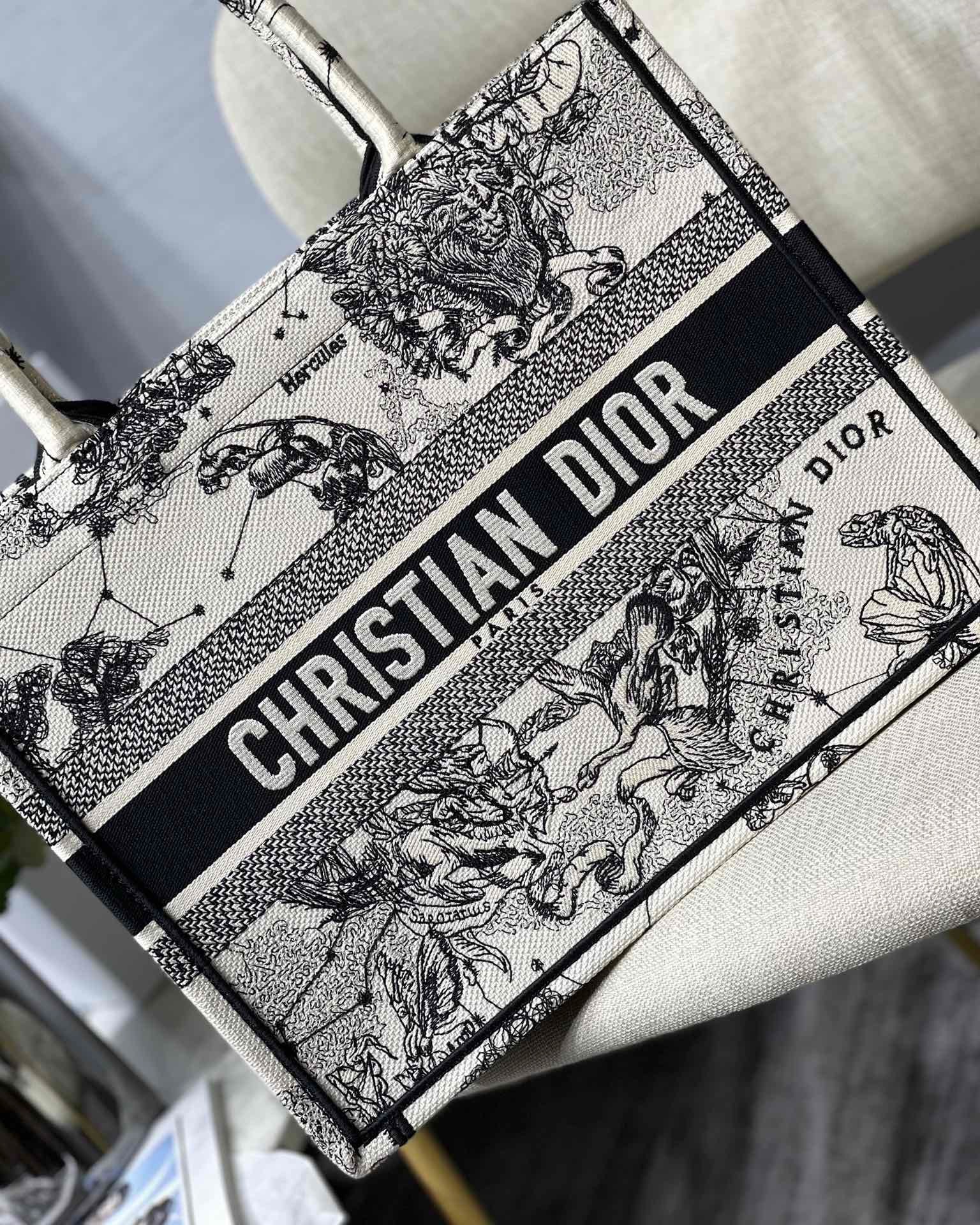 Introduced by Maria Grazia Chiuri, Creative Director of Christian Dior, the Dior Book Tote has become a staple of the Dior aesthetic. Designed to hold the daily essentials, the style is fully embroidered with a Toile de Jouy Zodiac motif, a variation of the House’s hallmark pattern that honors Mr. Dior’s passion for astrology. Adorned with the ‘CHRISTIAN DIOR PARIS’ signature on the front, the medium tote exemplifies the House’s signature savoir-faire and may be carried by hand or worn over the shoulder.