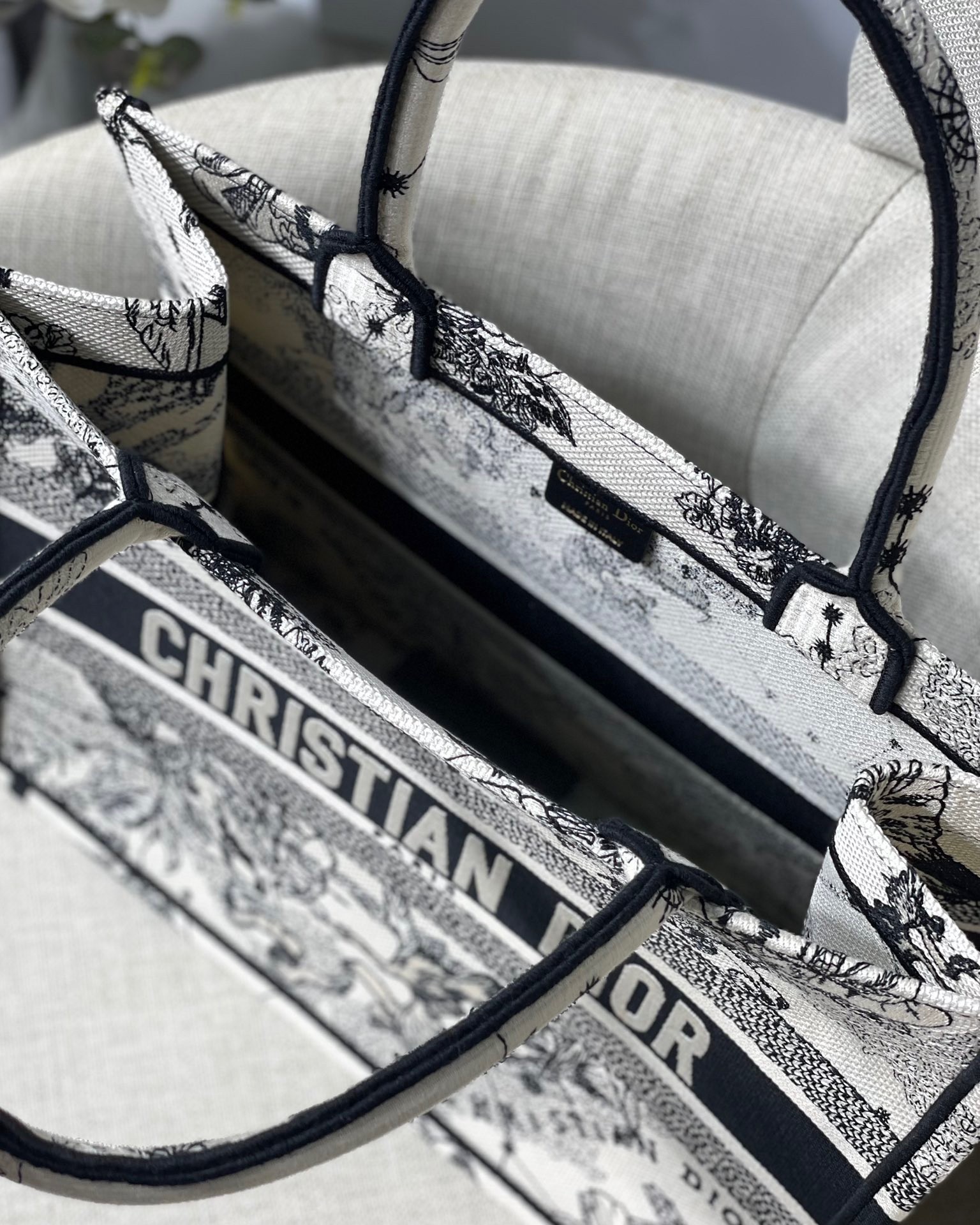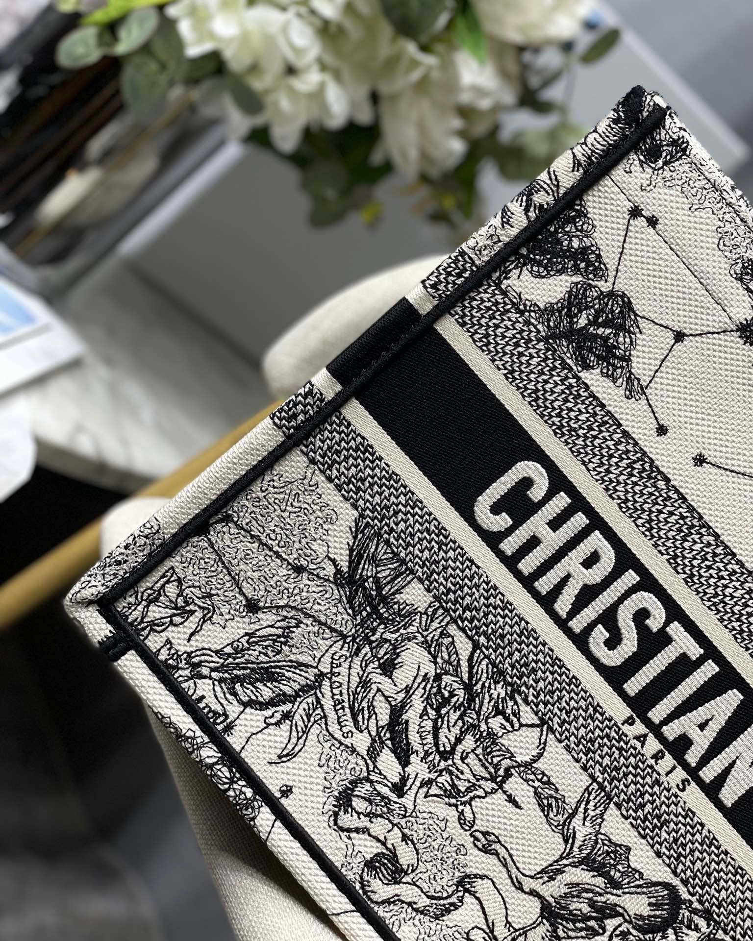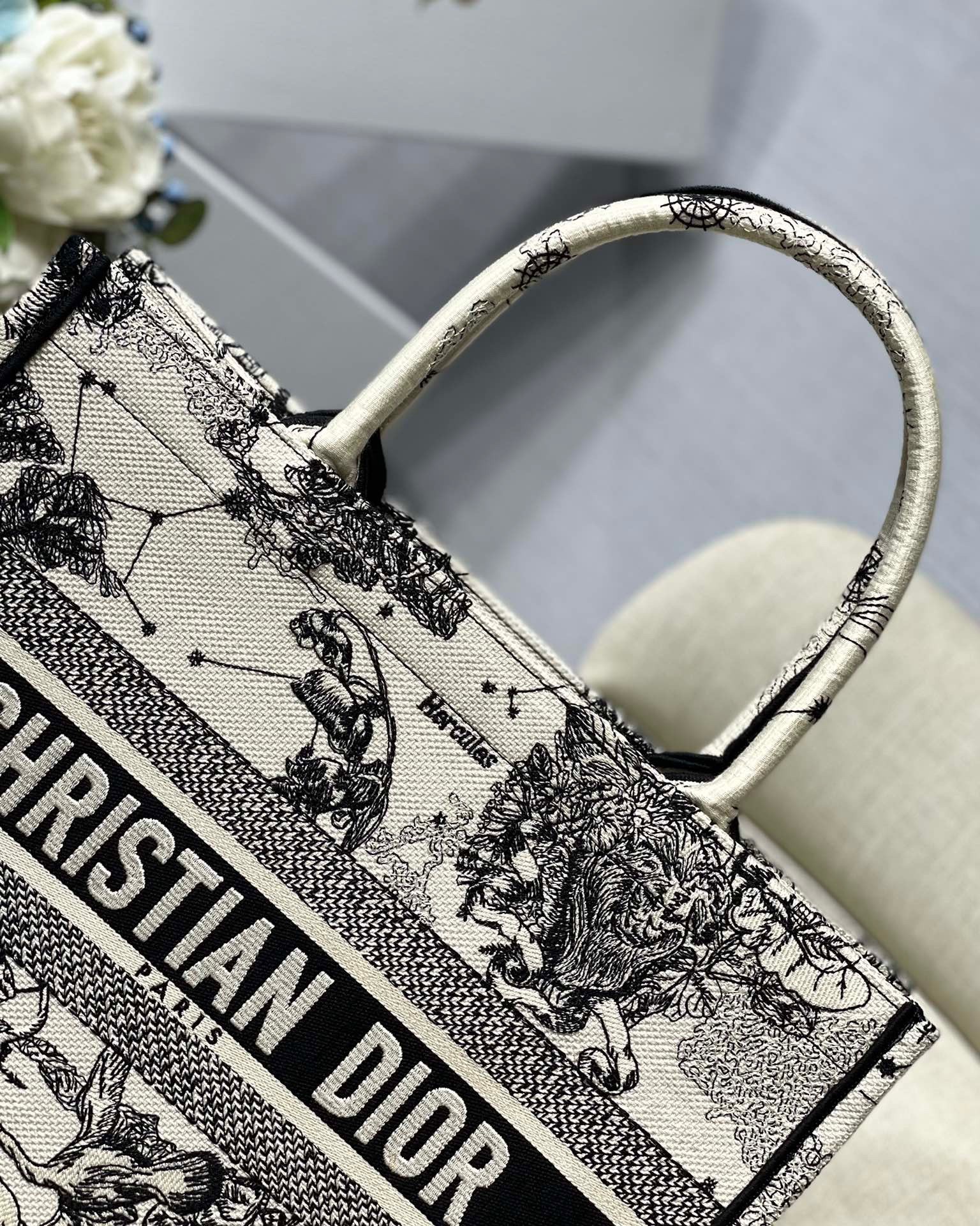 Introduced by Maria Grazia Chiuri, Creative Director of Christian Dior, the Dior Book Tote has become a staple of the Dior aesthetic. Designed to hold the daily essentials, the style is fully embroidered with a Toile de Jouy Zodiac motif, a variation of the House’s hallmark pattern that honors Mr. Dior’s passion for astrology. Adorned with the ‘CHRISTIAN DIOR PARIS’ signature on the front, the medium tote exemplifies the House’s signature savoir-faire and may be carried by hand or worn over the shoulder.