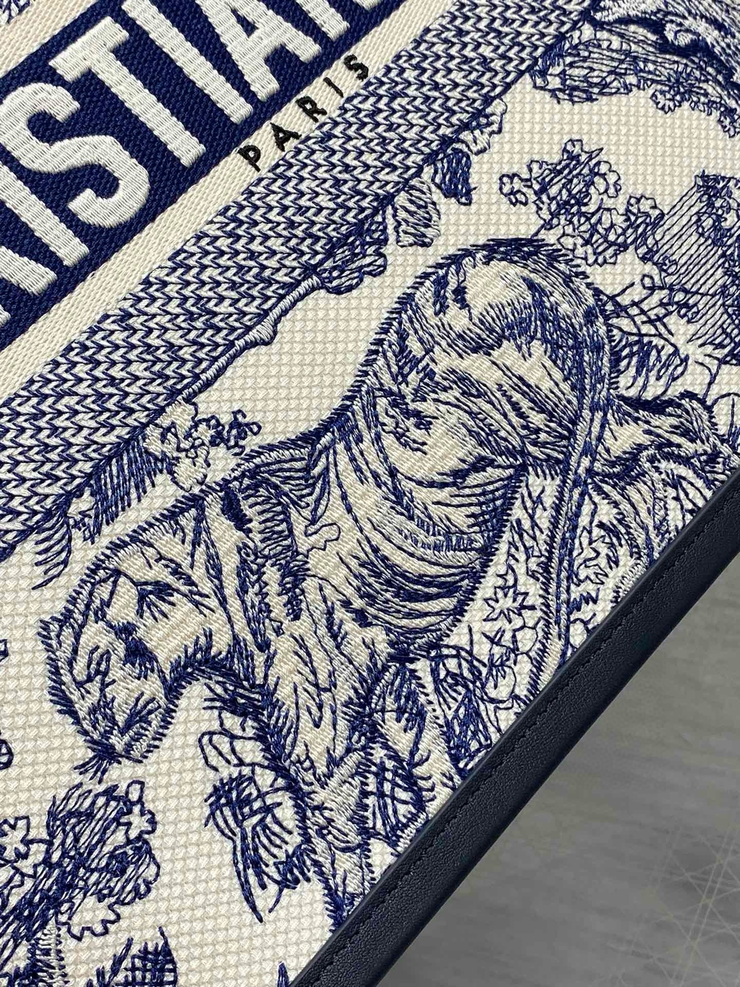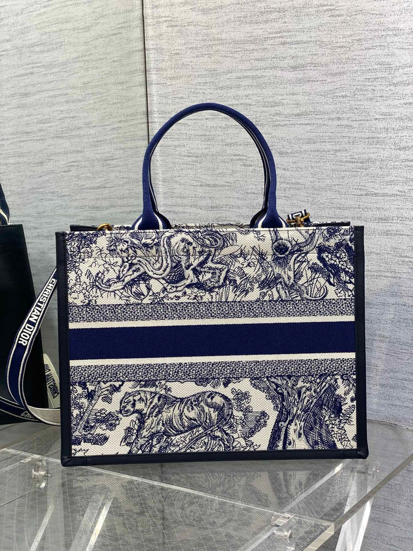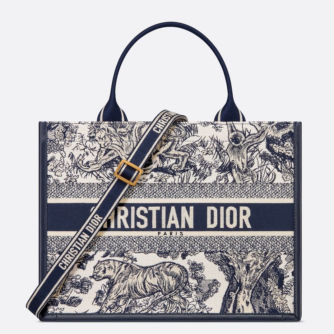Maria Grazia Chiuri’s hallmark Dior Book Tote offers an original take on elegance. The refined style showcases a fresh interpretation of the House’s iconic motif with the white and navy blue Toile de Jouy Sauvage embroidery and navy blue calfskin. Designed to keep all the daily essentials organized, the interior is equipped with a zip pocket and slip pockets. Featuring an adjustable and removable strap, the practical medium tote exemplifies Dior’s savoir-faire and can be carried by hand or worn over the shoulder.