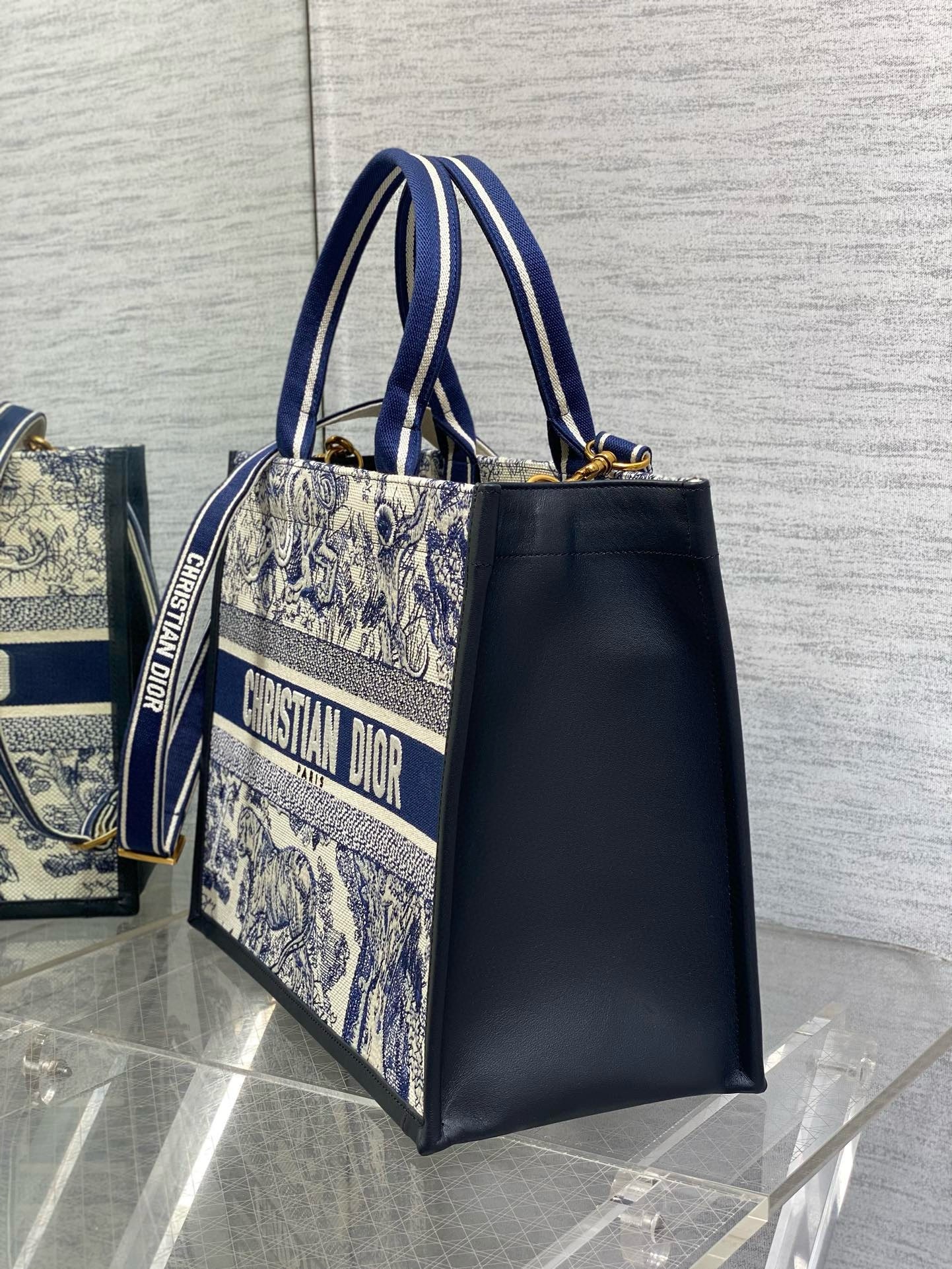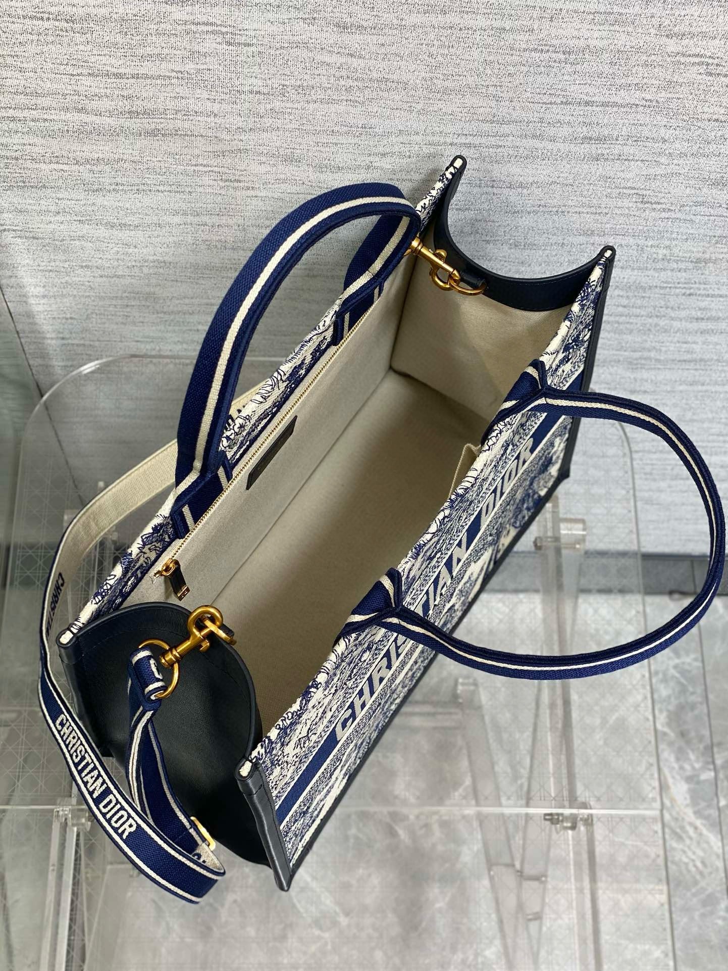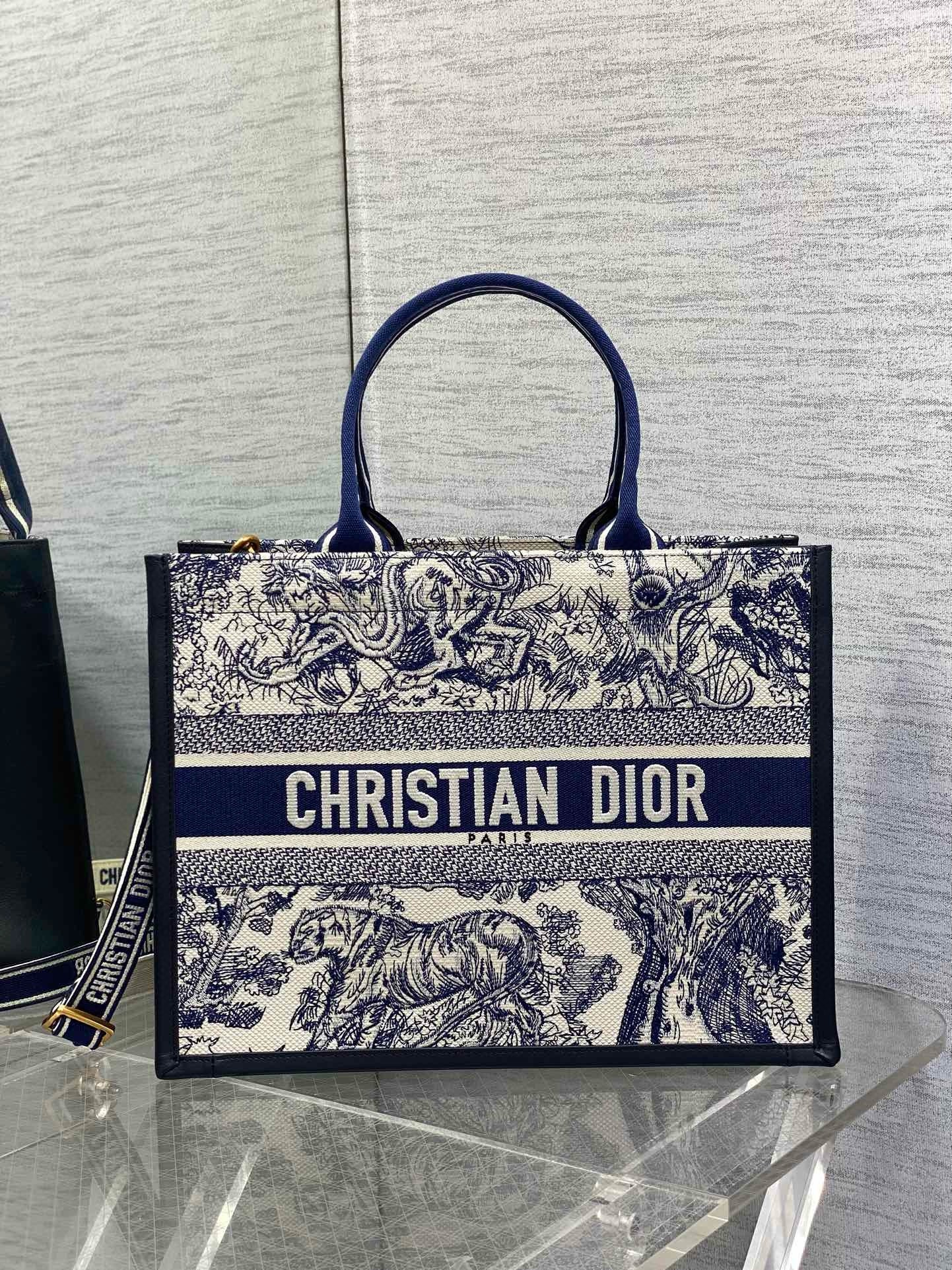 Maria Grazia Chiuri’s hallmark Dior Book Tote offers an original take on elegance. The refined style showcases a fresh interpretation of the House’s iconic motif with the white and navy blue Toile de Jouy Sauvage embroidery and navy blue calfskin. Designed to keep all the daily essentials organized, the interior is equipped with a zip pocket and slip pockets. Featuring an adjustable and removable strap, the practical medium tote exemplifies Dior’s savoir-faire and can be carried by hand or worn over the shoulder.