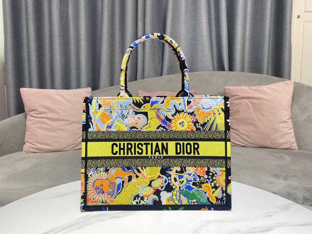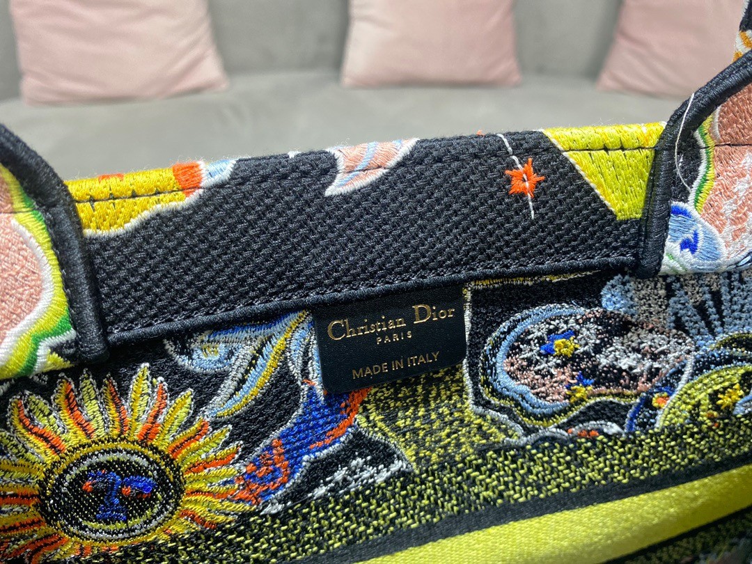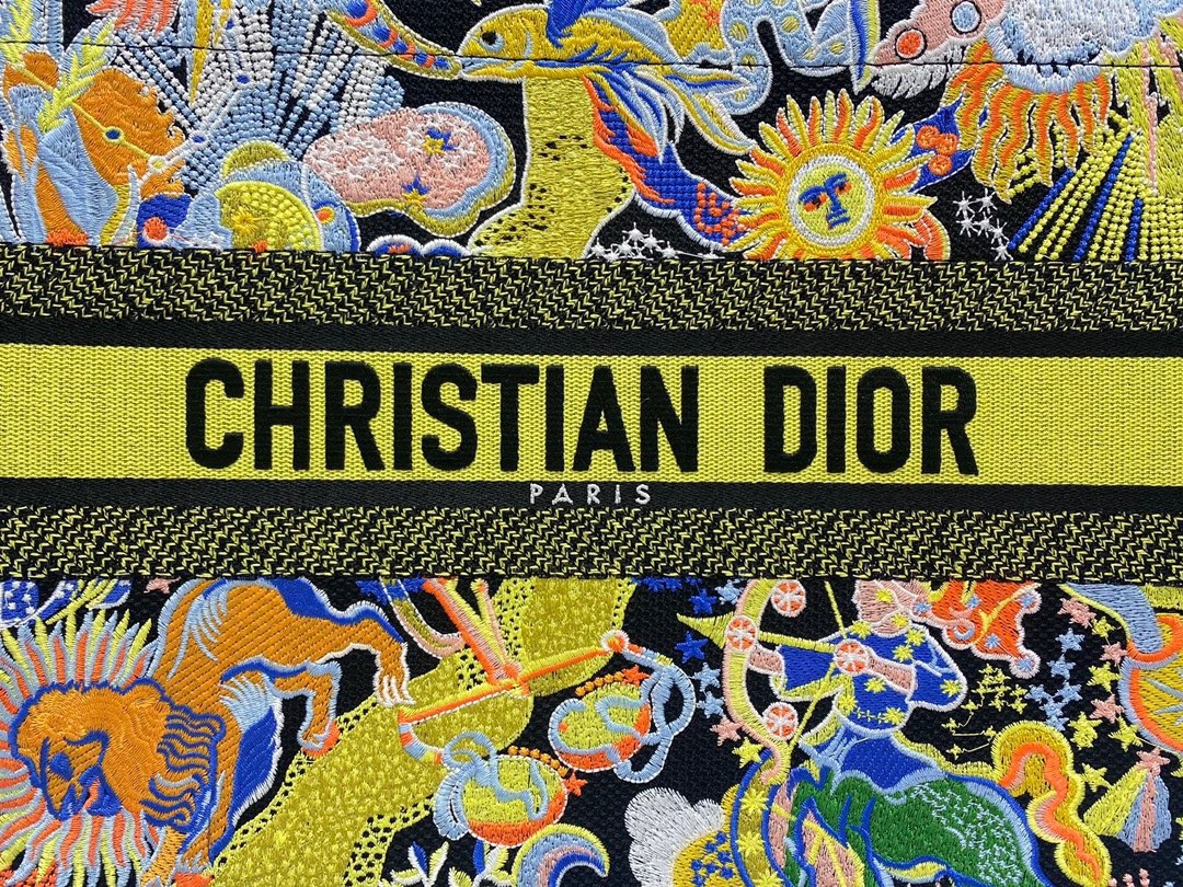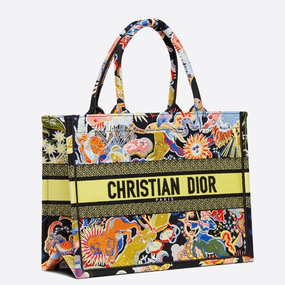 The Dior Book Tote is an original creation introduced by Maria Grazia Chiuri, Dior’s Creative Director, and has become a staple of the Dior aesthetic. Designed to hold the daily essentials, the style is fully embroidered with the black multicolor Dior Zodiac Fantastico motif by Pietro Ruffo, inspired by Mr. Dior’s fascination with astrology in a pastoral spirit. Adorned with the ‘CHRISTIAN DIOR PARIS’ signature on the front, the medium tote exemplifies the House’s signature savoir-faire and may be carried by hand or worn over the shoulder.