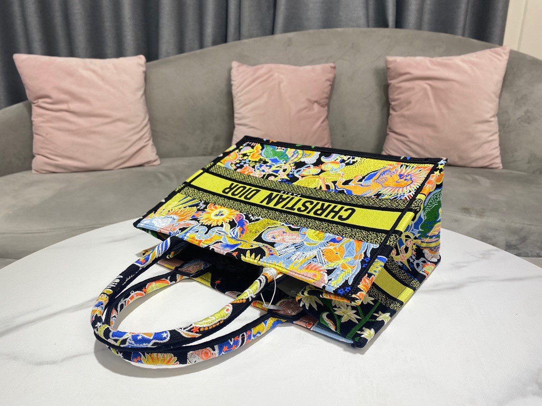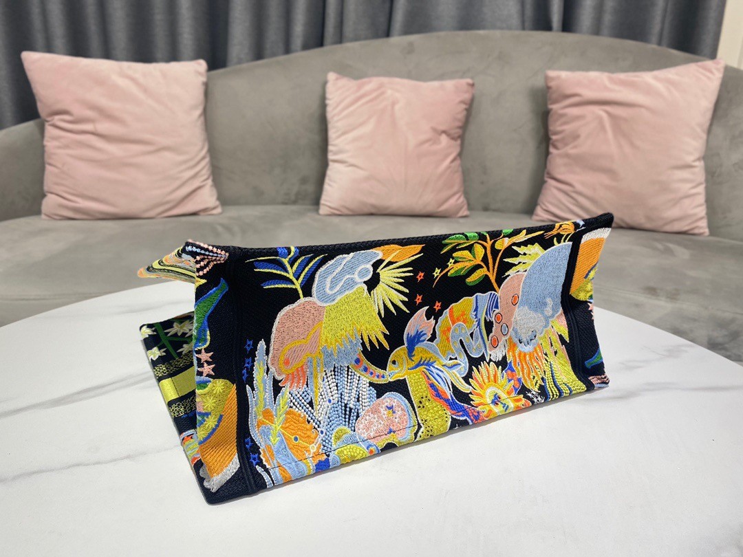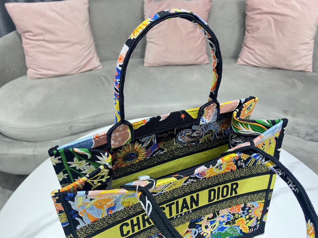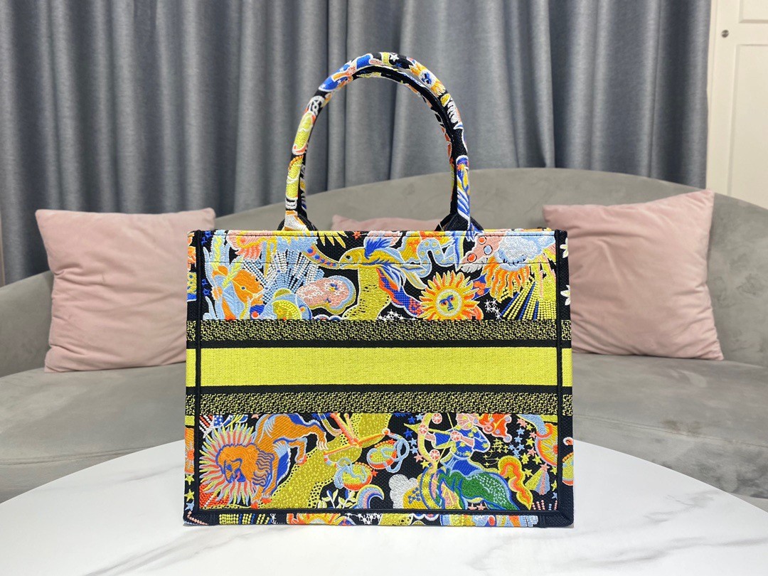 The Dior Book Tote is an original creation introduced by Maria Grazia Chiuri, Dior’s Creative Director, and has become a staple of the Dior aesthetic. Designed to hold the daily essentials, the style is fully embroidered with the black multicolor Dior Zodiac Fantastico motif by Pietro Ruffo, inspired by Mr. Dior’s fascination with astrology in a pastoral spirit. Adorned with the ‘CHRISTIAN DIOR PARIS’ signature on the front, the medium tote exemplifies the House’s signature savoir-faire and may be carried by hand or worn over the shoulder.