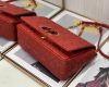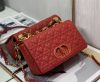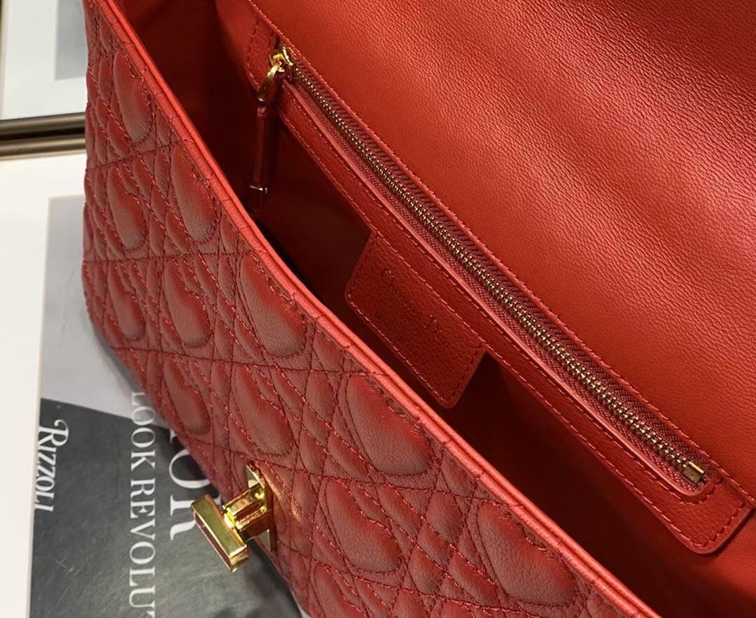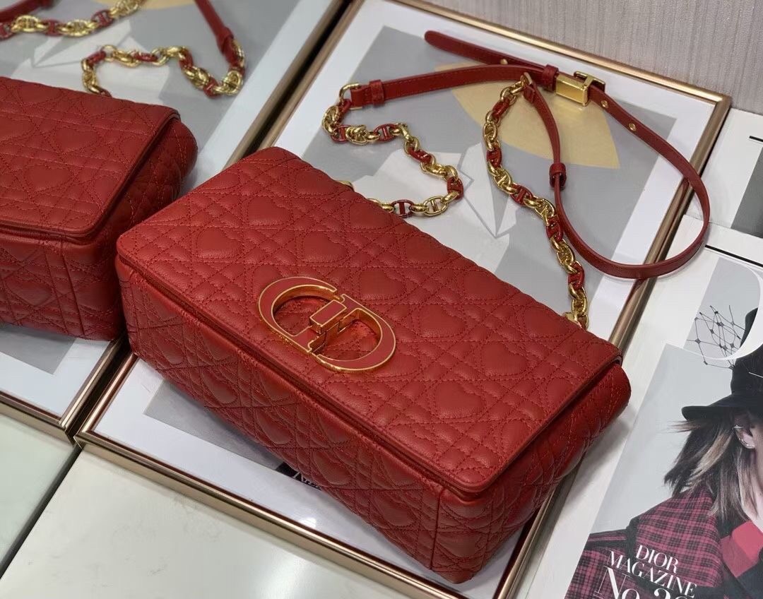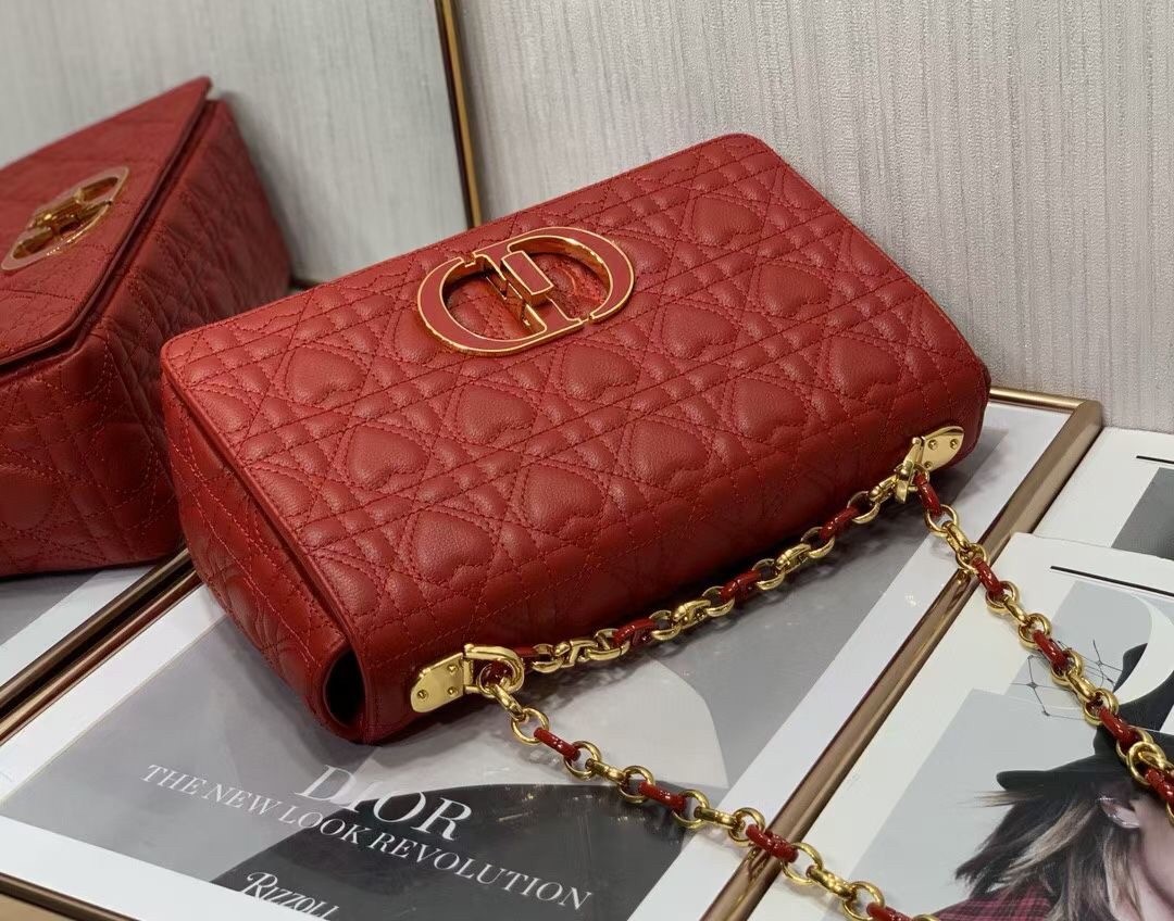 The Dior Caro bag, part of the Dioramour capsule, combines modernity with timeless elegance. The design is crafted in bright red calfskin with Cannage stitching and is embellished with a heart motif. The bag features a flap adorned with an enamel ‘CD’ twist clasp, inspired by the seal of a Christian Dior perfume bottle. The detachable chain shoulder strap, with ‘CD’ signature links, boasts a blend of finishing touches and allows the medium shape to be carried by hand, worn over the shoulder or crossbody, or replaced by one of the House’s wide embroidered straps. The bag may pair with day or evening attire.