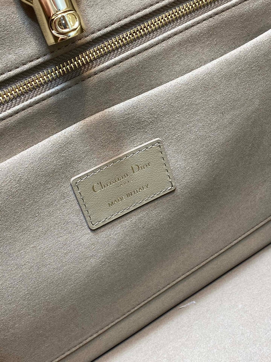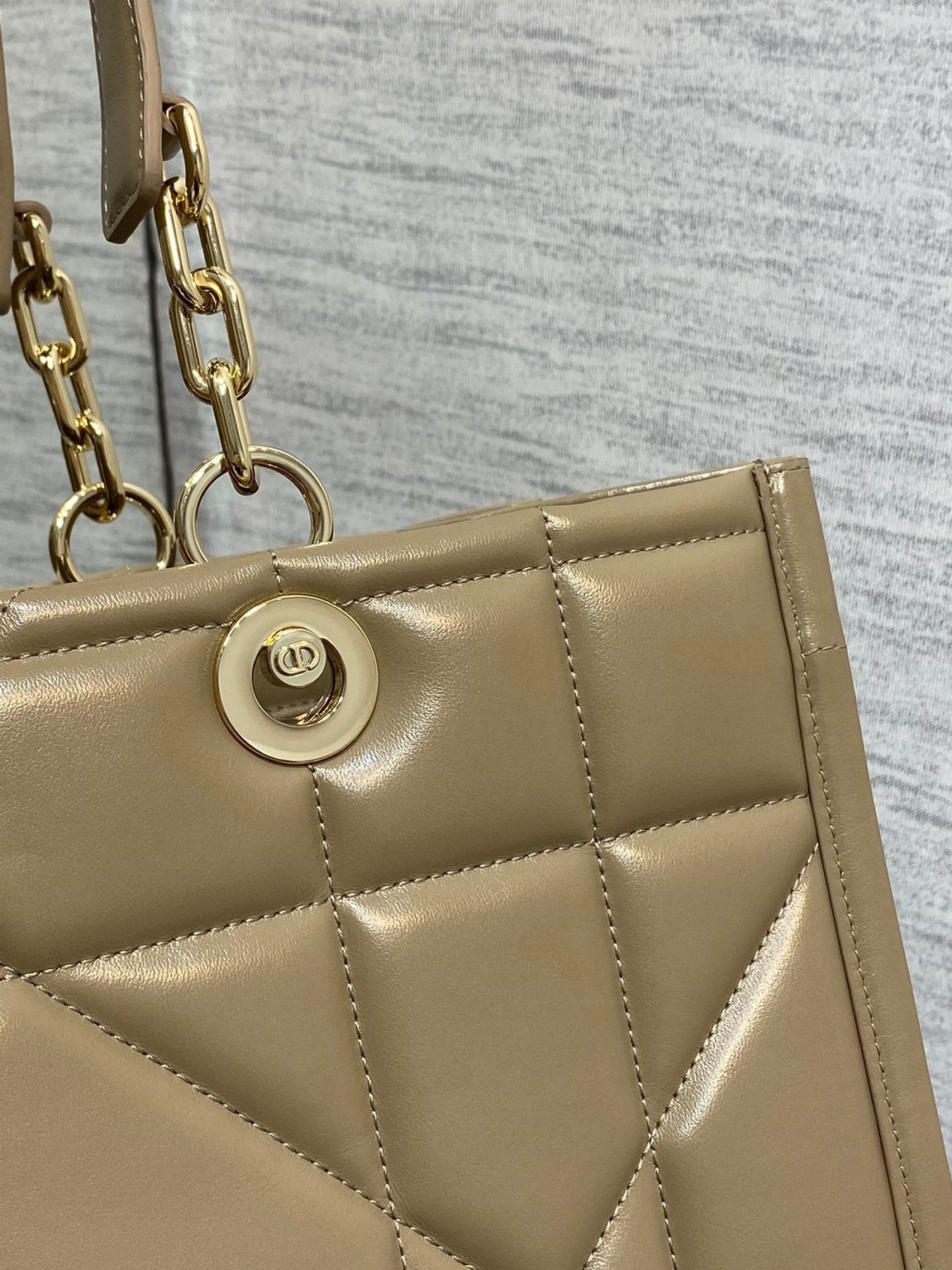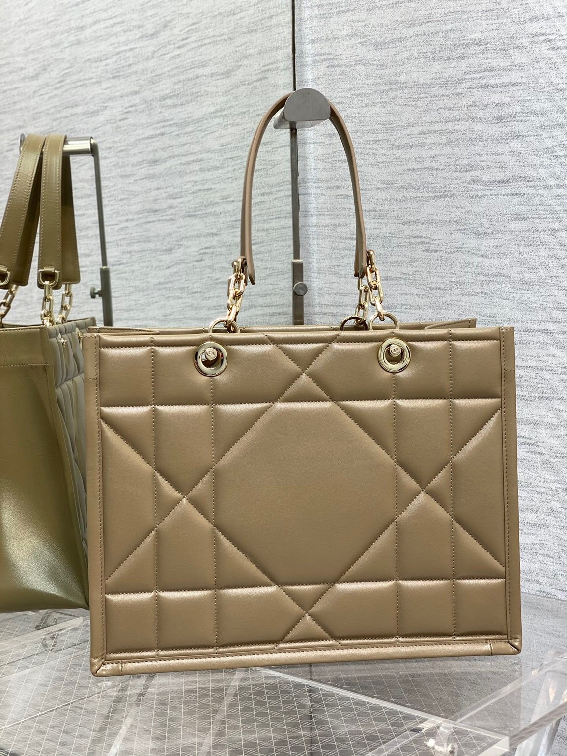 A new House staple debuted at the Fall-Winter 2022-2023 ready-to-wear fashion show, the Dior Essential tote bag presents a functional design with modern elegance. Crafted in satin-finish calfskin, it is adorned with the Archicannage motif, offering a new take on the iconic House topstitching. The spacious interior features four patch pockets and one zipped pocket to accommodate all of the essentials. Featuring leather and pale gold-finish metal chain top handles, the medium tote may be worn over the shoulder or carried by hand as an ideal daily companion.
