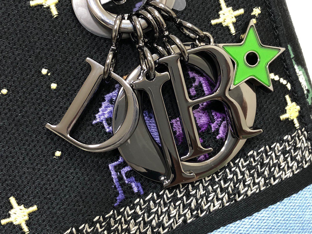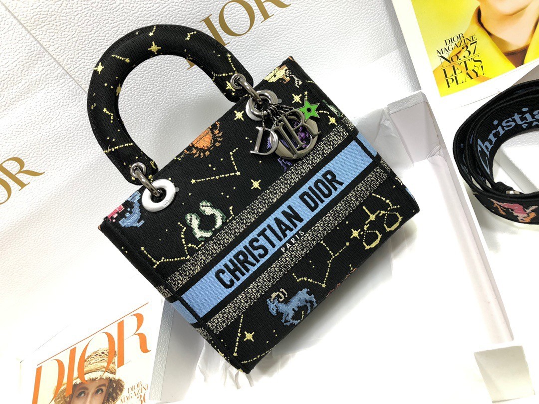 The Lady D-Lite bag combines classic elegance with House modernity. Fully embroidered with the black multicolor Dior Pixel Zodiac motif, the style offers an imaginative and colorful new take on astrological signs. A ‘CHRISTIAN DIOR PARIS’ signature adorns the front, while ruthenium-finish metal ‘D.I.O.R.’ charms enhance and illuminate the silhouette. Featuring a wide, reversible and removable embroidered shoulder strap, the medium Lady D-Lite bag can be carried by hand or worn crossbody.