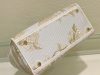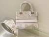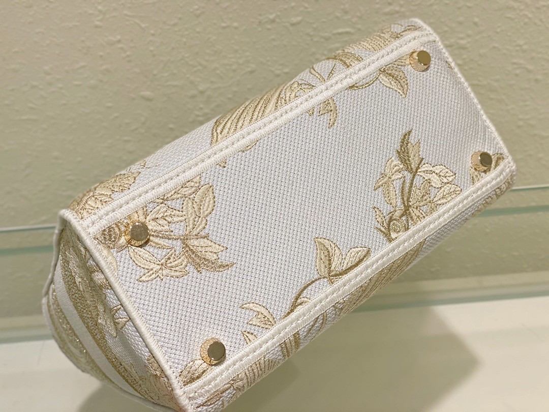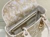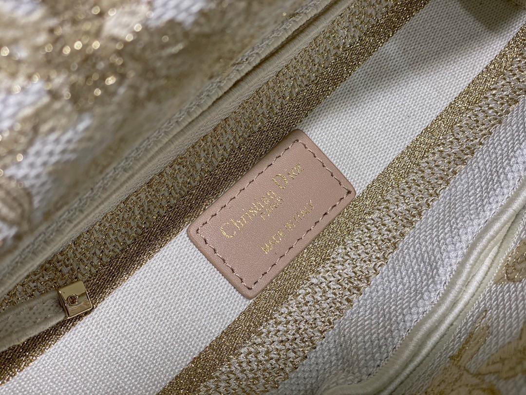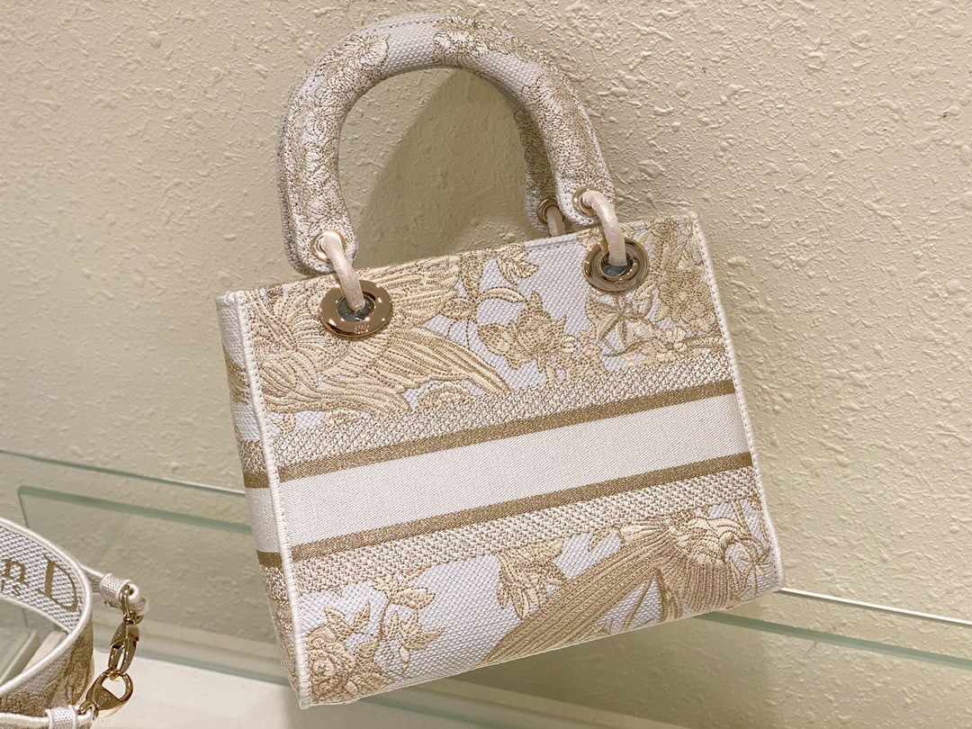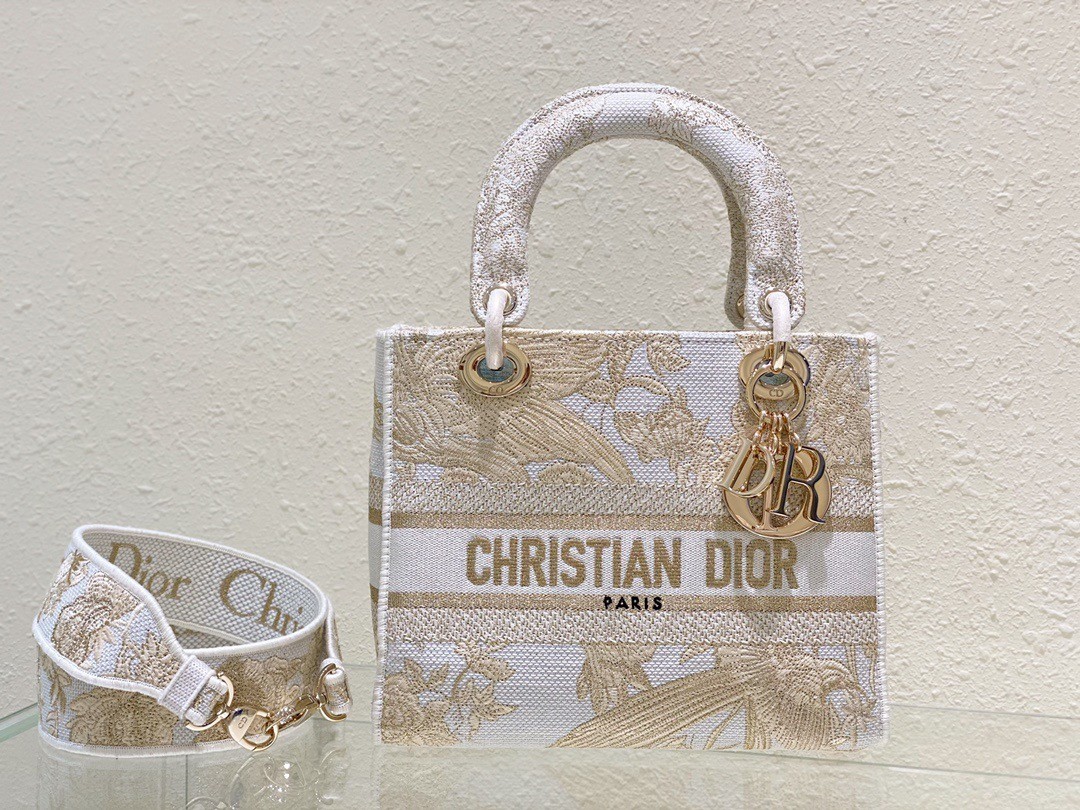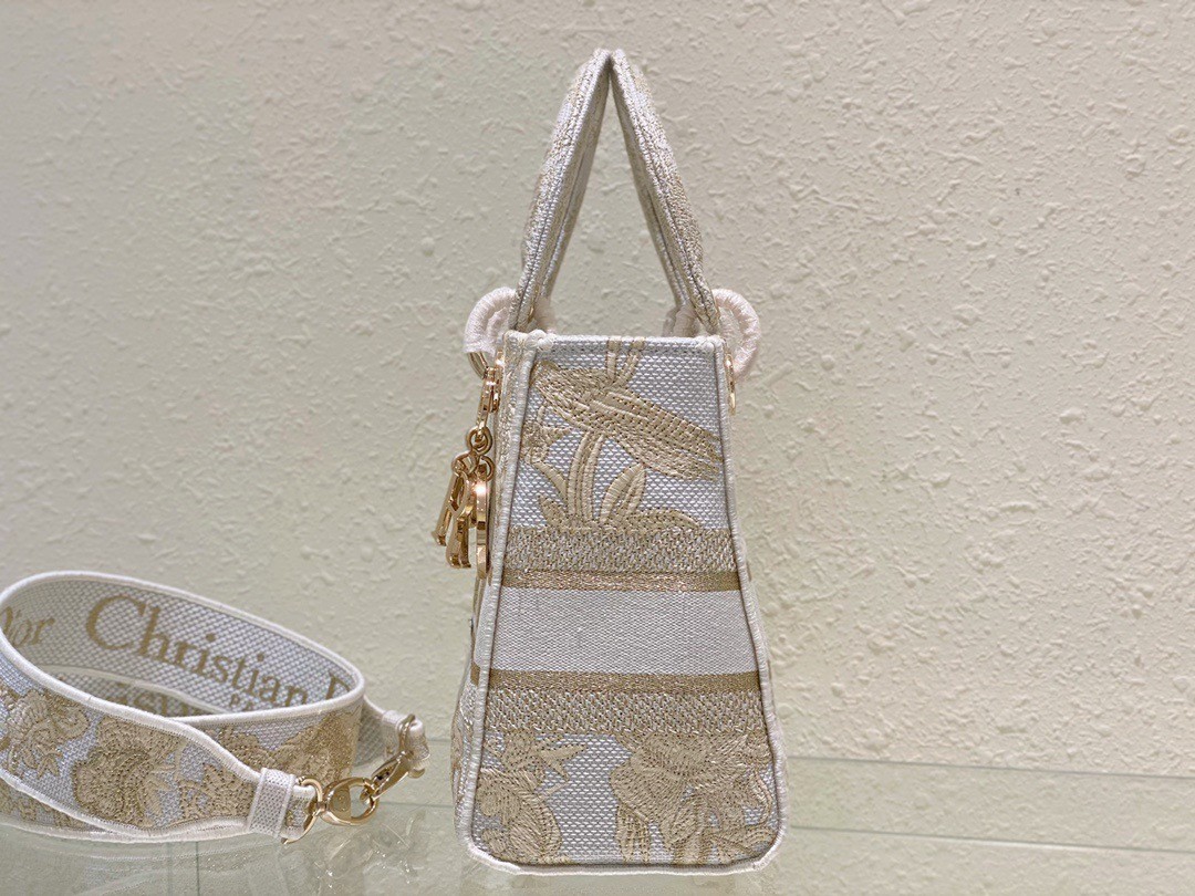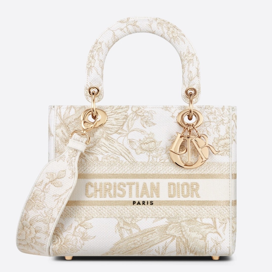 The Lady D-Lite bag combines classic elegance with House modernity. Fully embroidered with a Dior Jardin d’Hiver motif in gold-tone metallic thread, the creation offers a poetic and exotic interpretation of Mr. Dior’s wall tapestries. The front features a ‘CHRISTIAN DIOR PARIS’ signature while ‘D.I.O.R.’ charms in pale gold-finish metal further enhance the silhouette. Equipped with a wide, reversible and removable embroidered shoulder strap, the medium Lady D-Lite bag can be carried by hand or worn crossbody.