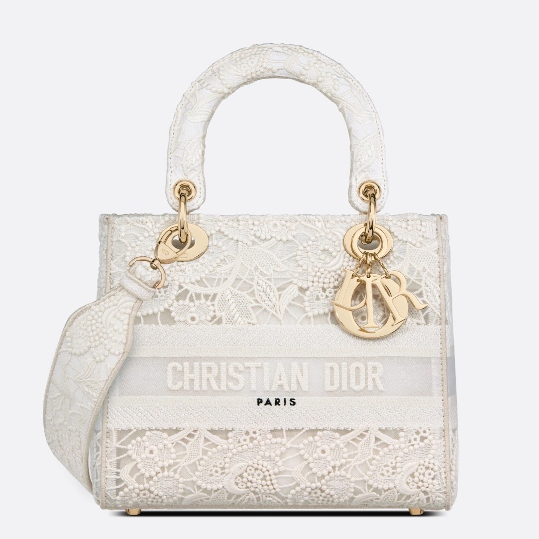 The Lady D-Lite bag combines classic elegance with House modernity. A true demonstration of Dior’s savoir-faire, the exceptional style is entirely embroidered with a natural-colored macram?? effect, the essence of true elegance. The ‘CHRISTIAN DIOR PARIS’ signature adorns the front, while ‘D.I.O.R.’ charms in pale gold-finish metal further enhance the silhouette. Equipped with a wide, reversible and removable embroidered shoulder strap, the medium Lady D-Lite bag can be carried by hand or worn crossbody.