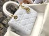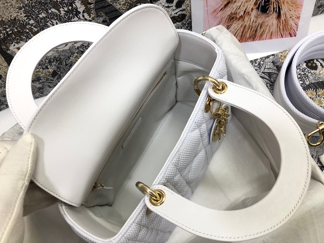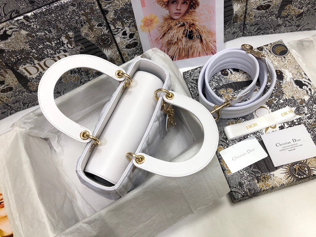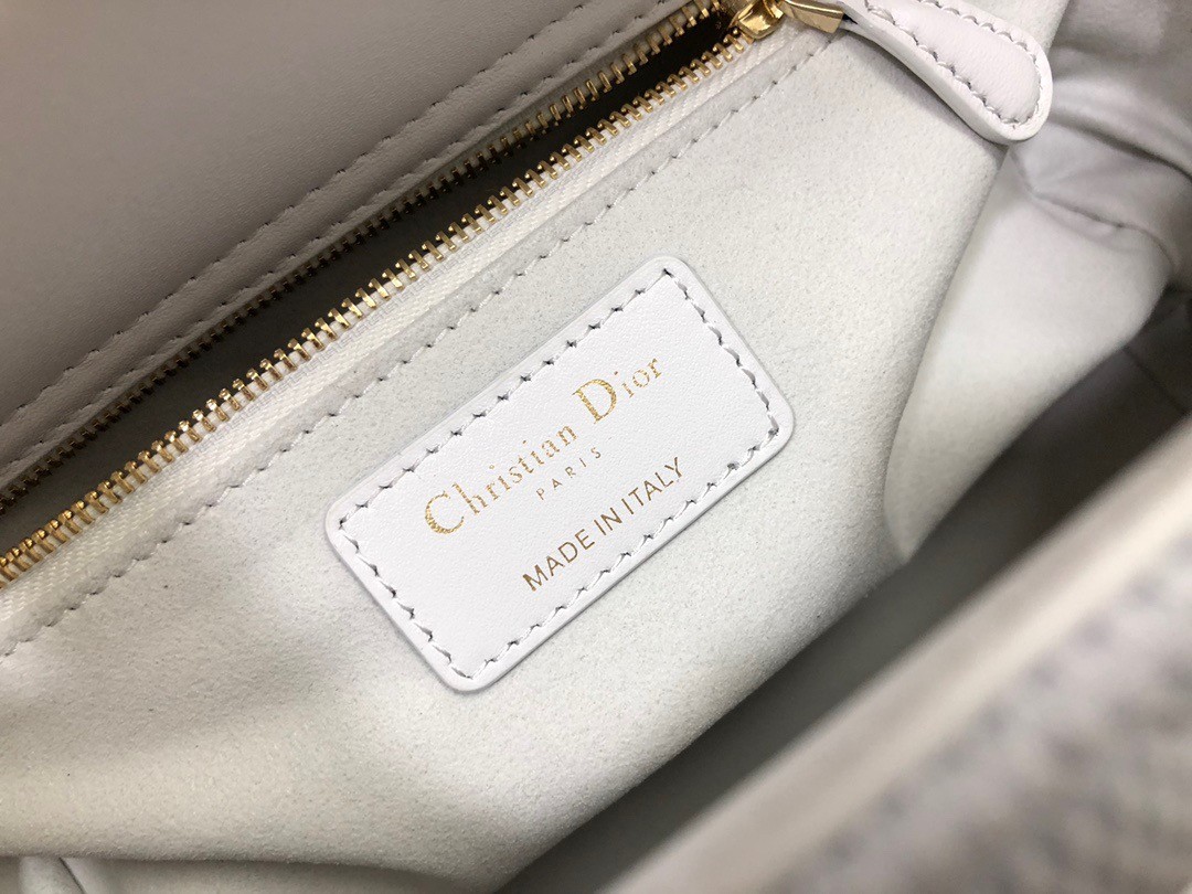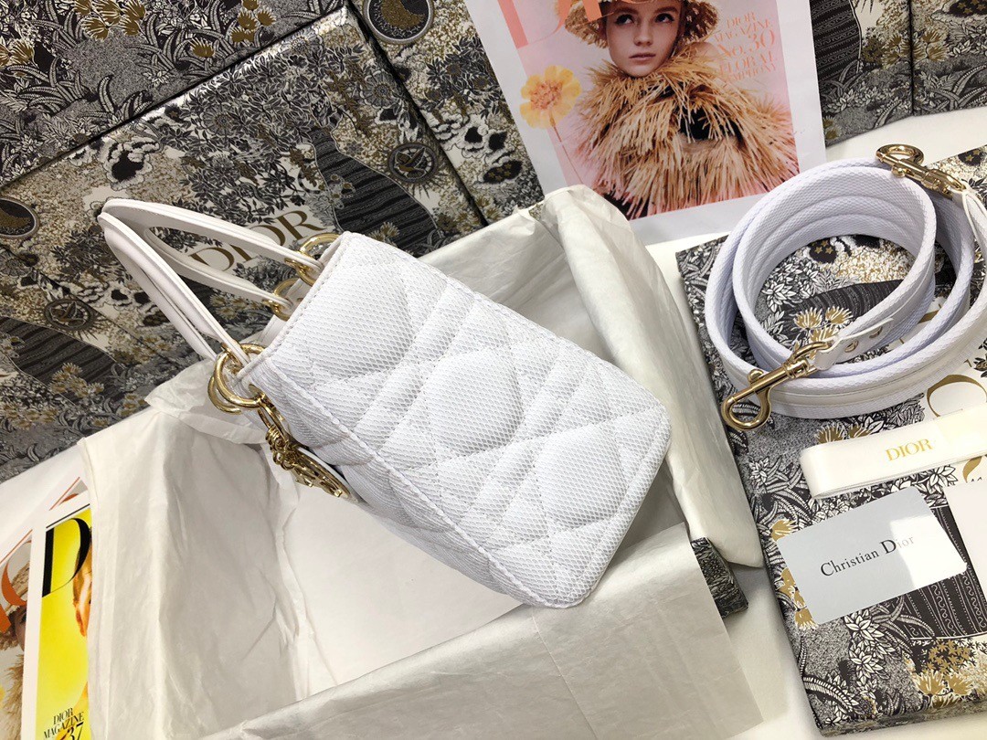 The Lady D-Lite bag combines classic elegance with House modernity. The design is crafted in white technical fabric and embellished with a Macrocannage motif. Tonal enamel ‘D.I.O.R.’ charms enhance the refined shape with elegant allure. Equipped with a wide, removable technical fabric shoulder strap with leather detailing, the medium Lady D-Lite bag can be carried by hand or worn crossbody.