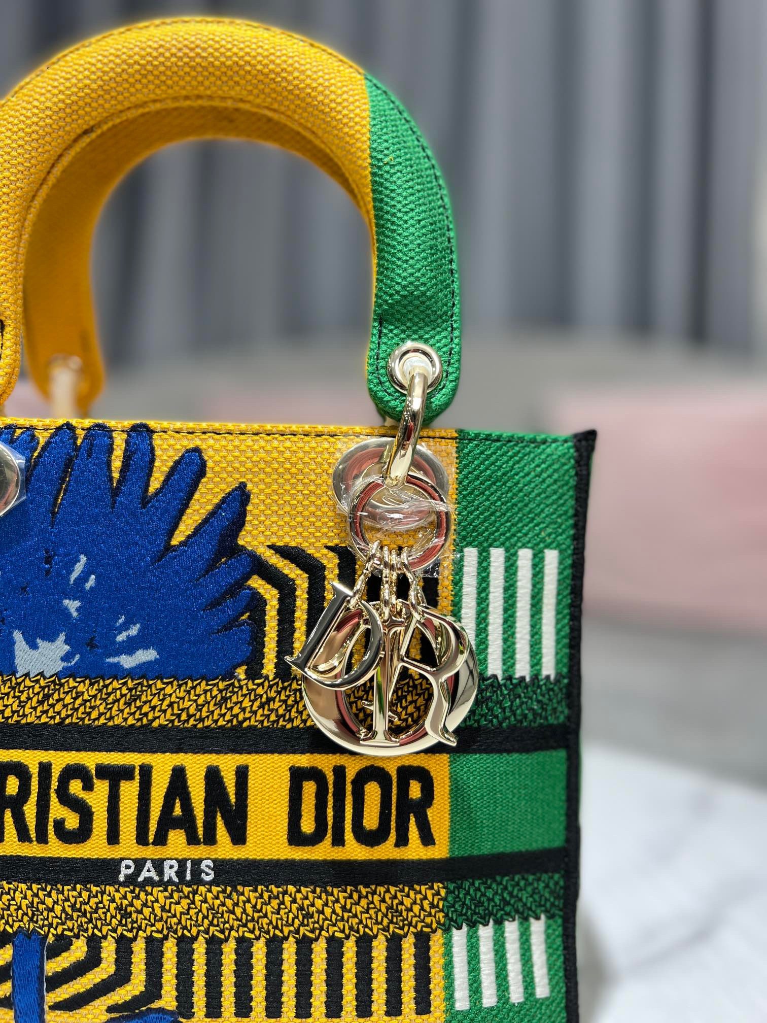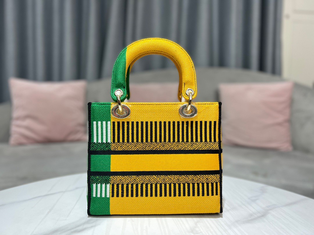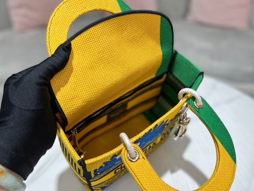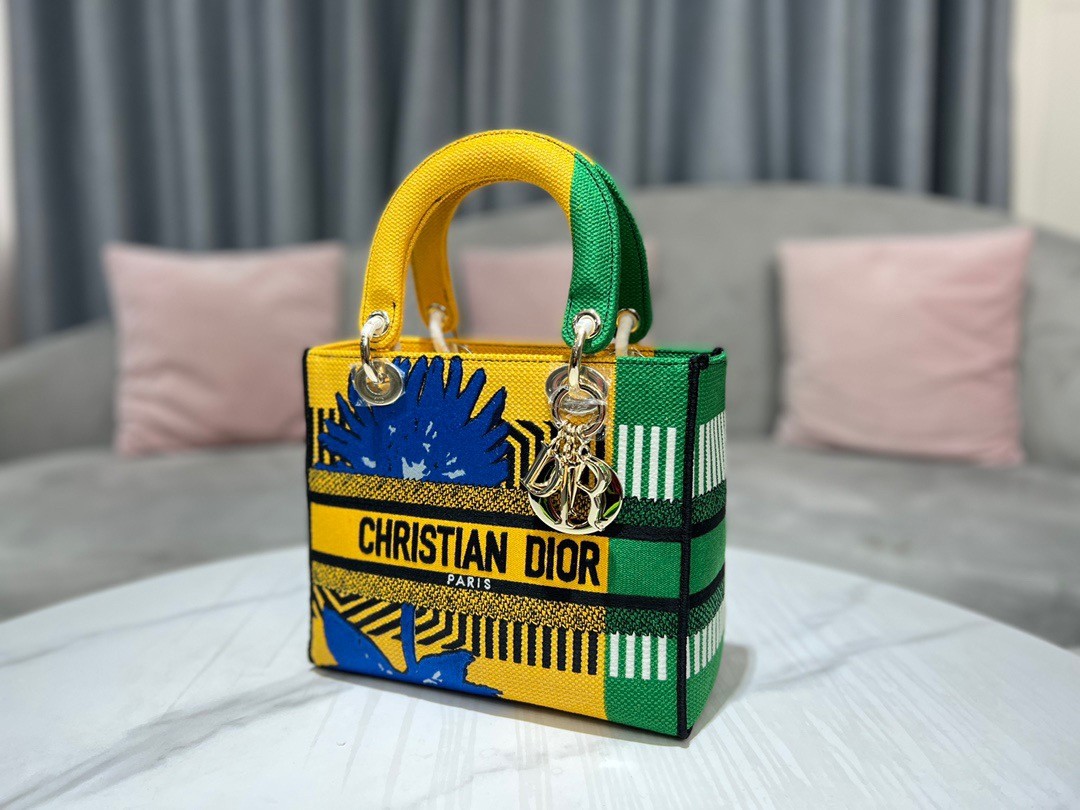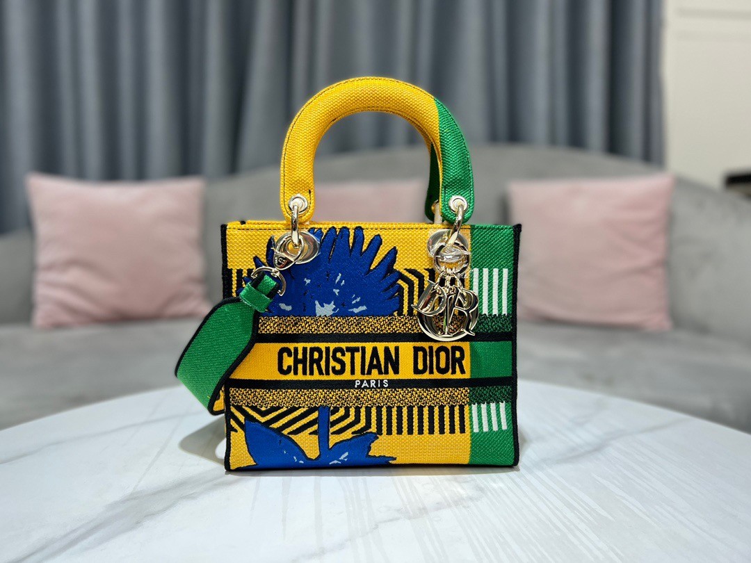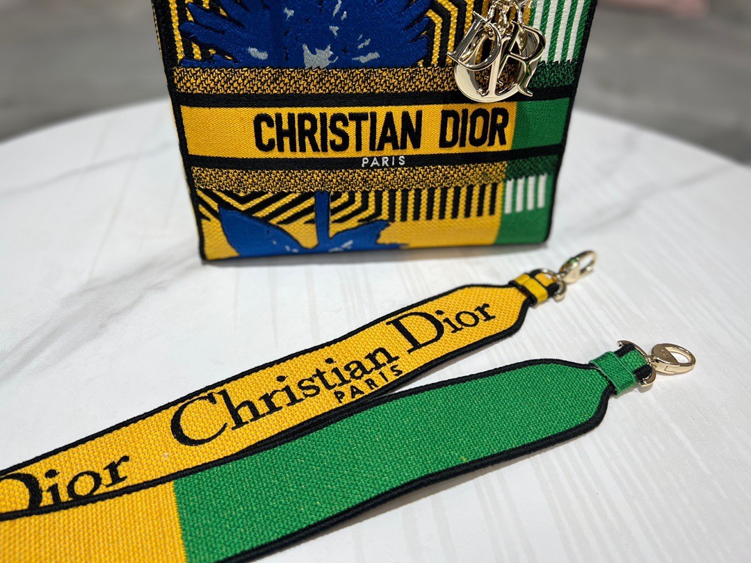 The Lady D-Lite bag combines classic elegance with House modernity. The style is fully embroidered with the bright yellow and green D-Flower Pop motif that embodies the collection’s colorful universe. A ‘CHRISTIAN DIOR PARIS’ signature adorns the front, while thick ‘D.I.O.R.’ charms in pale gold-finish metal further enhance and highlight the silhouette. Featuring a wide, reversible and removable embroidered shoulder strap, the medium Lady D-Lite bag can be carried by hand or worn crossbody.