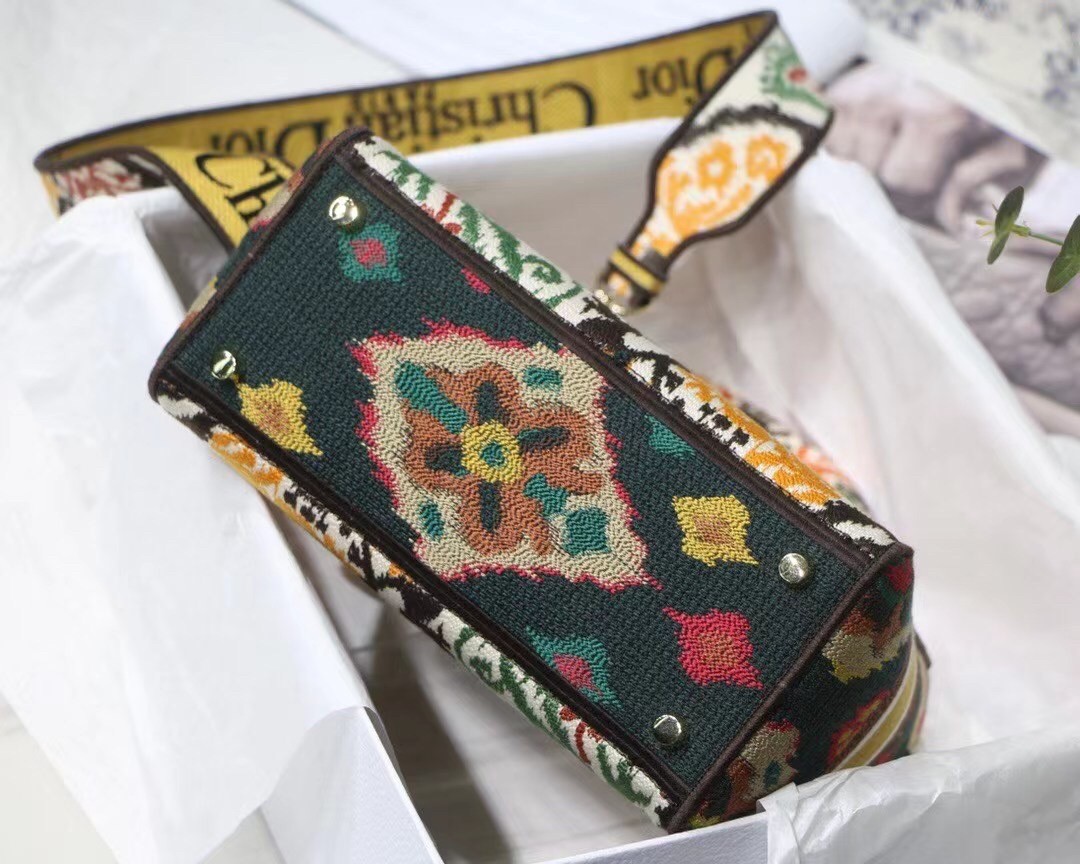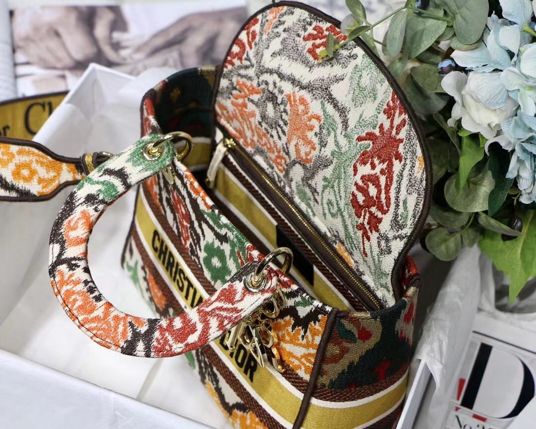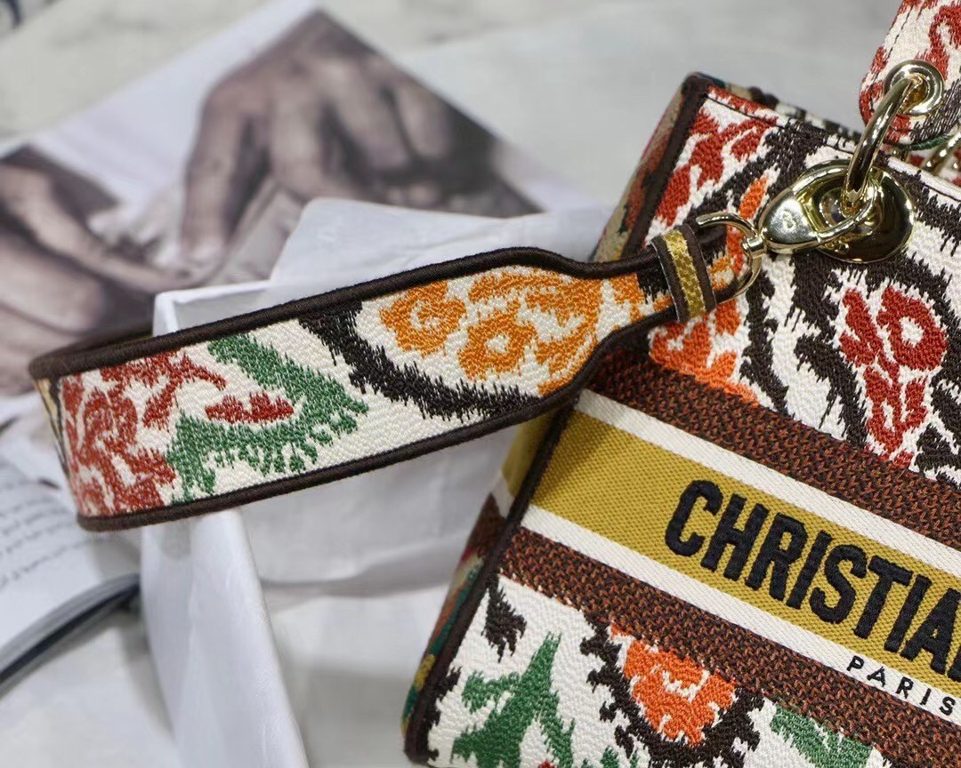 The Lady D-Lite bag combines classic elegance with House modernity. The style is fully embroidered with the multicolor Dior Paisley motif while the sides are adorned with a tonal and graphic motif, lending a contrasting modern touch. The front features a ‘Christian Dior’ signature and thick ‘D.I.O.R.’ charms in pale gold-finish metal embellish the silhouette. Equipped with a wide, reversible, and removable embroidered shoulder strap, the medium Lady D-Lite bag can be carried by hand, worn over the shoulder or crossbody.